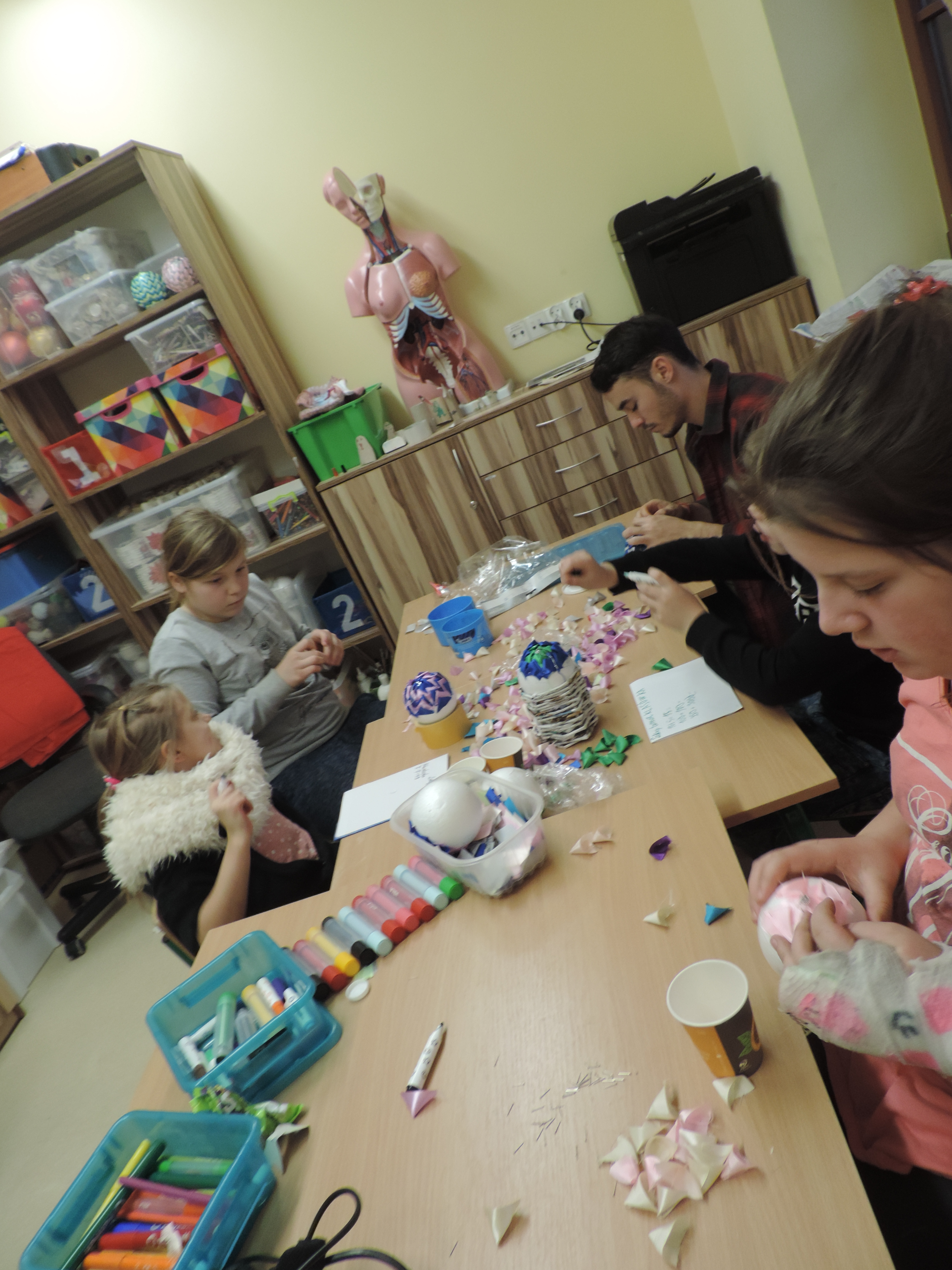 U nas praca nadal wre! Tym razem przygotowujemy bombki z kolorowych wstążek. Zajęcie bardzo pracochłonne, ale efekt cieszy oczy i mobilizuje do podjęcia wyzwania. Ciężko pracujemy i z zaangażowaniem przygotowujemy się do nadchodzących świąt.