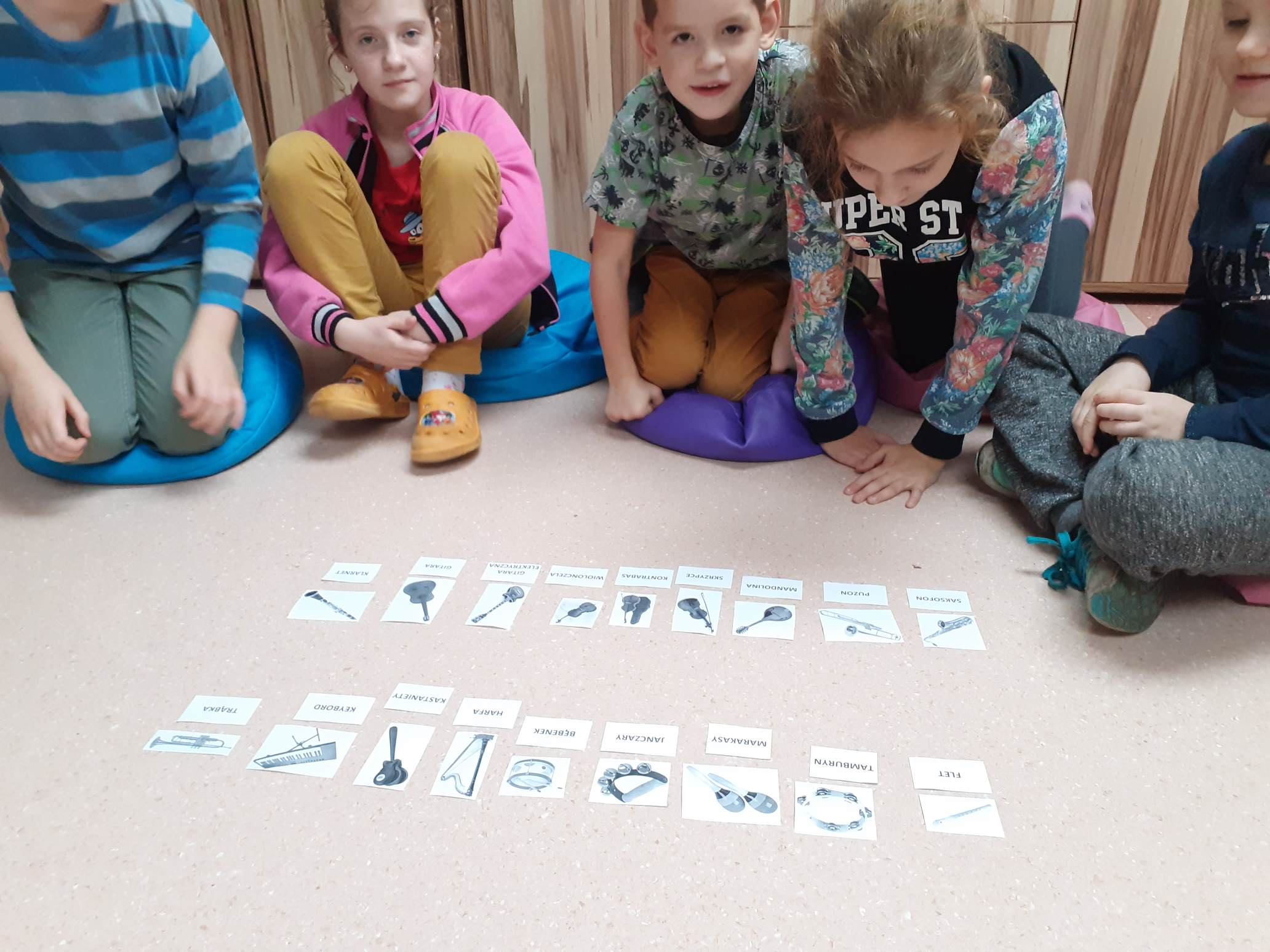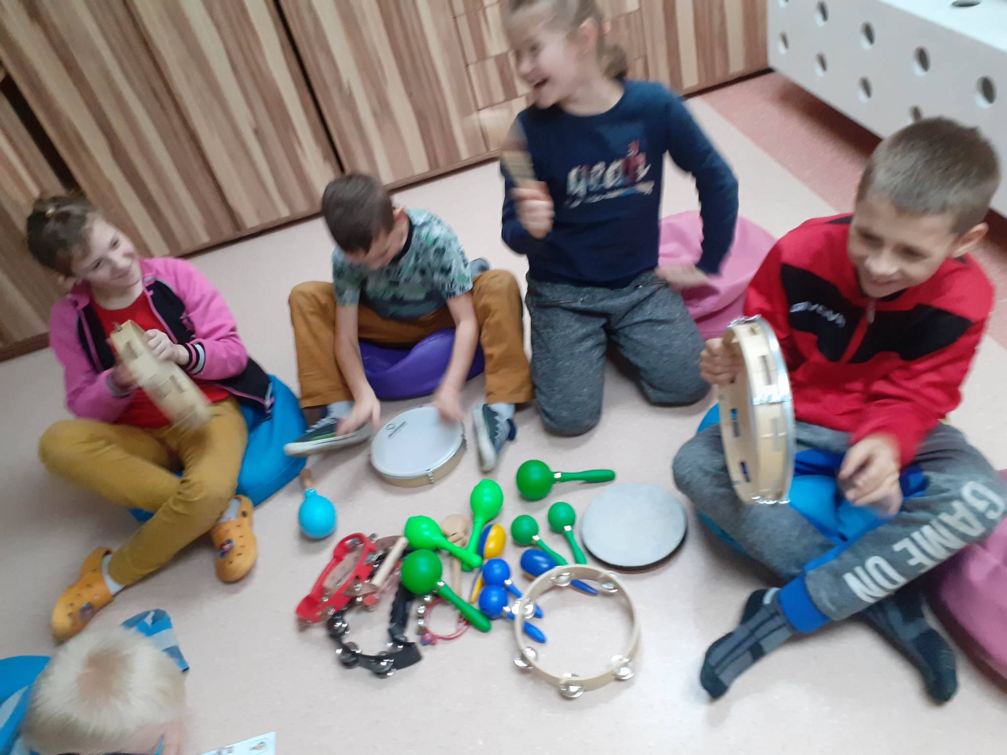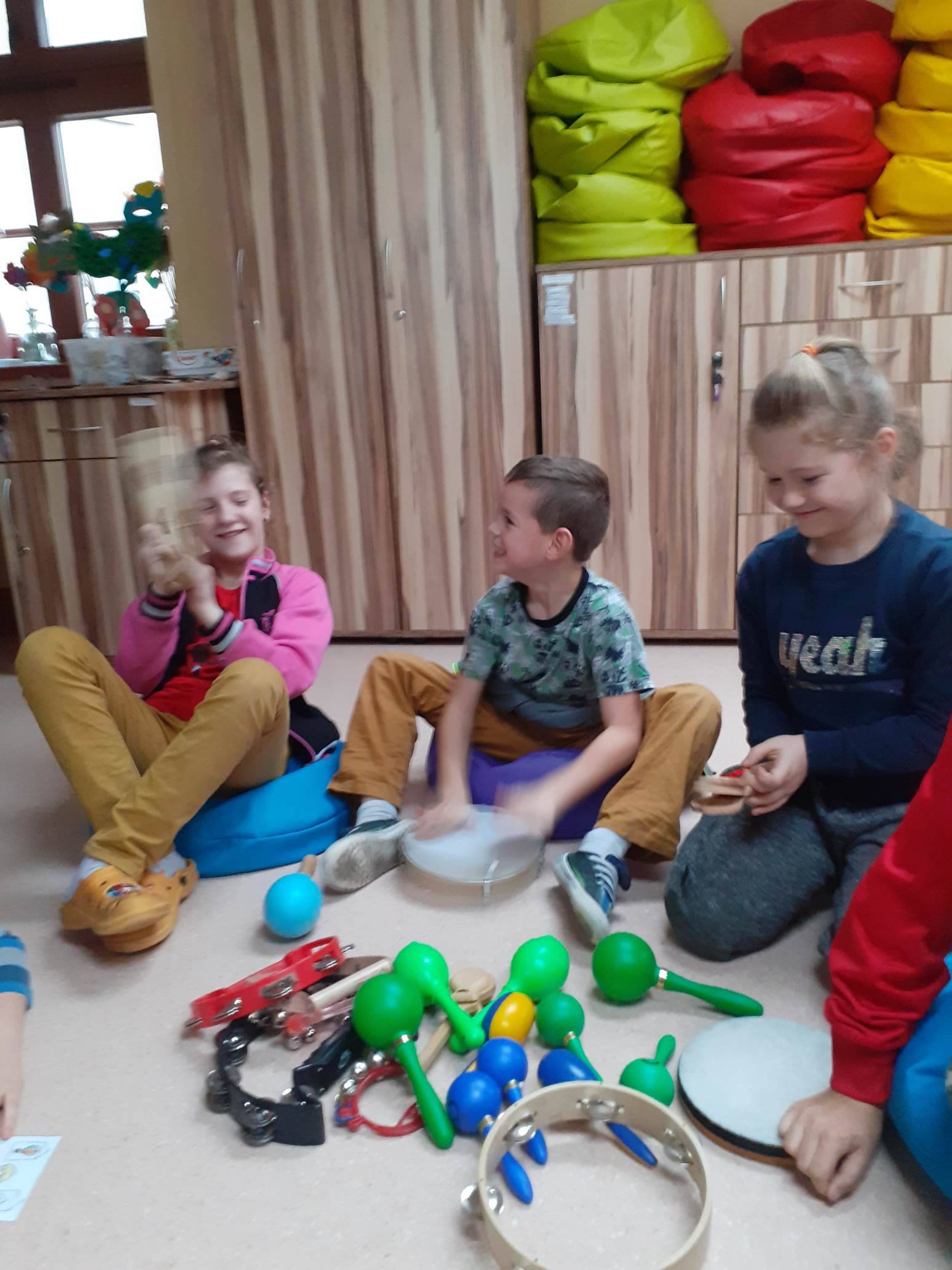 To były ciekawe zajęcia, bo o instrumentach muzycznych! Mamy kilka w świetlicy, ale rzadko na nich gramy. Aby robić to dobrze, musieliśmy najpierw poznać trochę teorii. Były zagadki muzyczne: „co tak gra?” czy „jak nazywa się ten instrument?”. Dokonaliśmy też podziału instrumentów na dęte, strunowe i perkusyjne; dopasowaliśmy instrumenty do grających na nich muzyków, a na koniec to, na co czekaliśmy najbardziej – graliśmy na marakasach, bębenkach, tamburynie, janczarach.