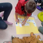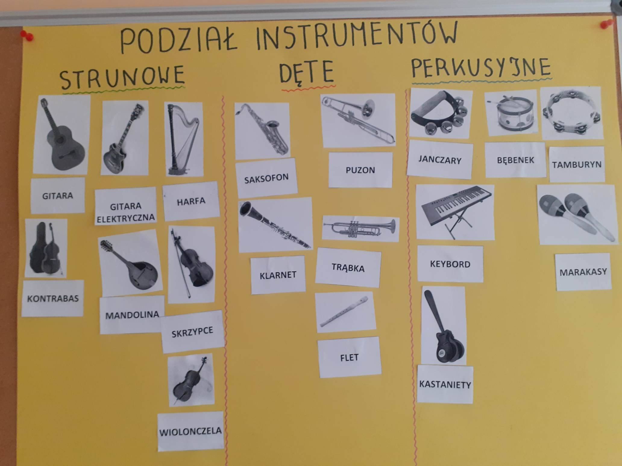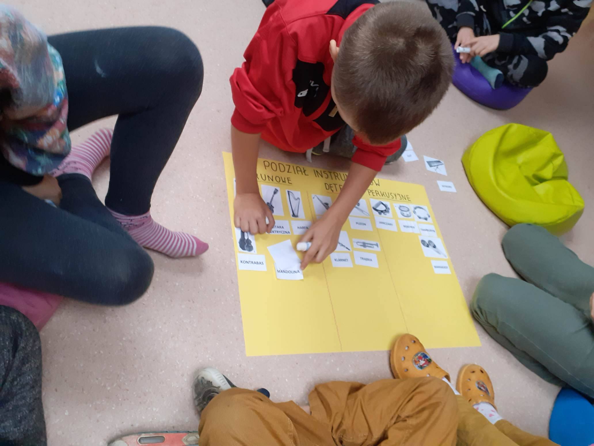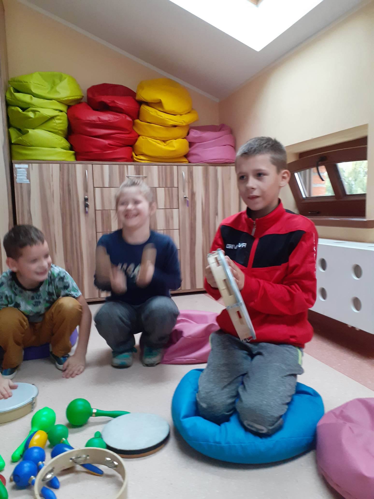To były ciekawe zajęcia, bo o instrumentach muzycznych! Mamy kilka w świetlicy, ale rzadko na nich gramy. Aby robić to dobrze, musieliśmy najpierw poznać trochę teorii. Były zagadki muzyczne: „co tak gra?” czy „jak nazywa się ten instrument?”. Dokonaliśmy też podziału instrumentów na dęte, strunowe i perkusyjne; dopasowaliśmy instrumenty do grających na nich muzyków, a na koniec to, na co czekaliśmy najbardziej – graliśmy na marakasach, bębenkach, tamburynie, janczarach.