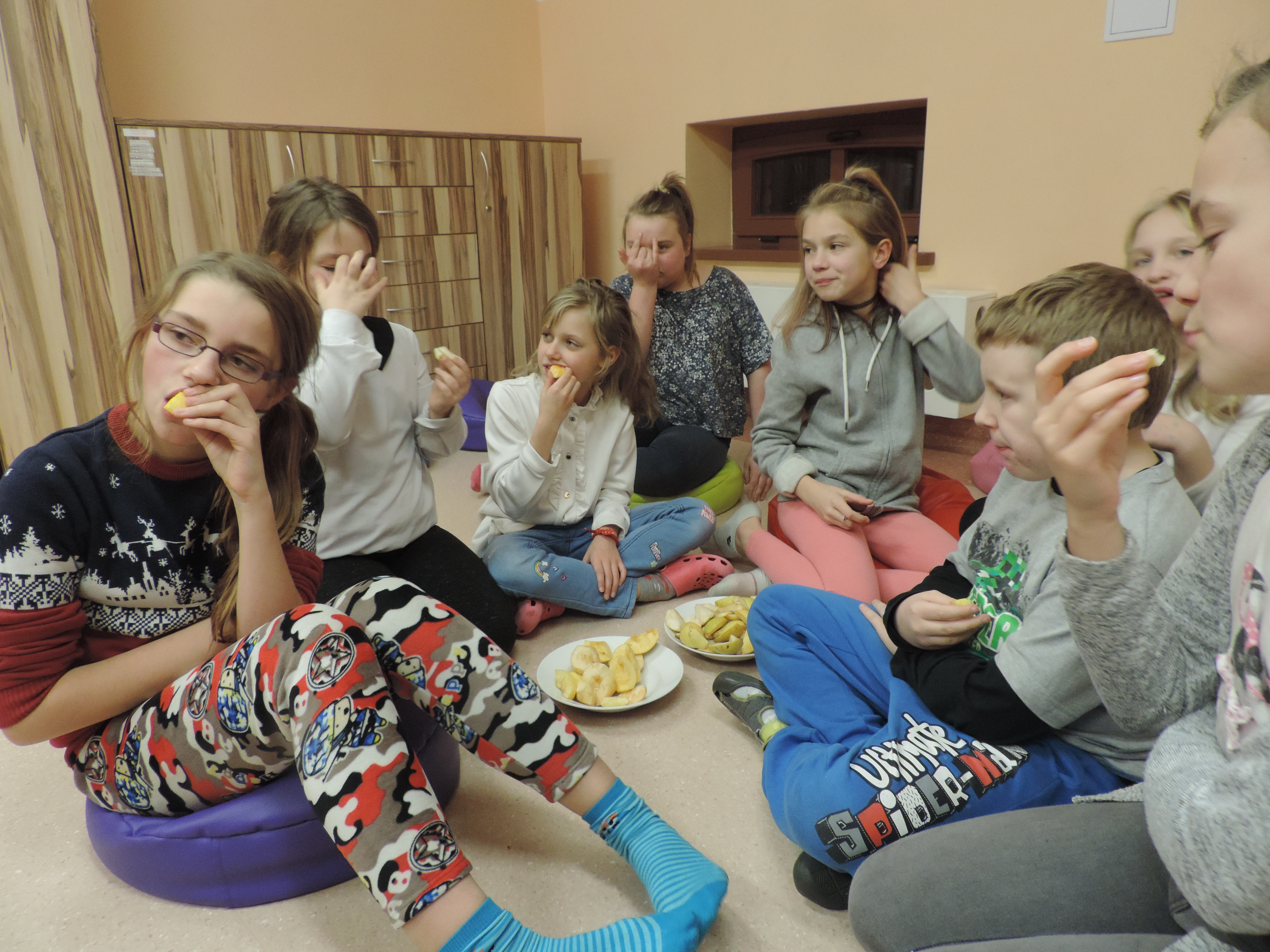 W minionym tygodniu w Świetlicy panowały owoce – jabłko i gruszka. Było zdrowo, smacznie i plastycznie. Nie skupiliśmy się na samym jedzeniu – trochę pogłębiliśmy wiedzę z zakresu zdrowego odżywiania, ale nie tylko. Próbowaliśmy sobie jeszcze przypomnieć polskie przysłowia, które mówią o tych owocach: „nie zasypujmy gruszek w popiele”, „ni z gruszki ni z pietruszki”, „niedaleko pada jabłko od jabłoni”. Dylemat jabłko czy gruszka nie został rozwiązany, głosy w tej sprawie były podzielone. Smakowały nam tak samo!