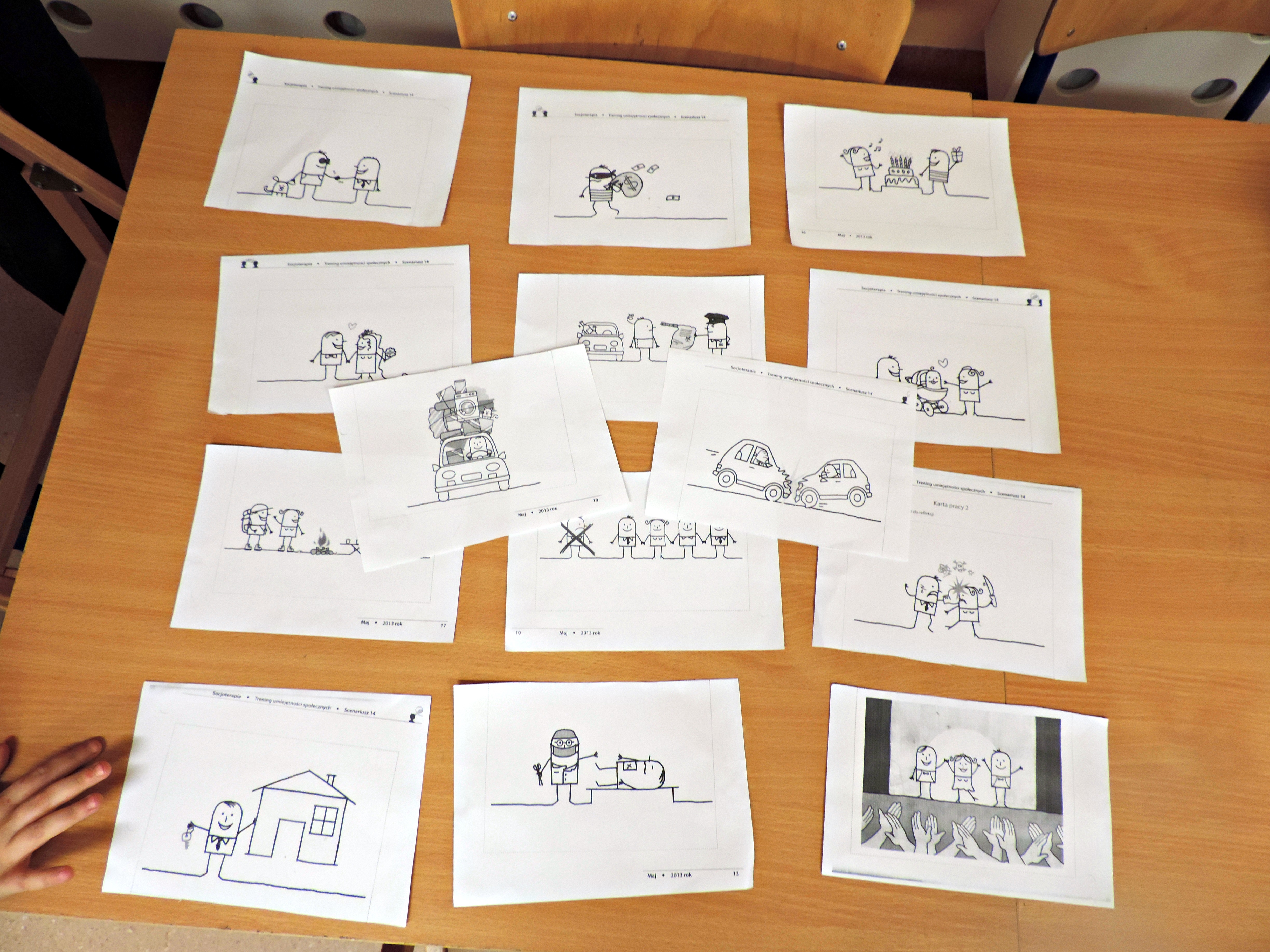 Na zajęciach z p. Małgosią rozmawialiśmy o tym, jak możemy sobie radzić z naszymi uczuciami. To dla nas trudny i ważny temat, szczególnie w ostatnim czasie. Na początek rozładowaliśmy nasze emocje i drzemiące w nas napięcie, rysując bezkresny ocean, pełen różnorodnych ryb. Z pomocą p. Małgosi dostrzegliśmy w nim podobieństwo nas samych i społeczeństwa, w którym żyjemy – naszej inności, ale i wyjątkowości. Analizowaliśmy też różne sytuacje społeczne i próbowaliśmy nazwać emocje, jakie towarzyszą ludziom w nich uczestniczących. To były cenne warsztaty.