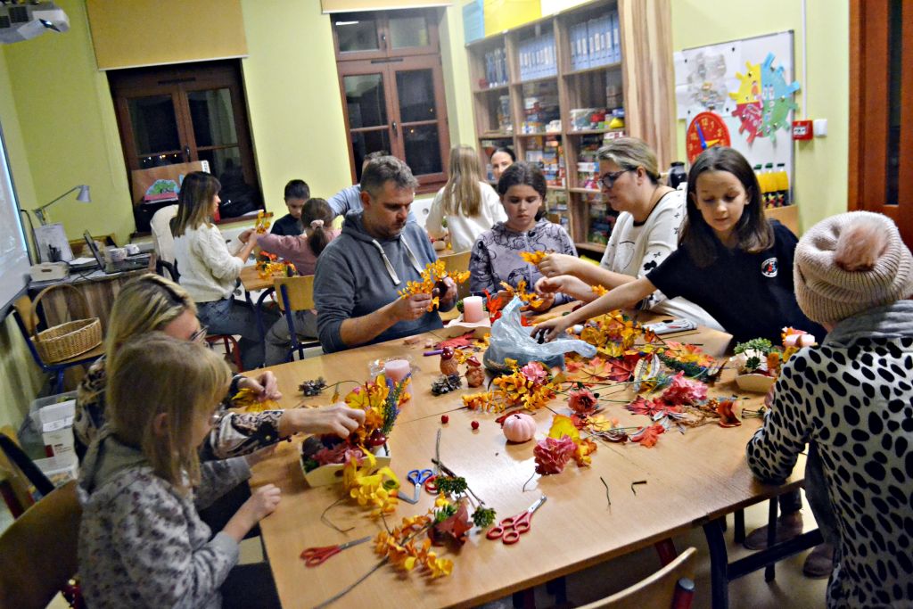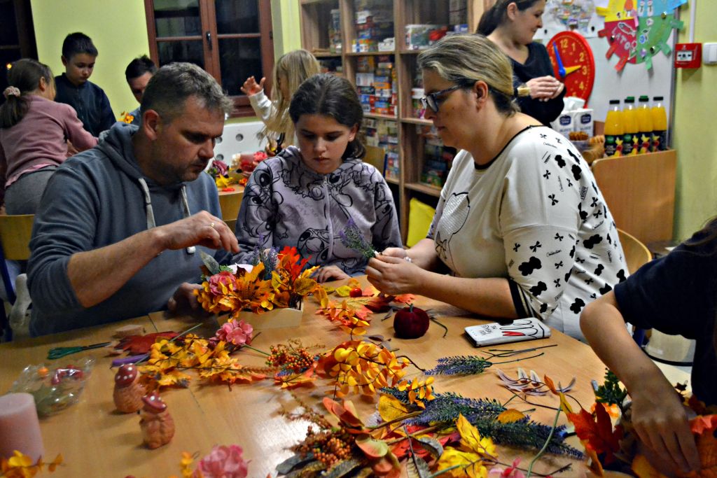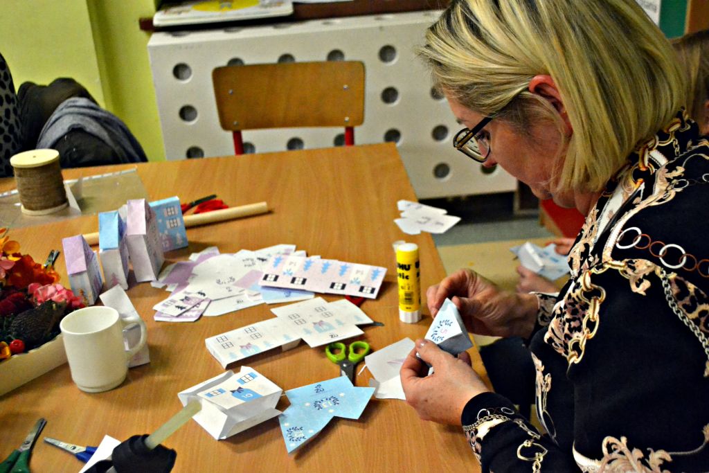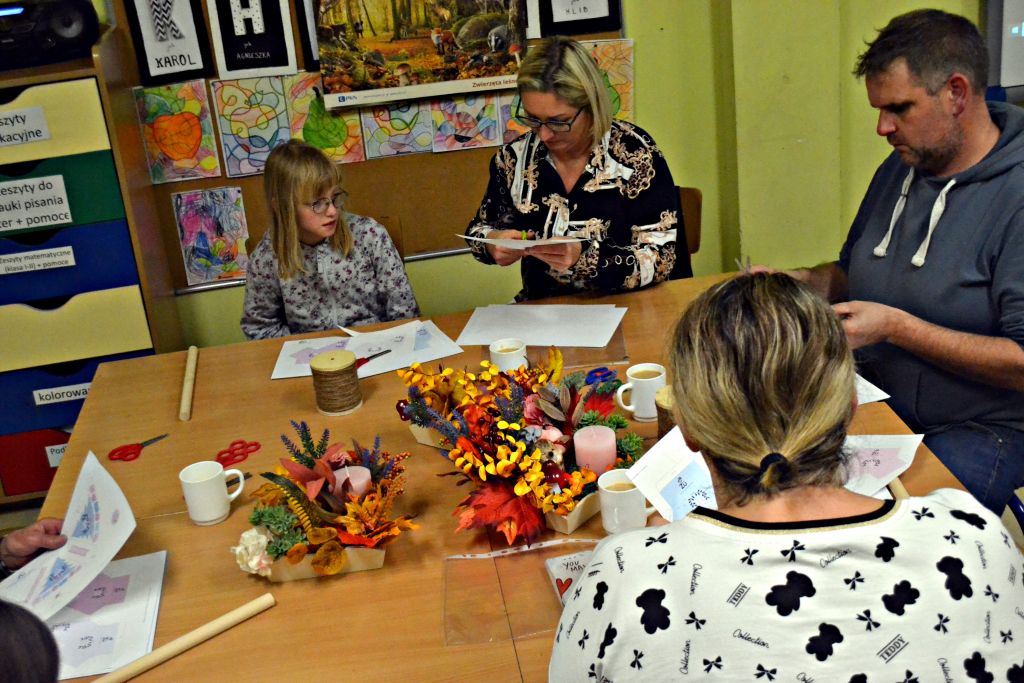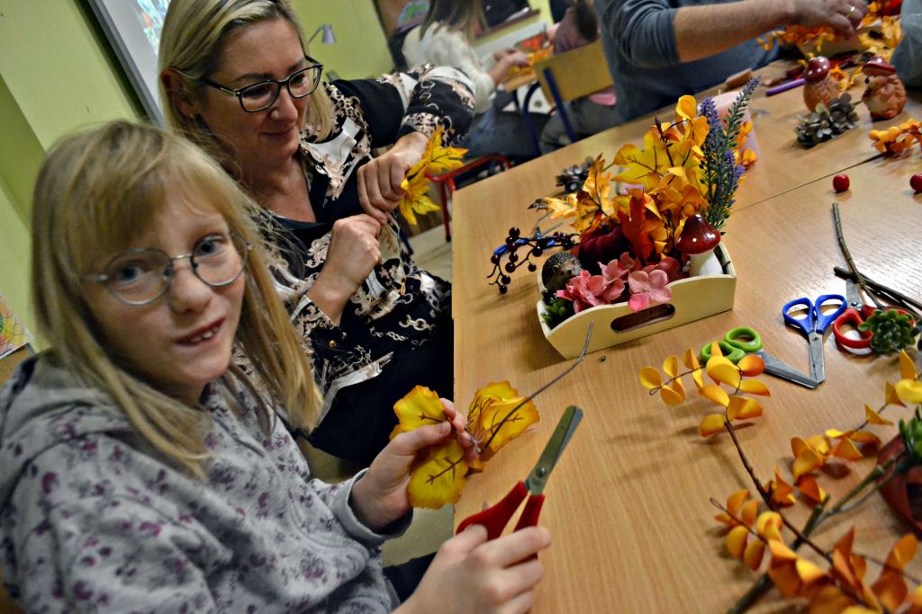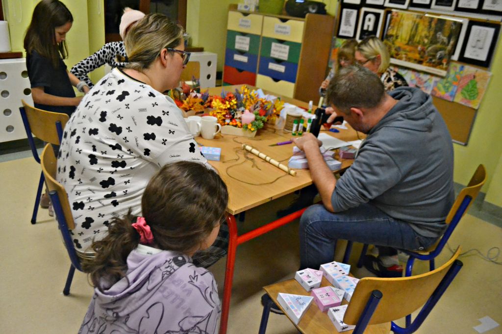 piątek zorganizowaliśmy kolejne warsztaty pt.: Jesień w moim domu. Chyba troszkę sprowokowaliśmy pogodę i postanowiła zrobić nam psikusa, zaskakując w weekend zimową aurą. Ale byliśmy i na to przygotowani, bo podczas naszego spotkania z rodzicami nie tylko przygotowaliśmy jesienne stroiki na nasze stoły, ale także powstały piękne i kolorowe kalendarze adwentowe. Było przy nich sporo pracy – wycinania, sklejania, zawieszania na sznureczkach, ale jako że w rodzinie siła, każdy wyszedł od nas przygotowany na nadchodzący adwent. Pięknie jest móc obserwować taką współpracę i wspólne działania!