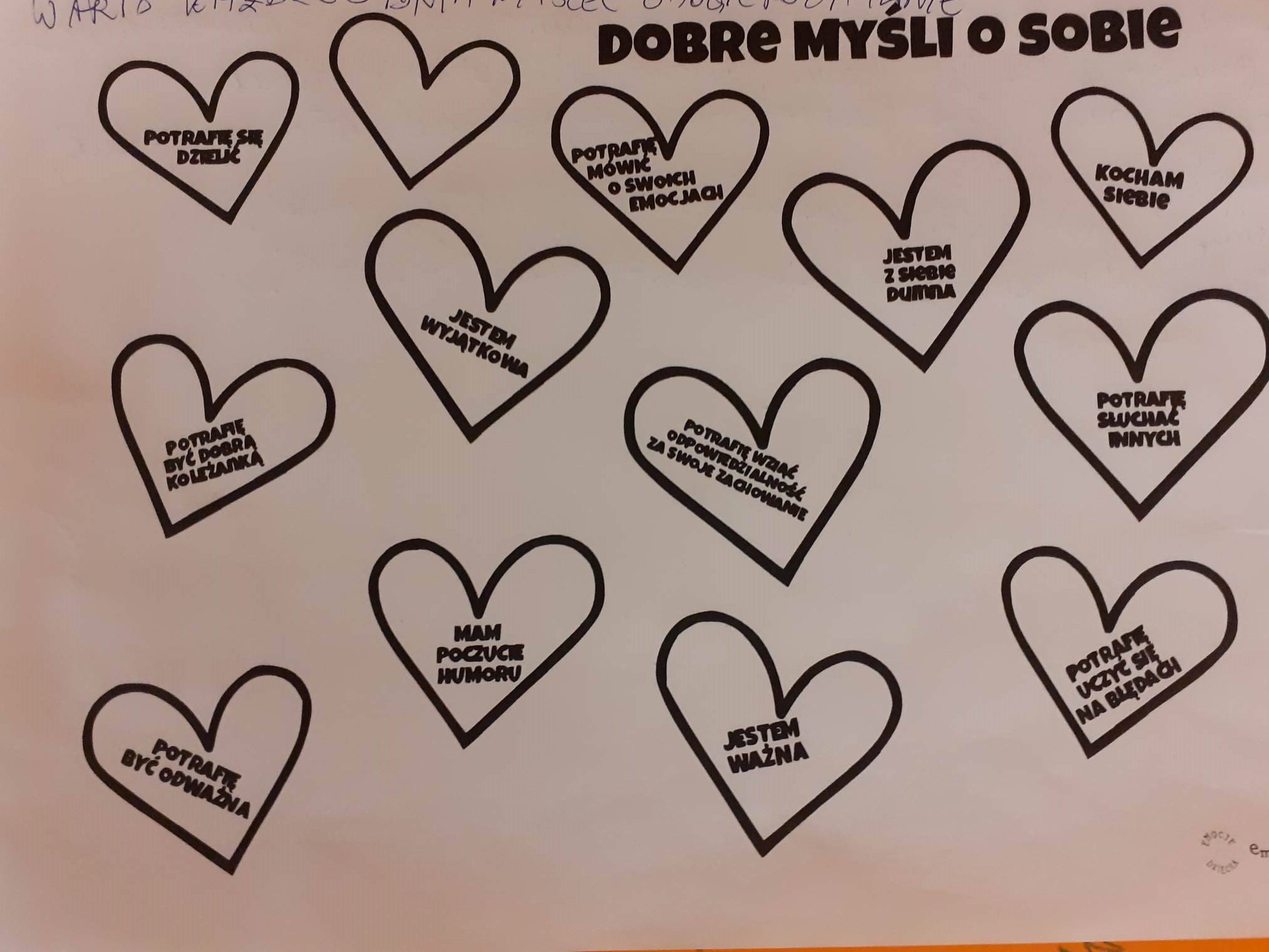 Rozmawialiśmy dzisiaj o nas – co myślimy o sobie, jaką mamy samoocenę, co myślą o nas inni ludzie. Uczyliśmy się doceniać siebie, swoje małe i duże sukcesy. Zastanawialiśmy się, co w sobie lubimy – w naszym wyglądzie i charakterze. To były potrzebne zajęcia – poznaliśmy się trochę lepiej.