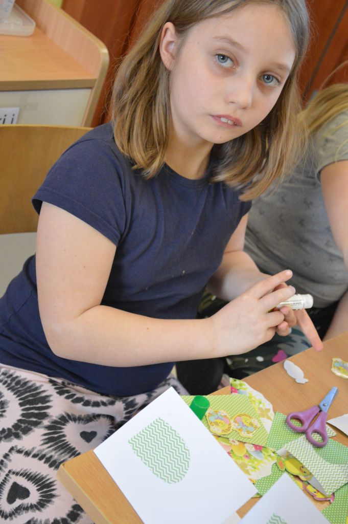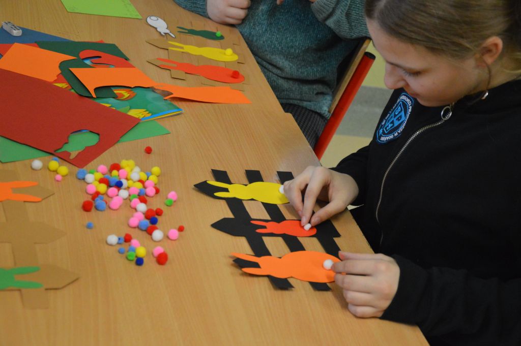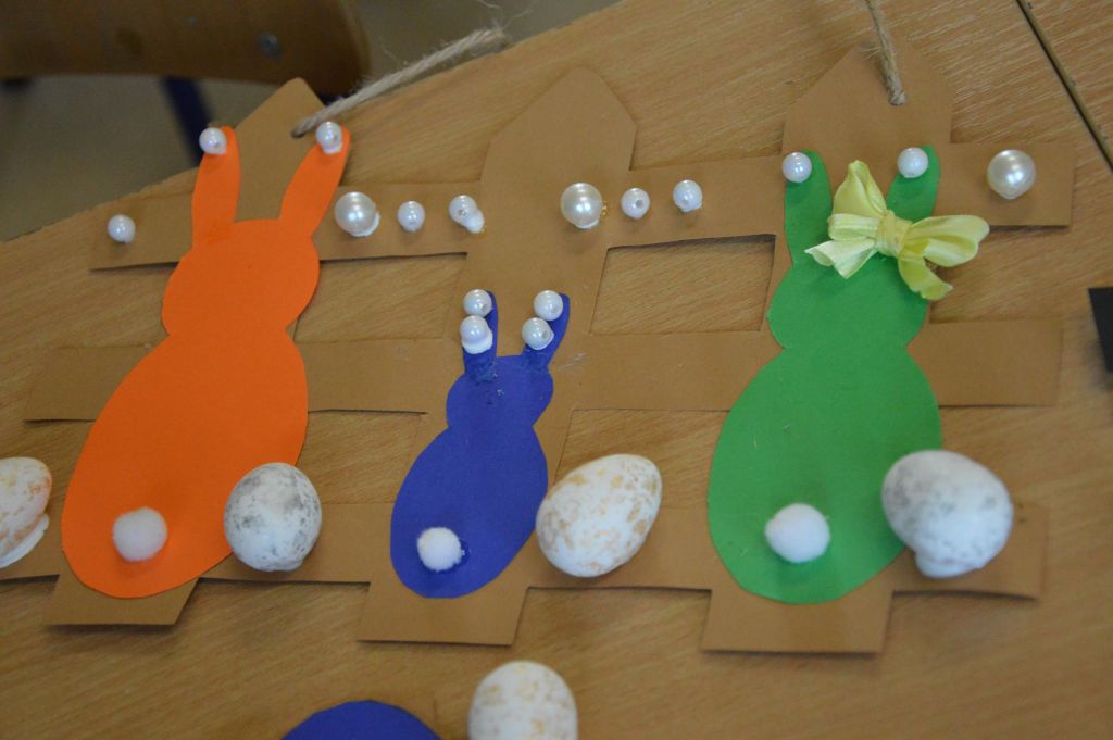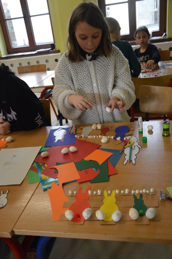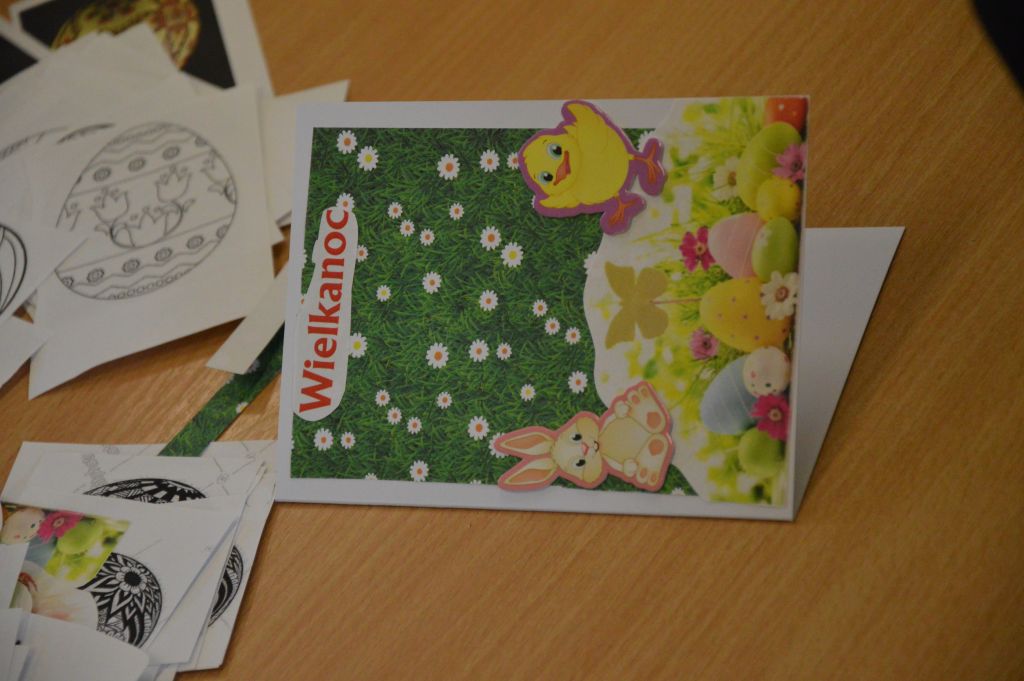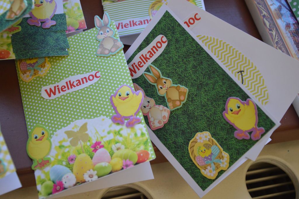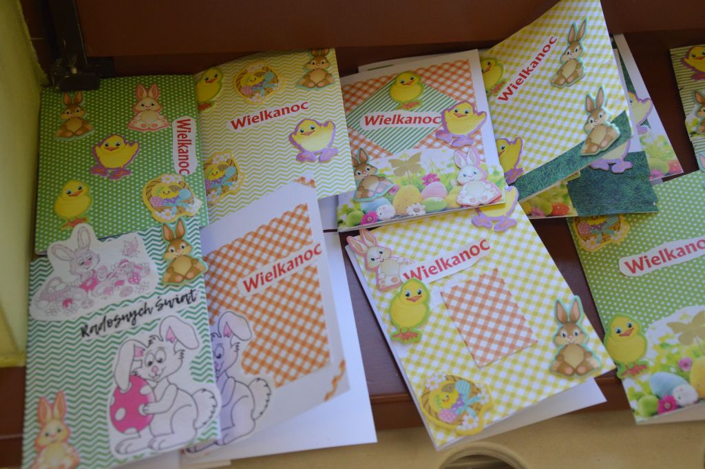Po pierwsze i najważniejsze – kartki świąteczne! Przygotowaliśmy je używając kolorowych papierów, aplikacji, naklejek i kolorowanek. Gotowe zabraliśmy do domów, aby wspólnie z rodzicami wypełnić wielkanocnymi życzeniami i wysłać do naszych bliskich. Uwielbiamy tę tradycyjną formę składania życzeń. Jest wyrazem naszych myśli, indywidualnego podejścia do odbiorcy. O aspekcie artystycznym już nawet nie wspominając! 😉