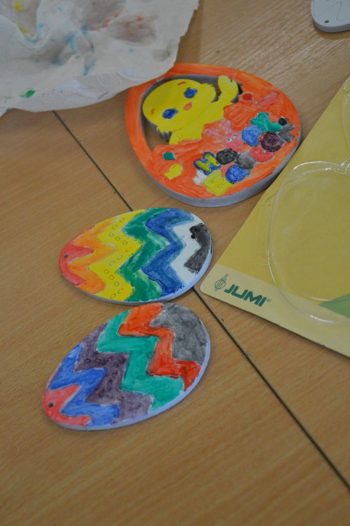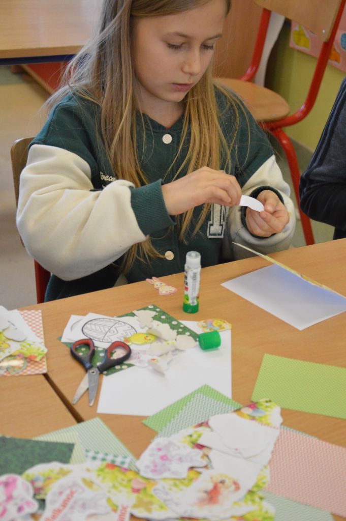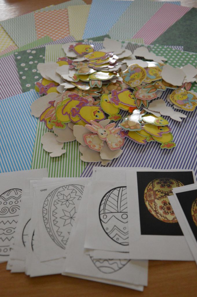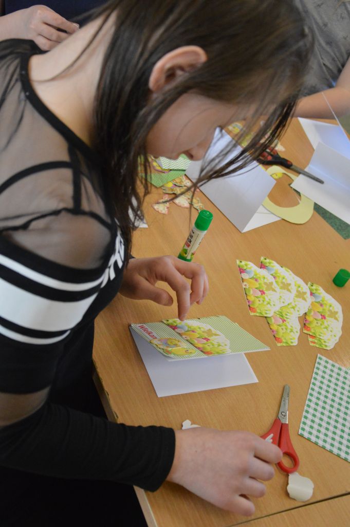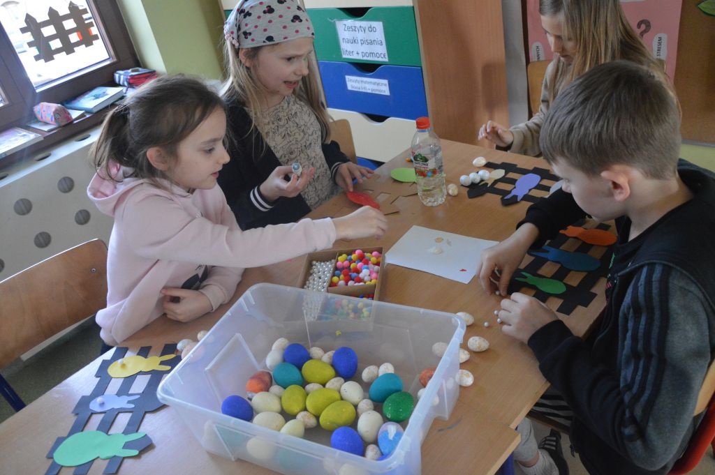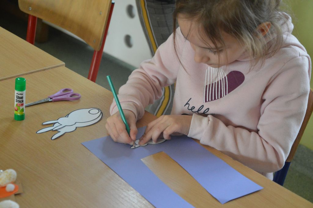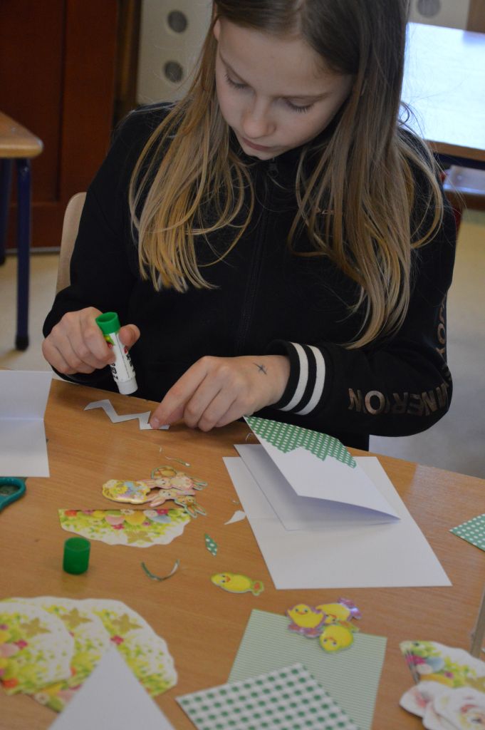 Po pierwsze i najważniejsze – kartki świąteczne! Przygotowaliśmy je używając kolorowych papierów, aplikacji, naklejek i kolorowanek. Gotowe zabraliśmy do domów, aby wspólnie z rodzicami wypełnić wielkanocnymi życzeniami i wysłać do naszych bliskich. Uwielbiamy tę tradycyjną formę składania życzeń. Jest wyrazem naszych myśli, indywidualnego podejścia do odbiorcy. O aspekcie artystycznym już nawet nie wspominając! 😉