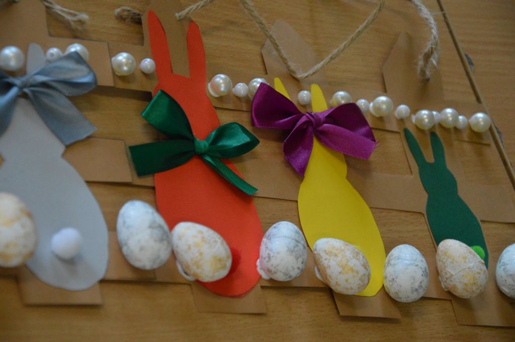No i girlanda z jajek – pomalowane kolorowymi farbkami i zawieszone na wstążkach będą piękną ozdobą w naszych domach.