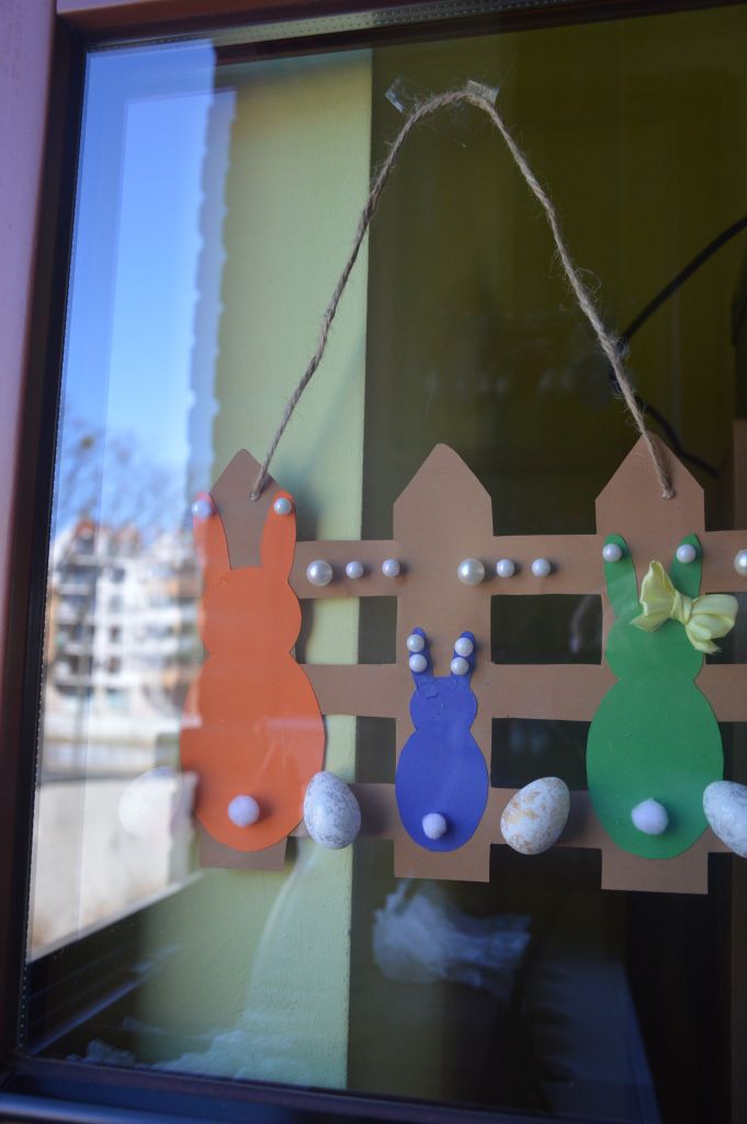 Kolejne świąteczne dekoracje także się pojawiły. Ich głównymi bohaterami były po pierwsze zajączki – najpierw w postaci geometrycznych kolorowanek; opasek na jajka, które znajdą się na świątecznym stole, ale znalazły się też takie, które przycupnęły pod płotkiem i spokojnie czekają na nadejście Wielkanocy.
