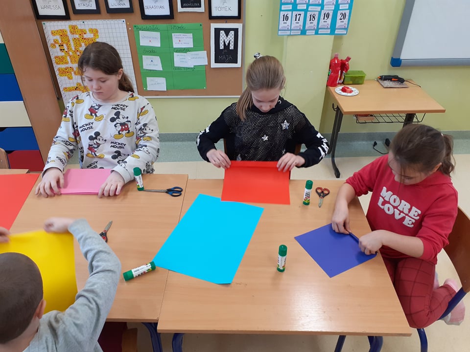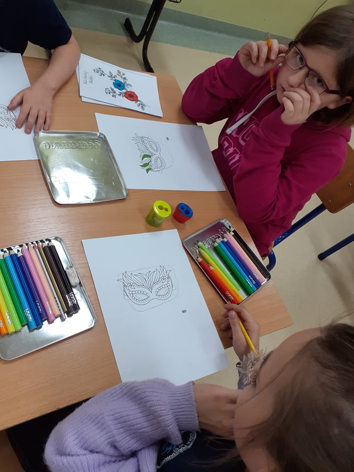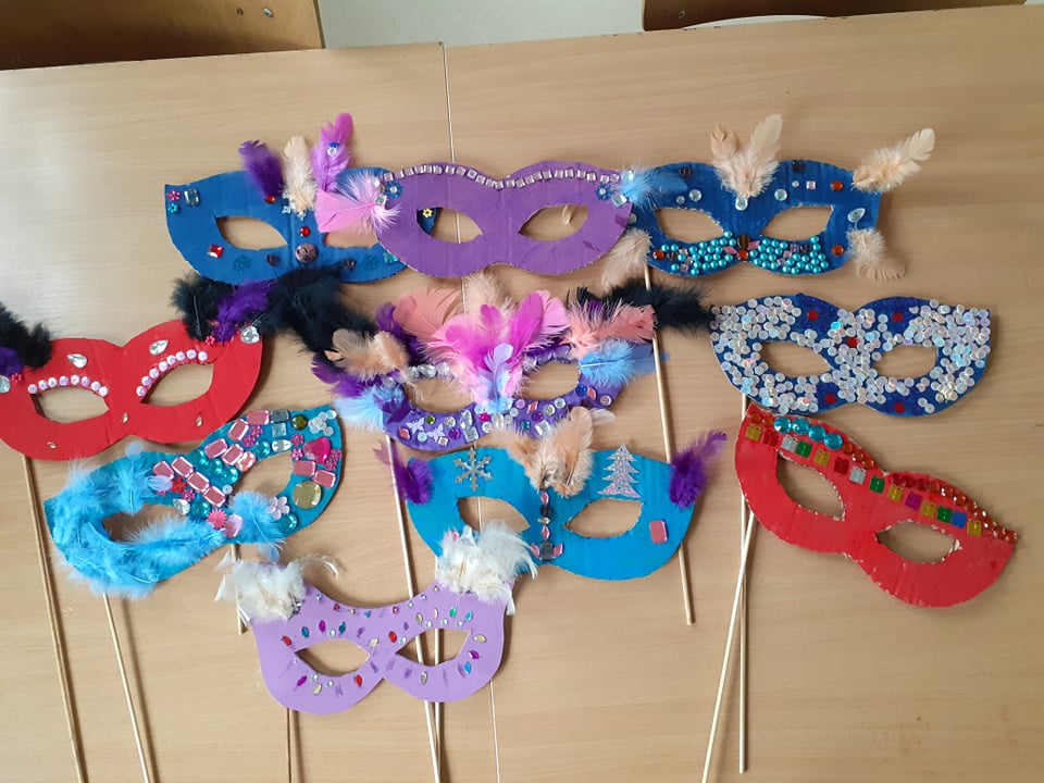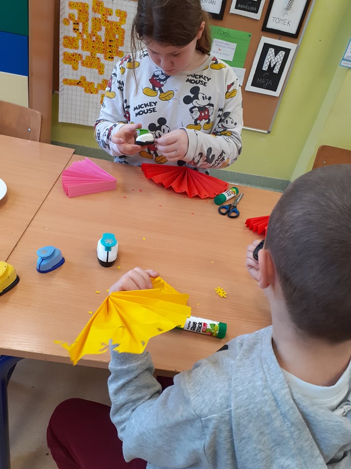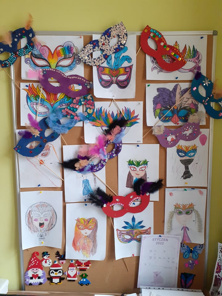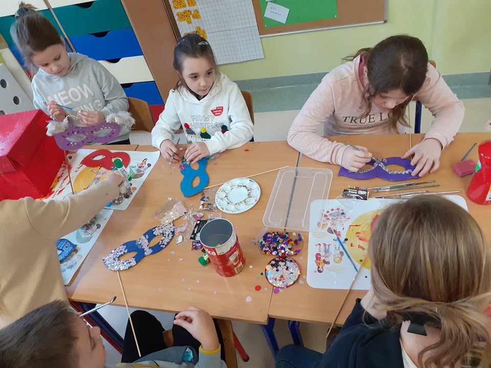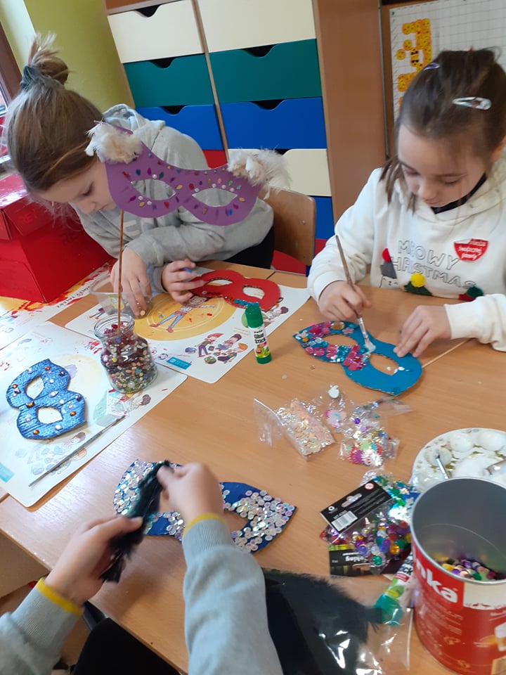 Obecnie żyjemy karnawałową atmosferą: powstały maski na patyku, projekty i wyobrażenia na temat naszych strojów i kostiumów na bal. Ostatnią prostą okazało się przygotowanie ozdób do sali: papierowych rozet i spirali. Efektu dopełniły balony. Jesteśmy zadowoleni z efektu, a jak bawiliśmy się na balu, opowiemy Wam w następnym poście po weekendzie. Czekajcie na fotorelację!
