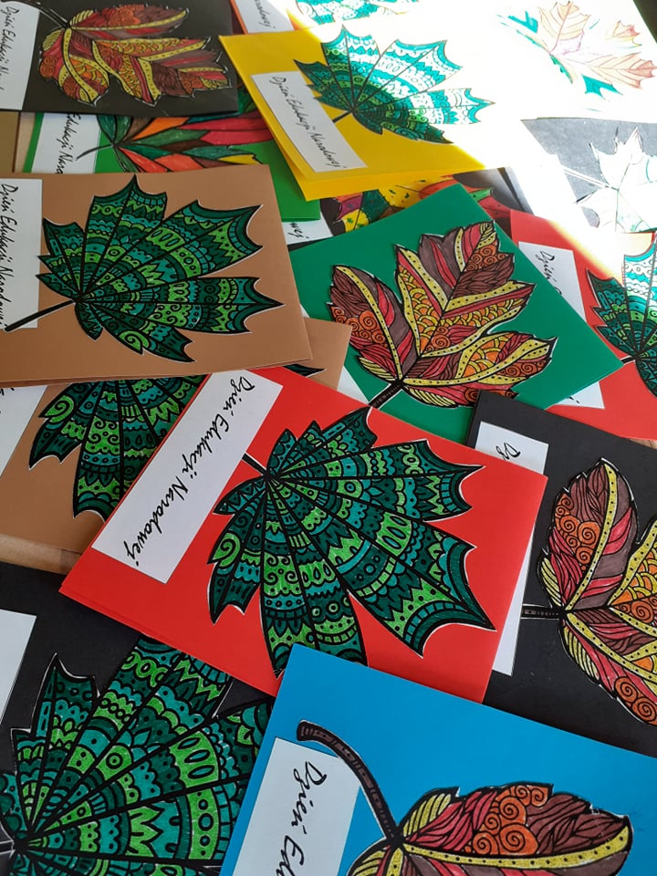 14 października to Dzień Edukacji Narodowej. My w naszej świetlicy przygotowaliśmy się do tego dnia – kolorowaliśmy liście, które następnie znalazły się na kartach z życzeniami dla naszych nauczycieli. Wszystkie pomalowane zostały w jesiennych barwach, a że nasza polska jesień jest naprawdę piękna, to i nasze kartki wyszły niesamowicie. To było sporo pracy – przygotowanie tylu kartek, ale udało się! Mamy nadzieję, że tego wyjątkowego dnia wywołały na twarzach nauczycieli choć niewielki uśmiech. Za ich trud pracy i wysiłek wkładany w naszą edukację i wychowanie!