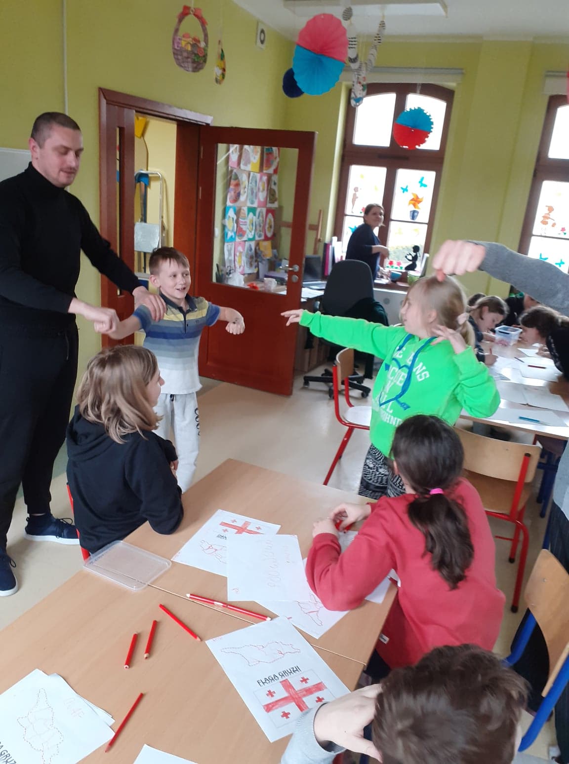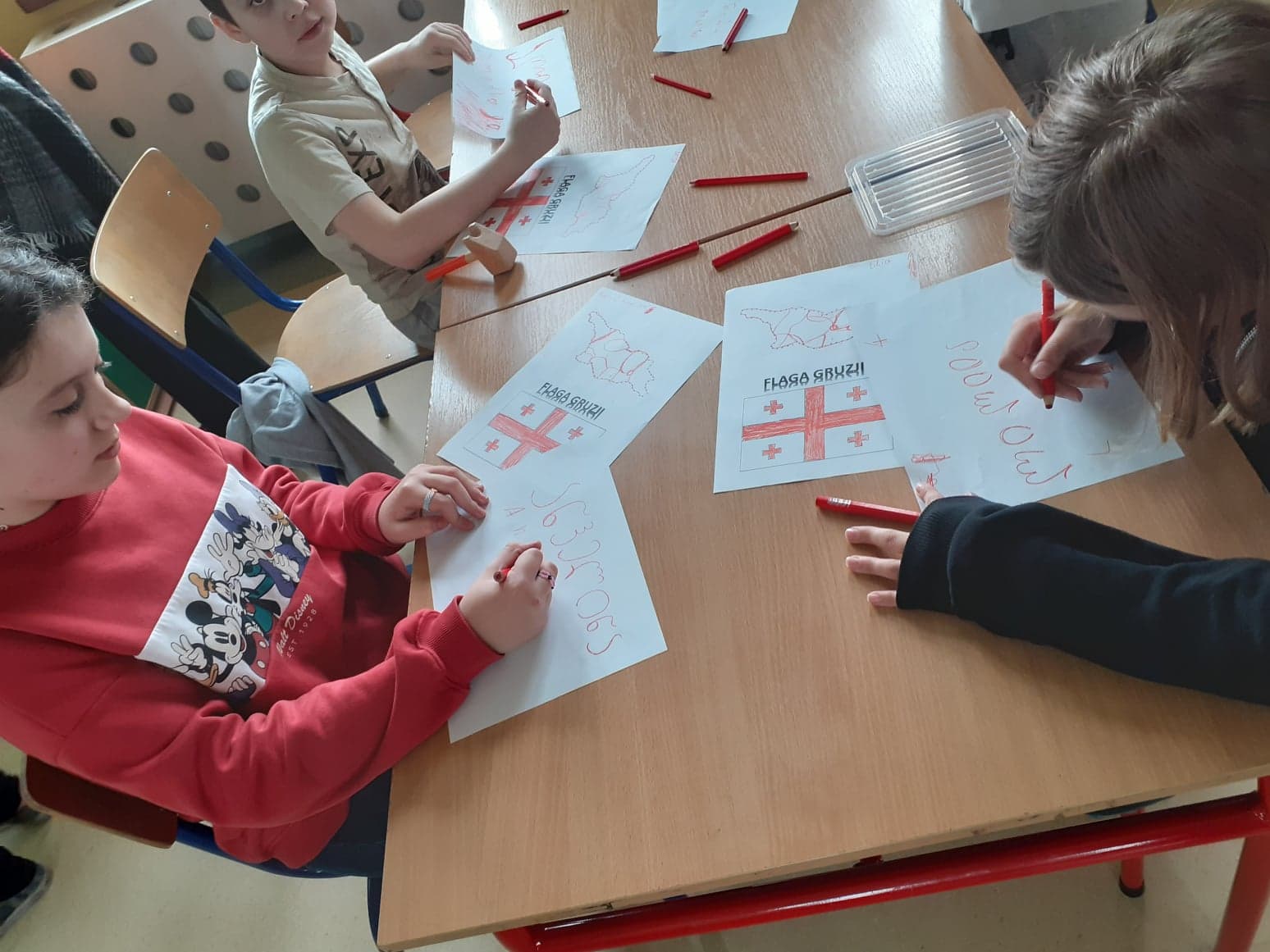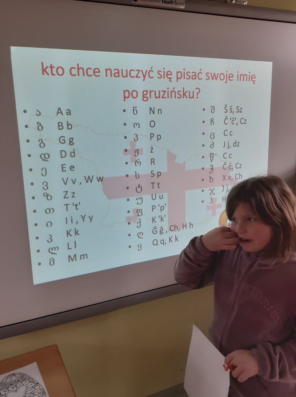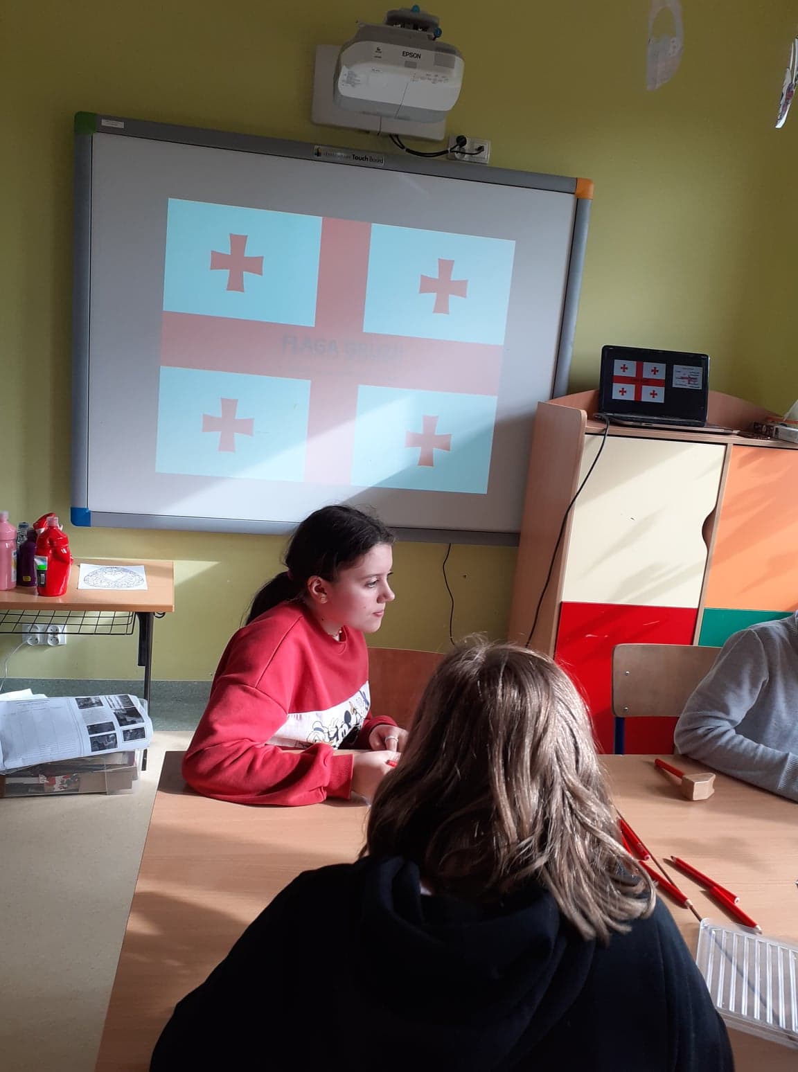 Ostatnie dwa dni to zajęcia z naszymi wolontariuszami z Gruzji – Irina Kiladze i Shota Shapakidze. Przygotowali dla nas prezentację o swojej ojczyźnie – zobaczyliśmy najpiękniejsze miejsca Gruzji, poznaliśmy ich alfabet, a nawet uczyliśmy się pisać za pomocą tych liter swoje imiona. Potrafimy już zlokalizować Gruzję na mapie, wiemy co jest jej stolicą i w jaki sposób jest podzielona. Kolorowaliśmy flagę, co nie było trudne, bo jest w takich samych barwach jak nasza, czyli biała i czerwona, ale za to z 5 krzyżami.