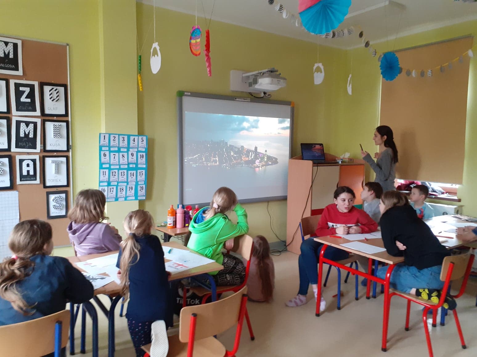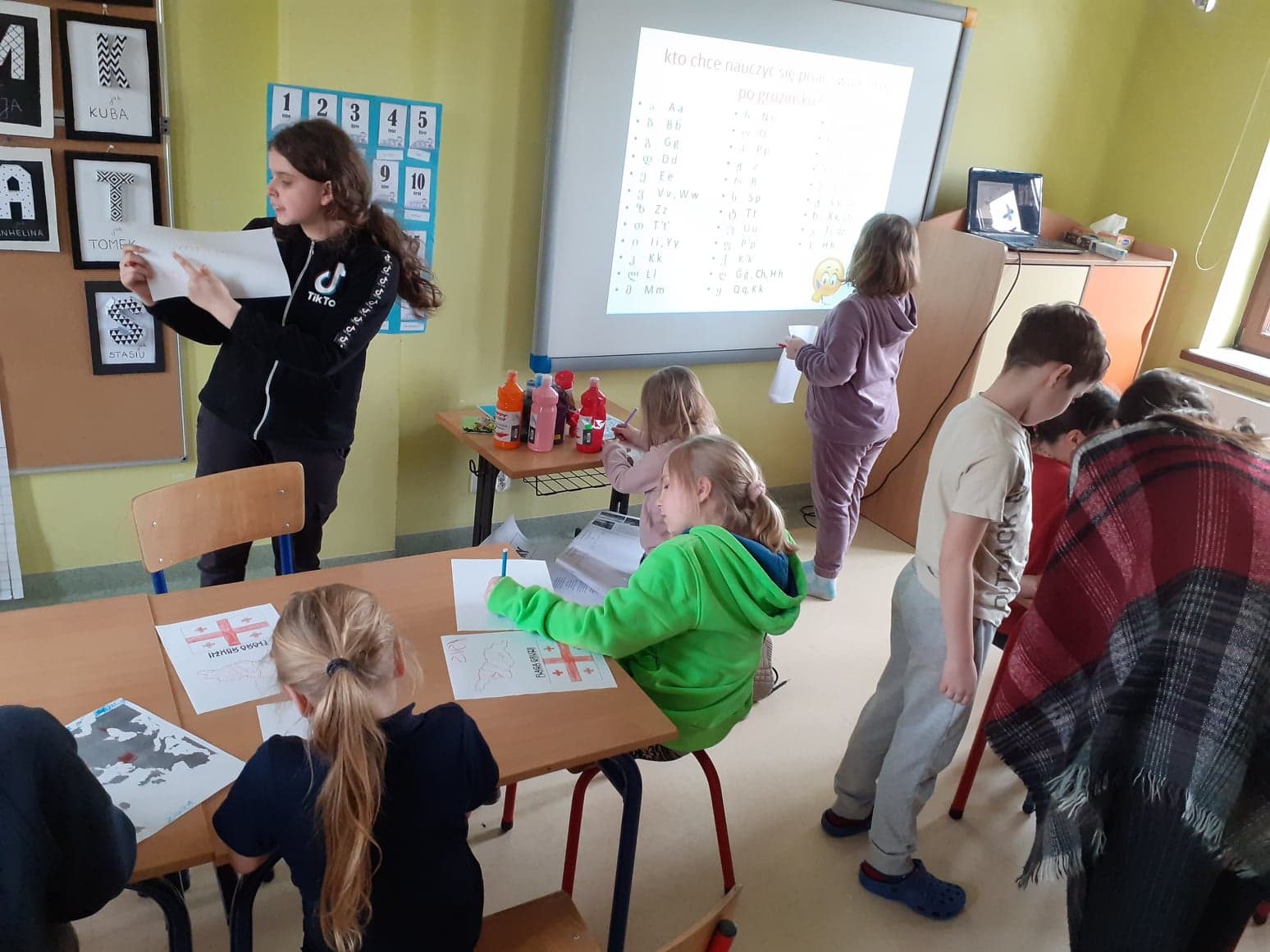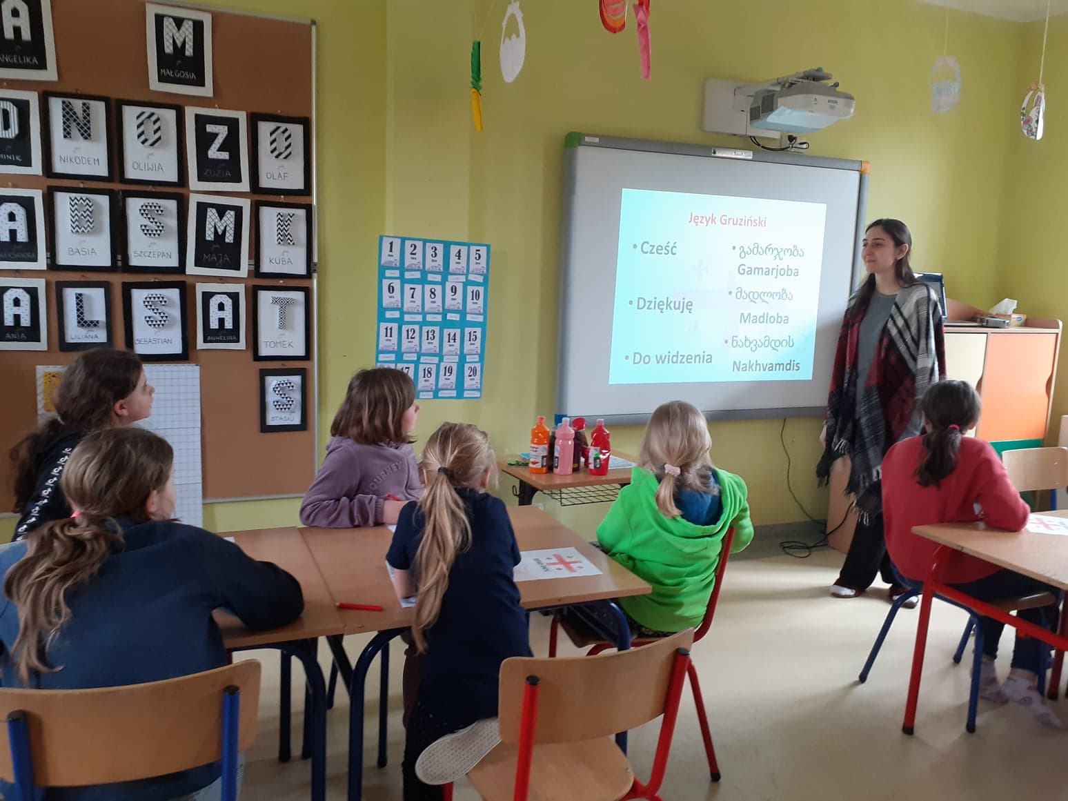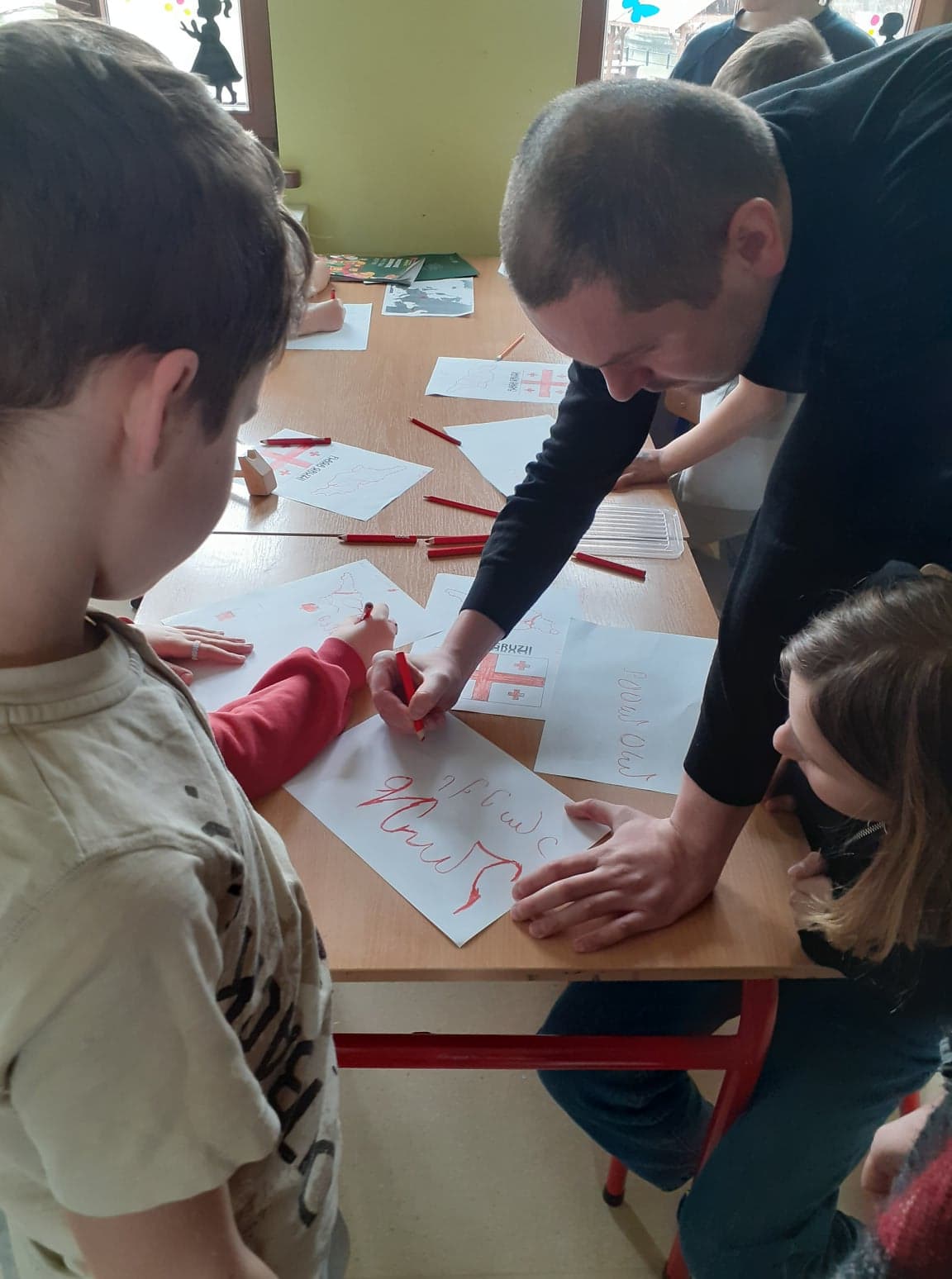 Ostatnie dwa dni to zajęcia z naszymi wolontariuszami z Gruzji – Irina Kiladze i Shota Shapakidze. Przygotowali dla nas prezentację o swojej ojczyźnie – zobaczyliśmy najpiękniejsze miejsca Gruzji, poznaliśmy ich alfabet, a nawet uczyliśmy się pisać za pomocą tych liter swoje imiona. Potrafimy już zlokalizować Gruzję na mapie, wiemy co jest jej stolicą i w jaki sposób jest podzielona. Kolorowaliśmy flagę, co nie było trudne, bo jest w takich samych barwach jak nasza, czyli biała i czerwona, ale za to z 5 krzyżami.