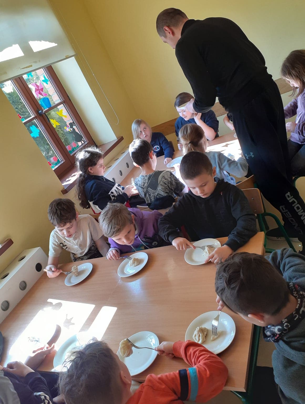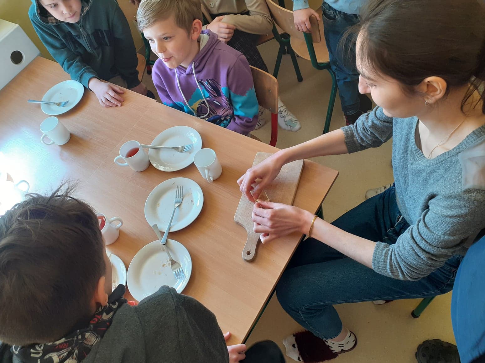 Irina pokazała nam również na filmiku jeden z tradycyjnych tańców. Potem mieliśmy okazję sami spróbować – mimo, że wielu z nas trochę się wstydziło, znalazła się dwójka odważnych- Zuzia i Olaf, którzy przyjęli właściwe dla tancerzy pozy i z pomocą wolontariuszy zatańczyli!