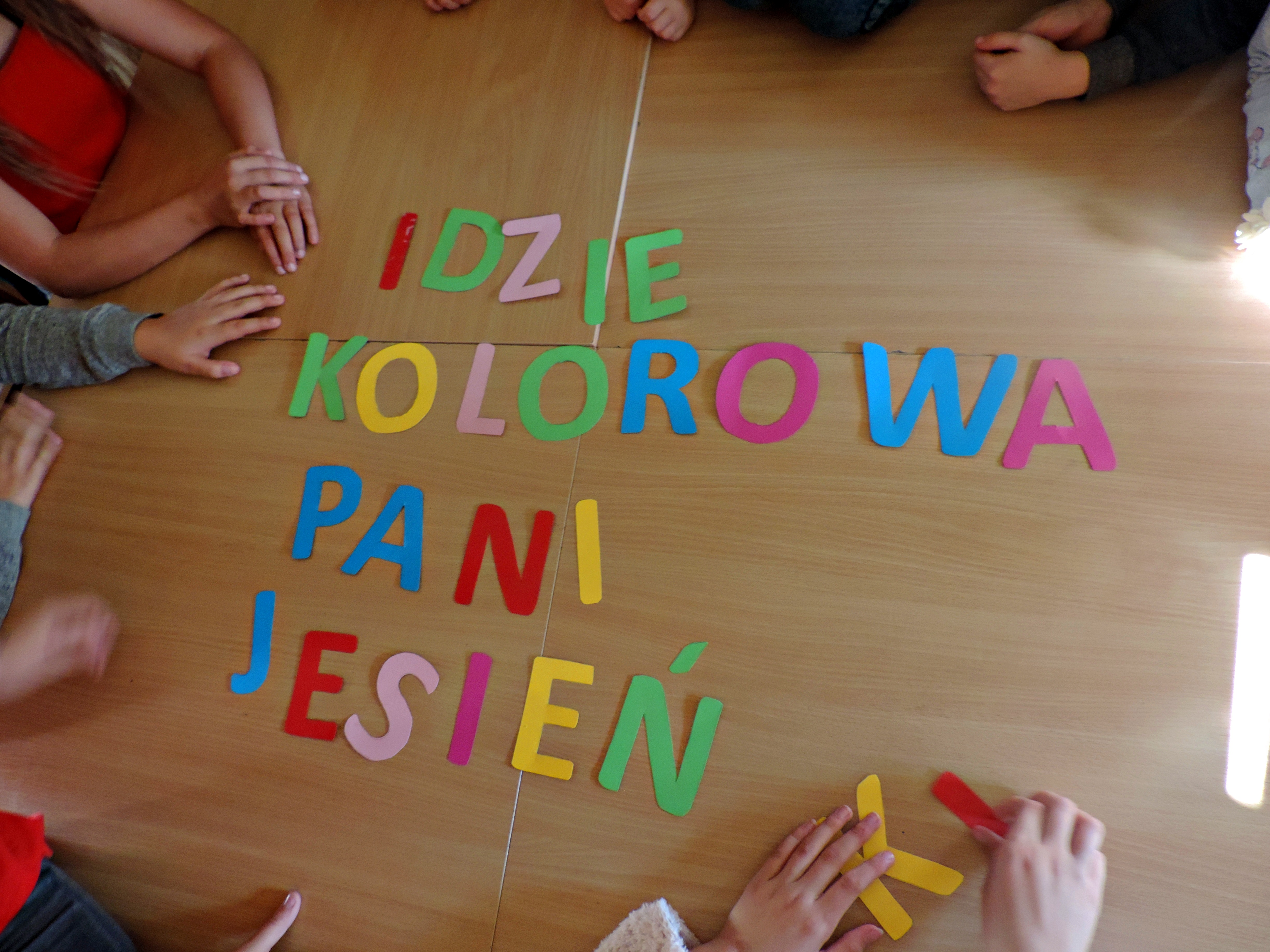 Pierwszy dzień jesieni za nami, za oknami aura prawdziwie jesienna – zimno, wiatr i deszcz. My jednak staramy się podejść do tego optymistycznie – u nas w świetlicy kolorowo. Powitaliśmy Panią Jesień z jej barwami – czerwonym, pomarańczowym, żółtym, brązowym.