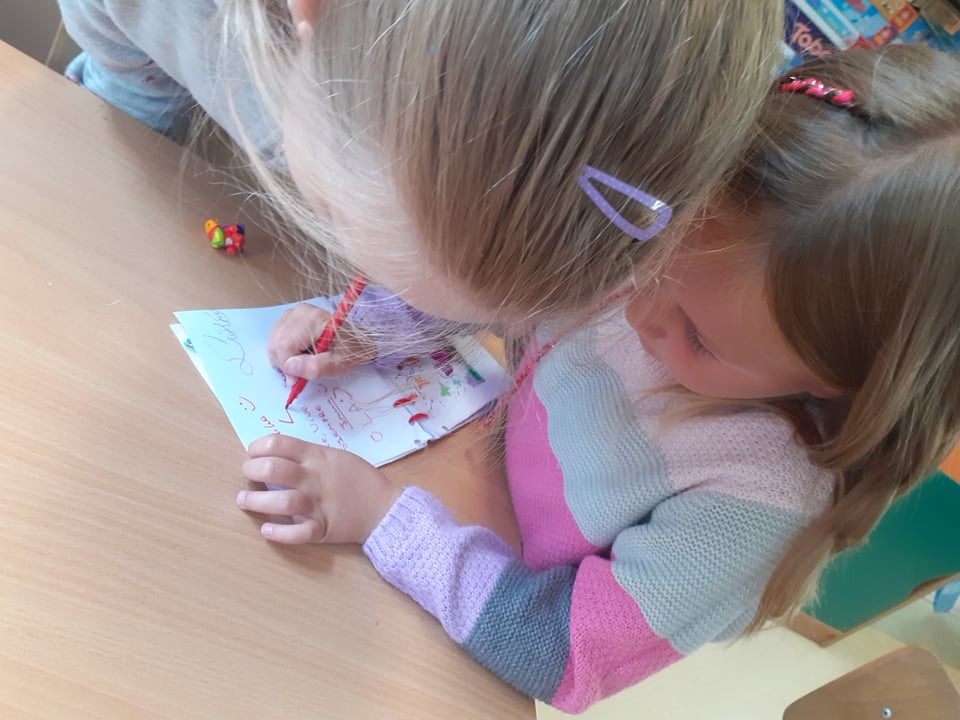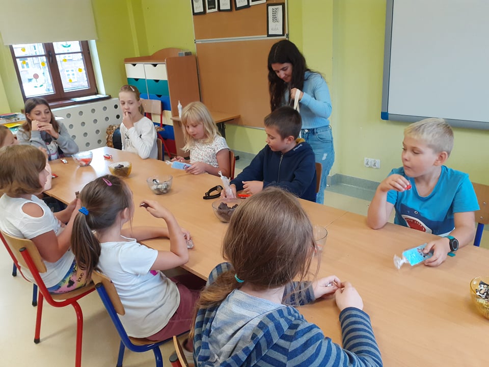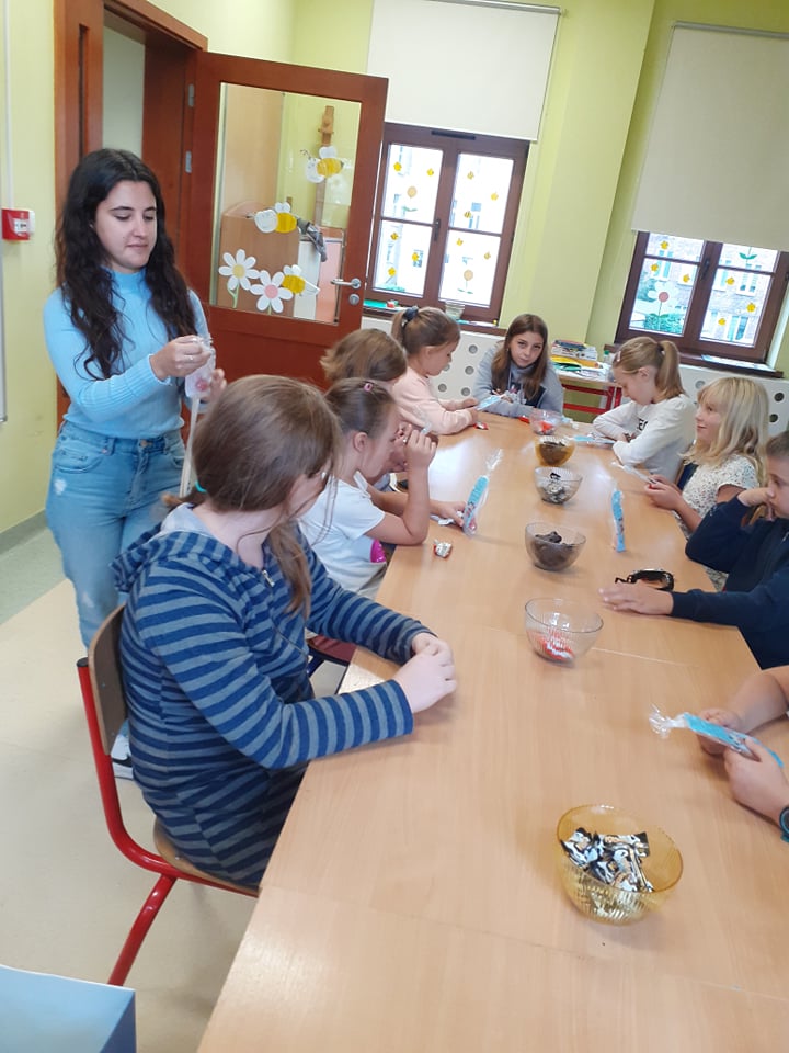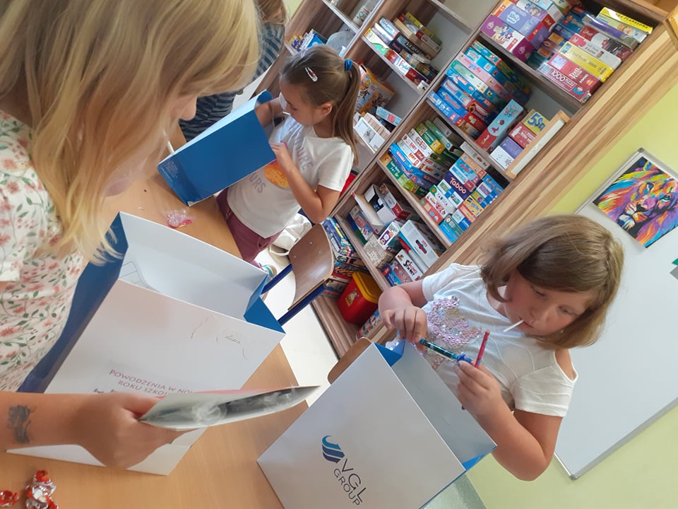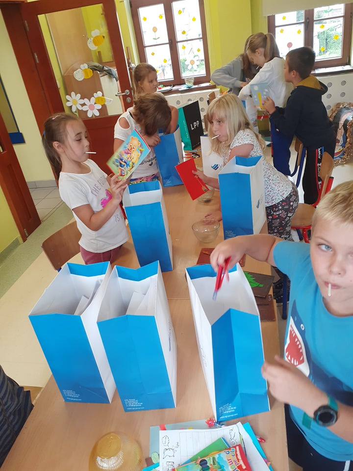Koniec wakacji w naszej świetlicy to kilka wydarzeń. Pierwszym z nich była wizyta w Centrum Nauki Eksperyment w Gdyni, podczas której przekonaliśmy się, że nauka też może być świetną okazją do zabawy. Stworzyliśmy sobie również albumy z wakacyjnymi wspomnieniami. Na ich kartach znalazły się pamiątki, rysunki, naklejki nawiązujące do tematyki każdego z letnich tygodni spędzonych w świetlicy. Zadbaliśmy też o to, aby było miejsce na wpisy od naszych koleżanek i kolegów, bo nic nie jest tak ważne, jak nawiązane przyjaźnie i nowe znajomości. Ostatni dzień przed rozpoczęciem roku szkolnego to także ostatni dzień w projekcie naszej wolontariuszki Inmy. Był smutek, wzruszenie, podziękowania i prezenty. Inma dostała od nas album ze zdjęciami i wspomnieniami z naszej świetlicy. My również dostaliśmy od niej upominki – słodkości i zakładki do książek z przemiłymi słowami na pamiątkę jej pobytu z nami. Aby lżej nam było powrócić do szkoły, każdy dostał pakiet na start zawierający kredki, ołówki, długopisy, linijki, zeszyty.