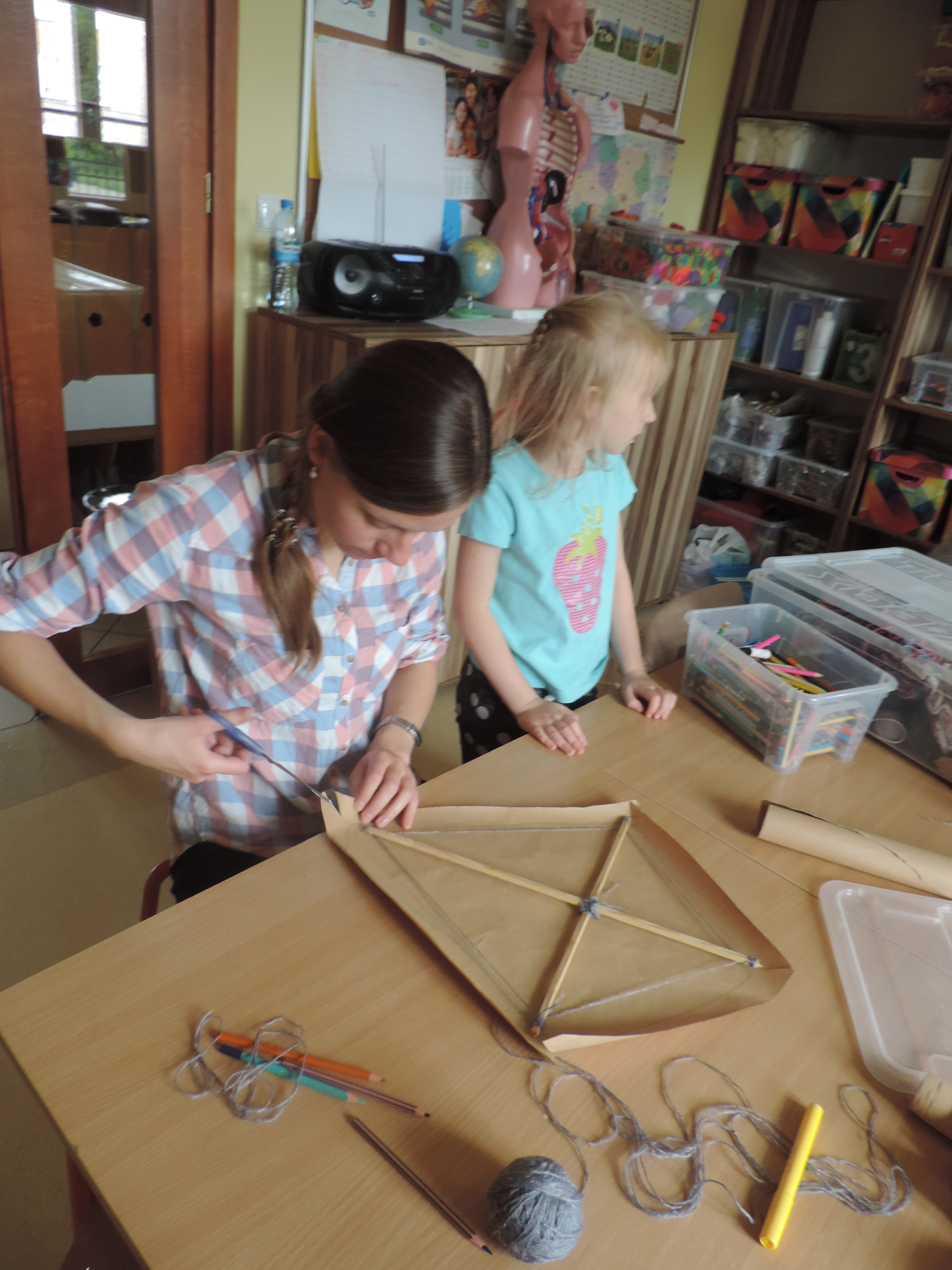 Dzisiaj wietrzny dzień, ale i do tego potrafimy się dopasować. Postanowiliśmy bowiem wykorzystać panujące na zewnątrz warunki pogodowe i zrobić latawce. Może i nie pofrunęły do samego nieba, ale i tak się dobrze bawiliśmy.