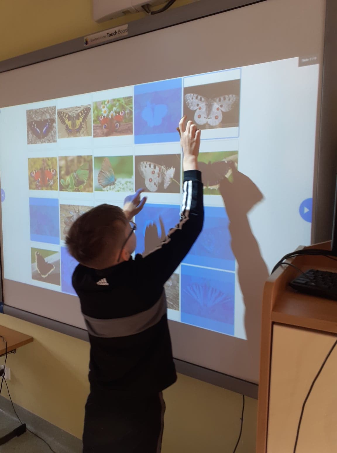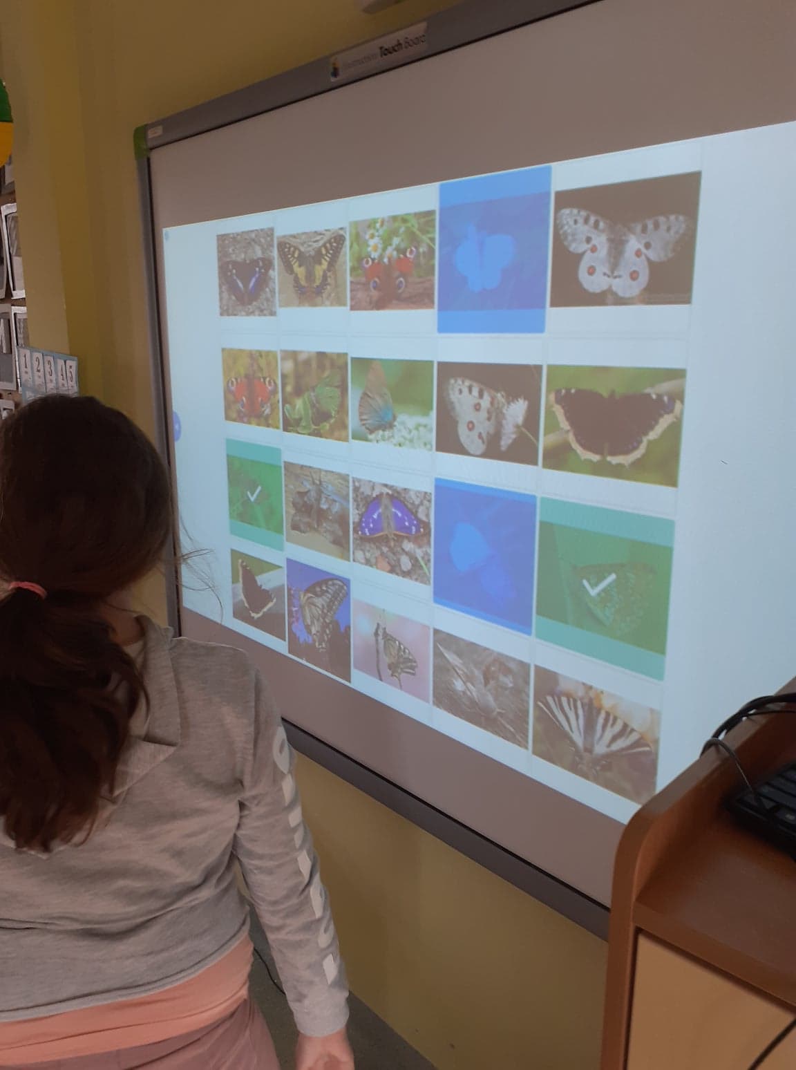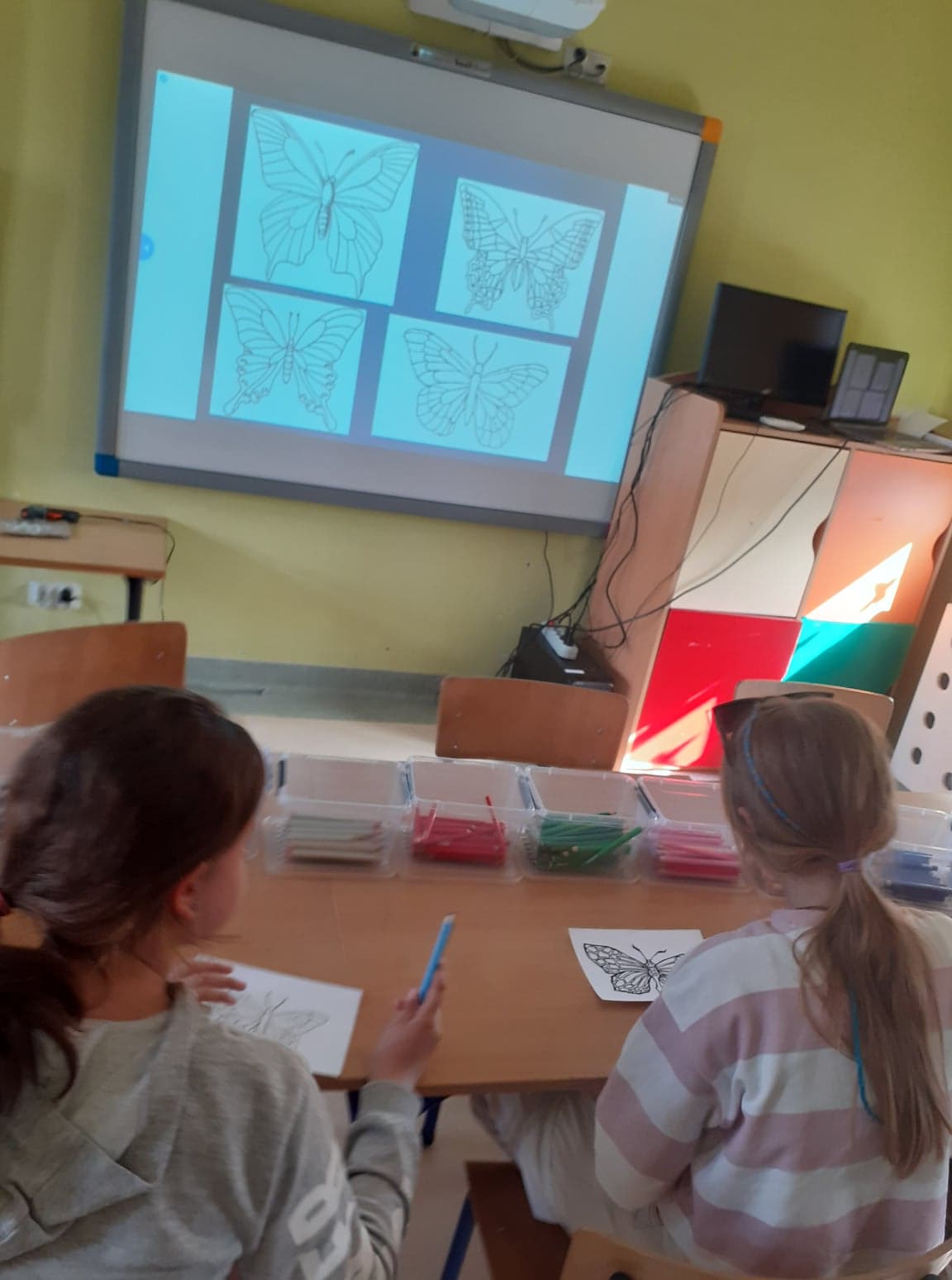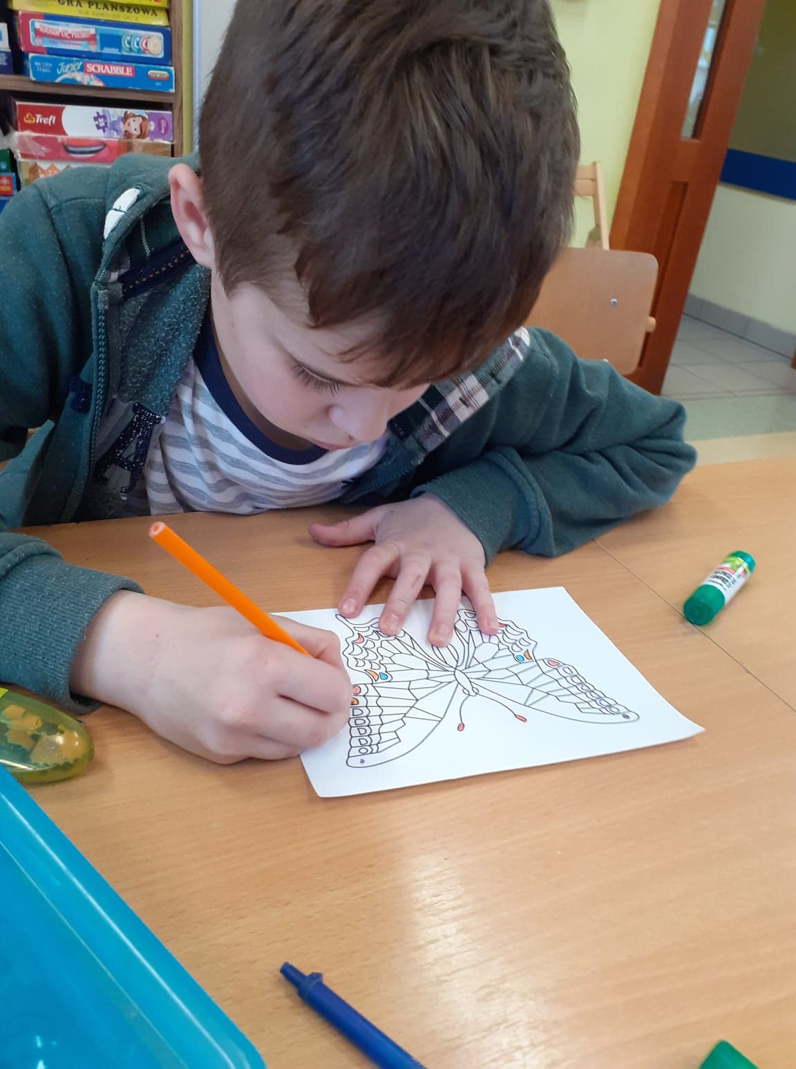 Zgłębiliśmy świat motyli, przede wszystkim tych występujących w Polsce. Poznaliśmy nazwy gatunków, ich wygląd i barwy. W zabawie memory łączyliśmy w pary te same motyle – w różnych ujęciach i otoczeniu. Nie było to takie proste jakby się wydawało, zdarzały nam się pomyłki. Ale i tak całkiem sporo udało nam się zapamiętać. Ponadto poznaliśmy cykl życia motyli oraz ich podział na nocne i dzienne. Nie mogło zabraknąć pracy plastycznej – wykonaliśmy kolorowe motyle, każdy z nas stworzył swój własny, nowy gatunek. Aby ich barwy wyglądały jeszcze piękniej, wycięliśmy je i przykleiliśmy na ciemne tło.