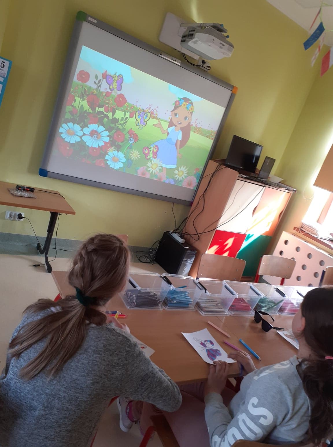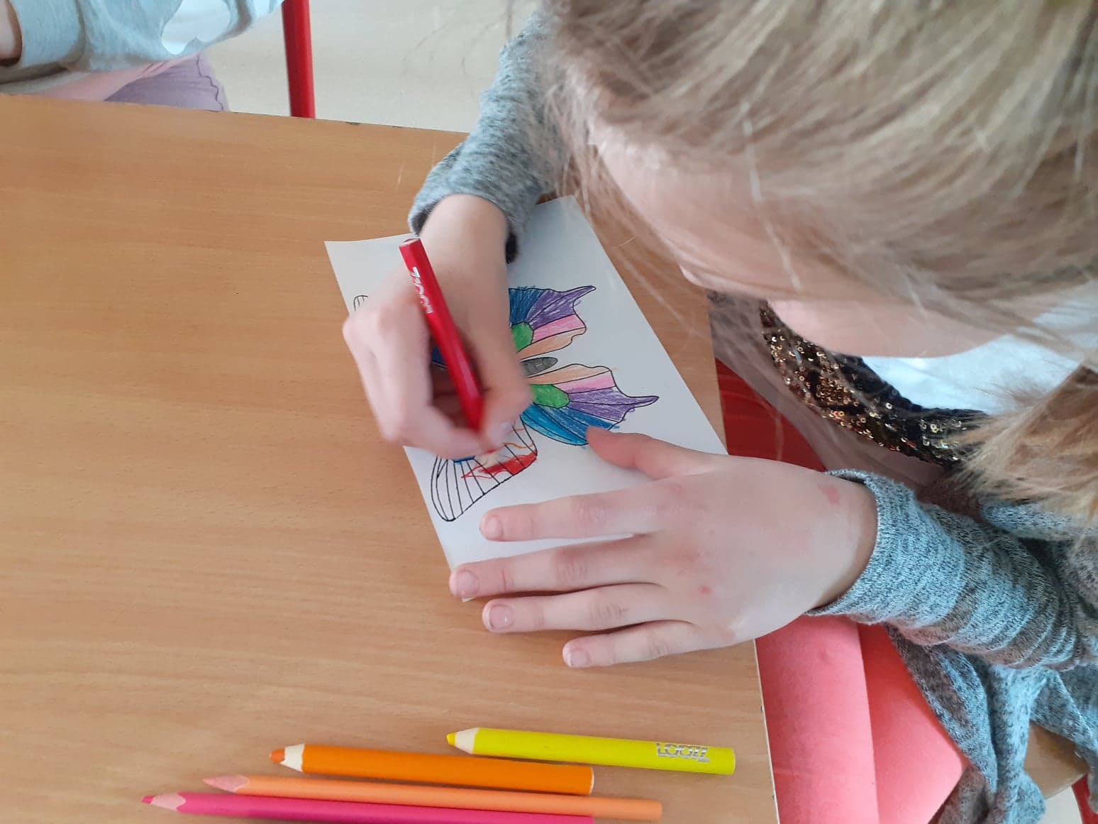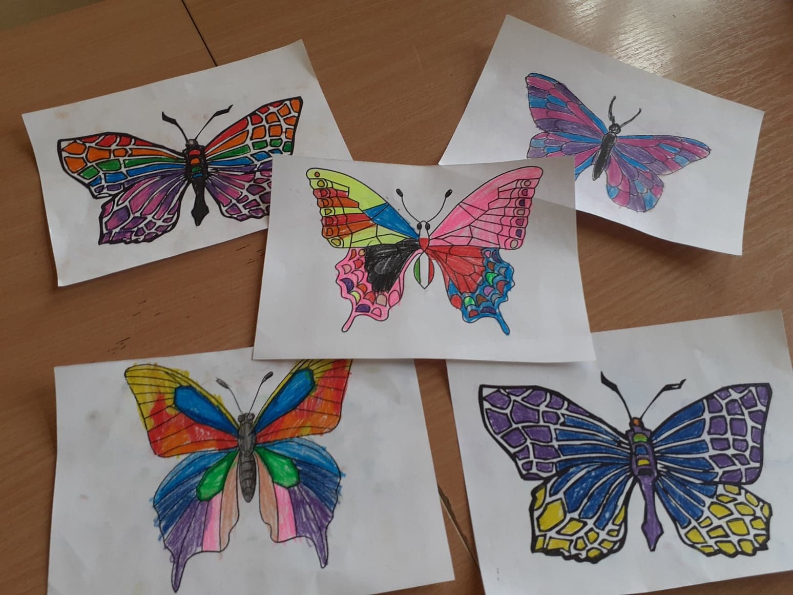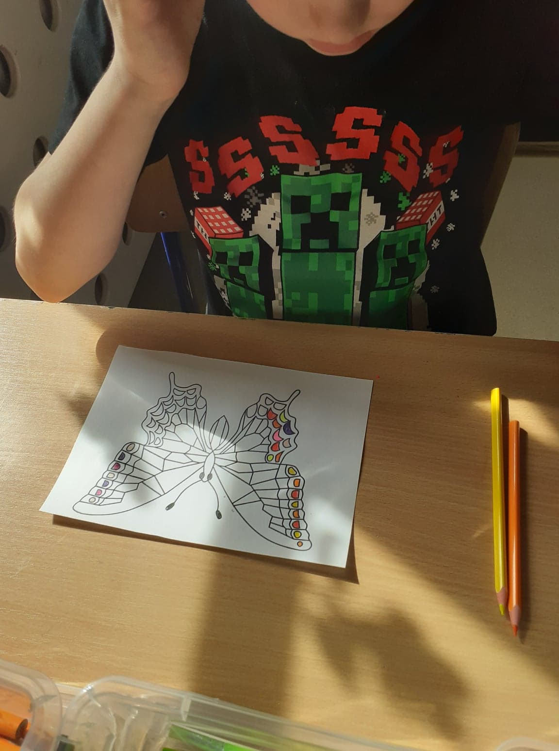 Zgłębiliśmy świat motyli, przede wszystkim tych występujących w Polsce. Poznaliśmy nazwy gatunków, ich wygląd i barwy. W zabawie memory łączyliśmy w pary te same motyle – w różnych ujęciach i otoczeniu. Nie było to takie proste jakby się wydawało, zdarzały nam się pomyłki. Ale i tak całkiem sporo udało nam się zapamiętać. Ponadto poznaliśmy cykl życia motyli oraz ich podział na nocne i dzienne. Nie mogło zabraknąć pracy plastycznej – wykonaliśmy kolorowe motyle, każdy z nas stworzył swój własny, nowy gatunek. Aby ich barwy wyglądały jeszcze piękniej, wycięliśmy je i przykleiliśmy na ciemne tło.
