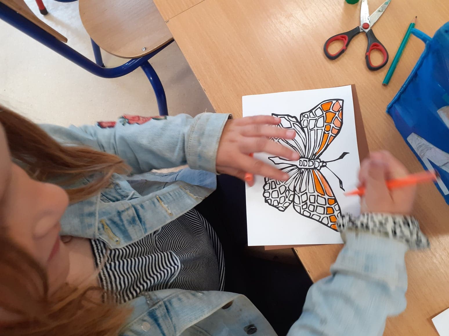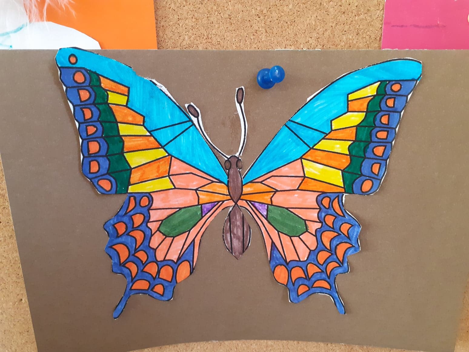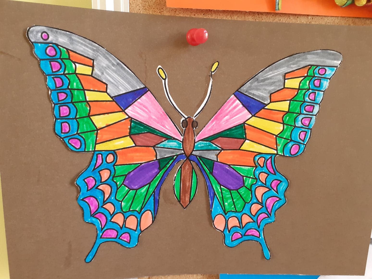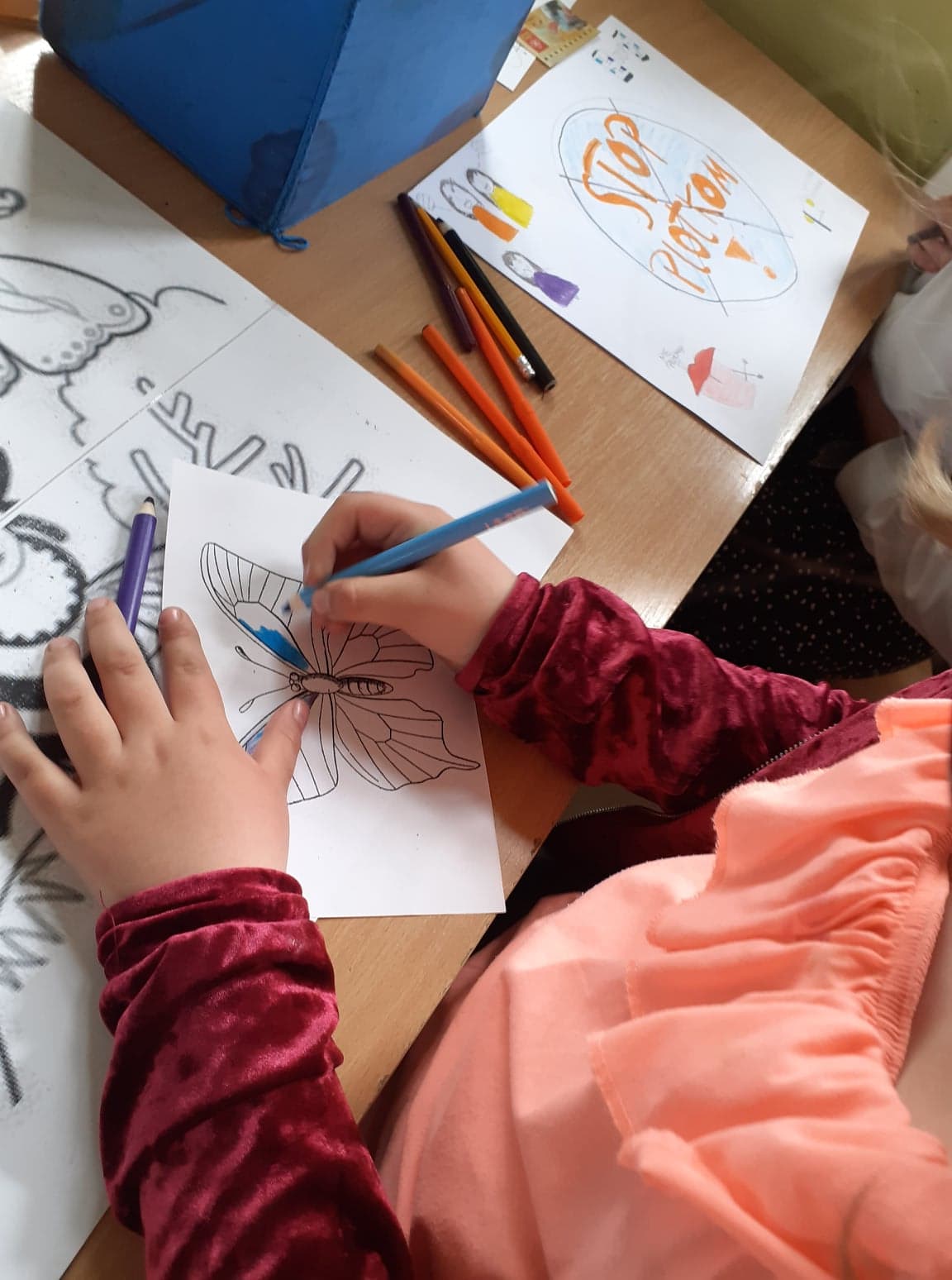 Zgłębiliśmy świat motyli, przede wszystkim tych występujących w Polsce. Poznaliśmy nazwy gatunków, ich wygląd i barwy. W zabawie memory łączyliśmy w pary te same motyle – w różnych ujęciach i otoczeniu. Nie było to takie proste jakby się wydawało, zdarzały nam się pomyłki. Ale i tak całkiem sporo udało nam się zapamiętać. Ponadto poznaliśmy cykl życia motyli oraz ich podział na nocne i dzienne. Nie mogło zabraknąć pracy plastycznej – wykonaliśmy kolorowe motyle, każdy z nas stworzył swój własny, nowy gatunek. Aby ich barwy wyglądały jeszcze piękniej, wycięliśmy je i przykleiliśmy na ciemne tło.