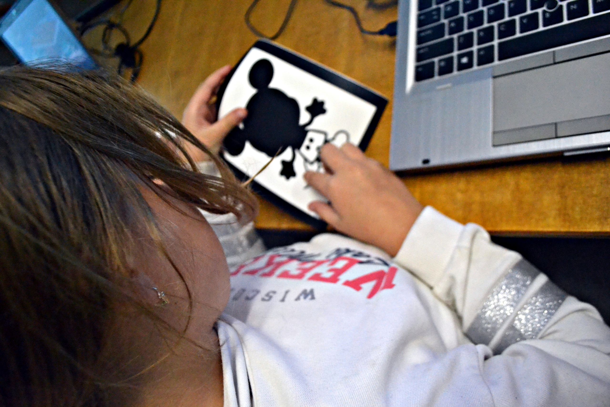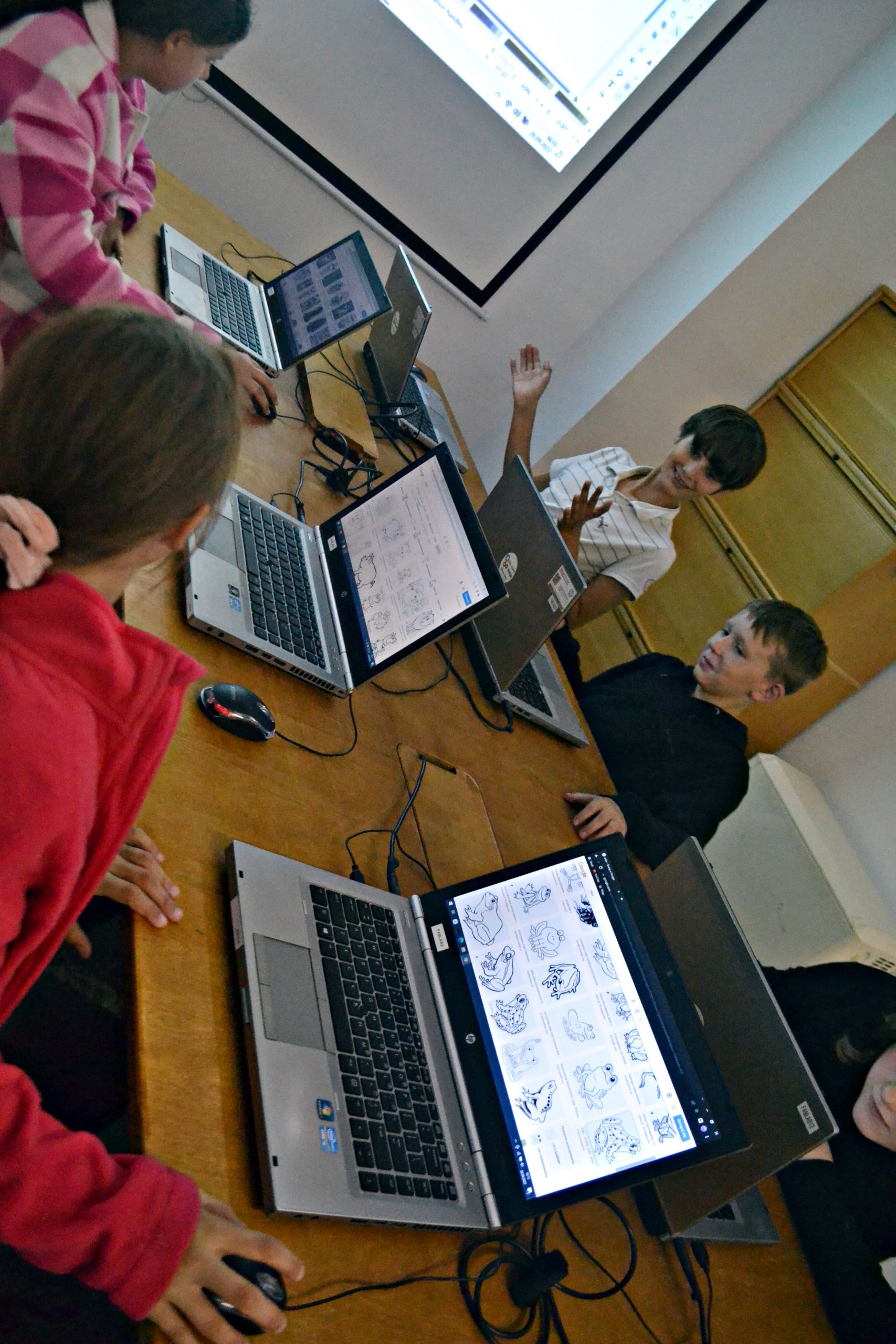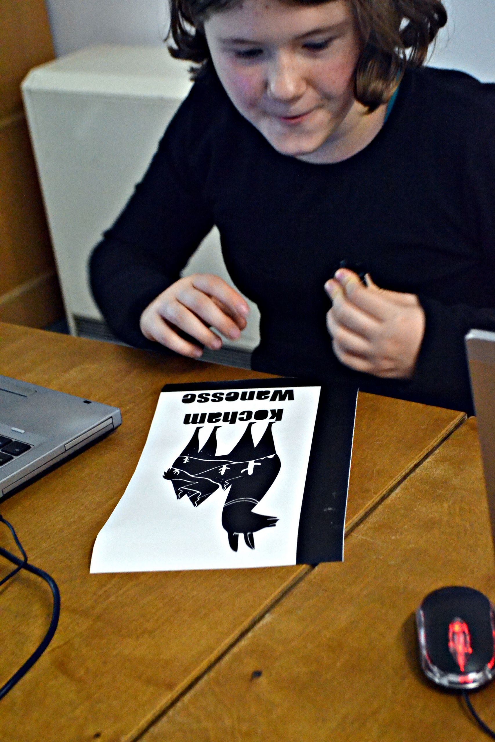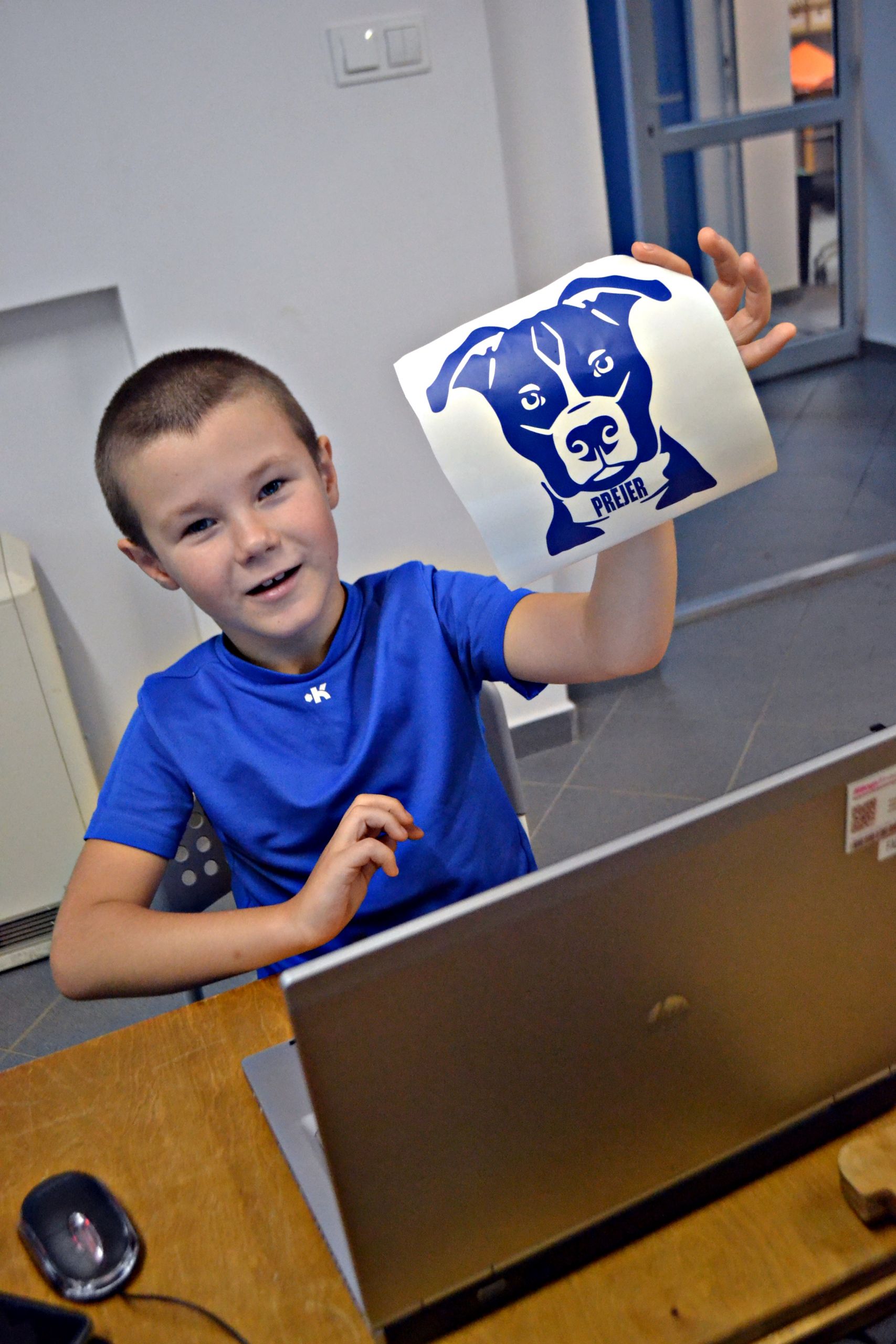 Aż trudno wyjaśnić jak powstały, bo maszyna, która je wykonała ma ciężką do zapamiętania nazwę – ploter. Ale zanim do tego przejdziemy – najpierw wyszukiwaliśmy w sieci grafiki wektorowe, które chcielibyśmy, aby znalazły się na naszych naklejkach. Każdy mógł wyszukać ulubiony przedmiot, zwierzę, postać z bajki. Nie było ważne co wybierzemy, istotny był kształt i dominujący kolor czarny, bo ważne były kontury grafiki. Następnie przeszliśmy do przeniesienia ich do specjalnego programu, gdzie mogliśmy do nich dodawać elementy i napisy. Po wycięciu ich przez ploter, musieliśmy poodklejać zbędne elementy, aby potem nałożyć na to, co zostanie, specjalną folię. I tak zabraliśmy ze sobą do domu żabki, buty, lisy, wilki, amstaffy, lamy i auta, aby następnie przykleić je na ścianach, meblach i innych.