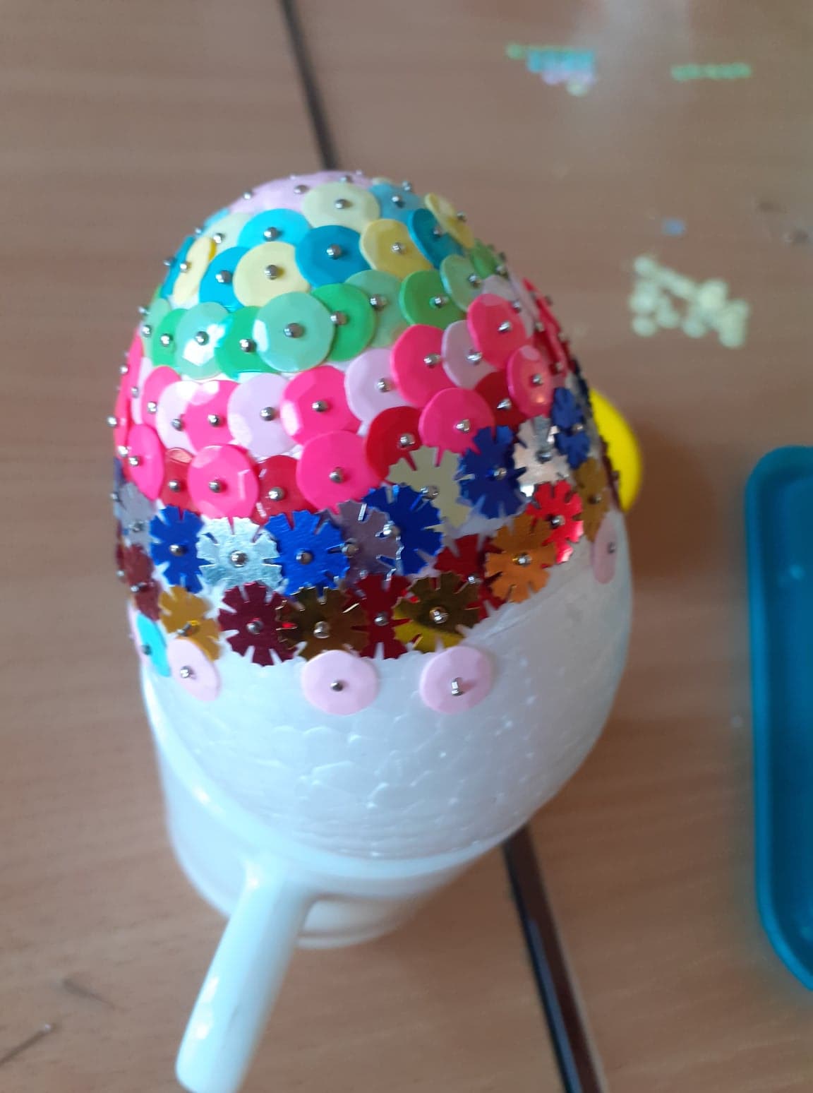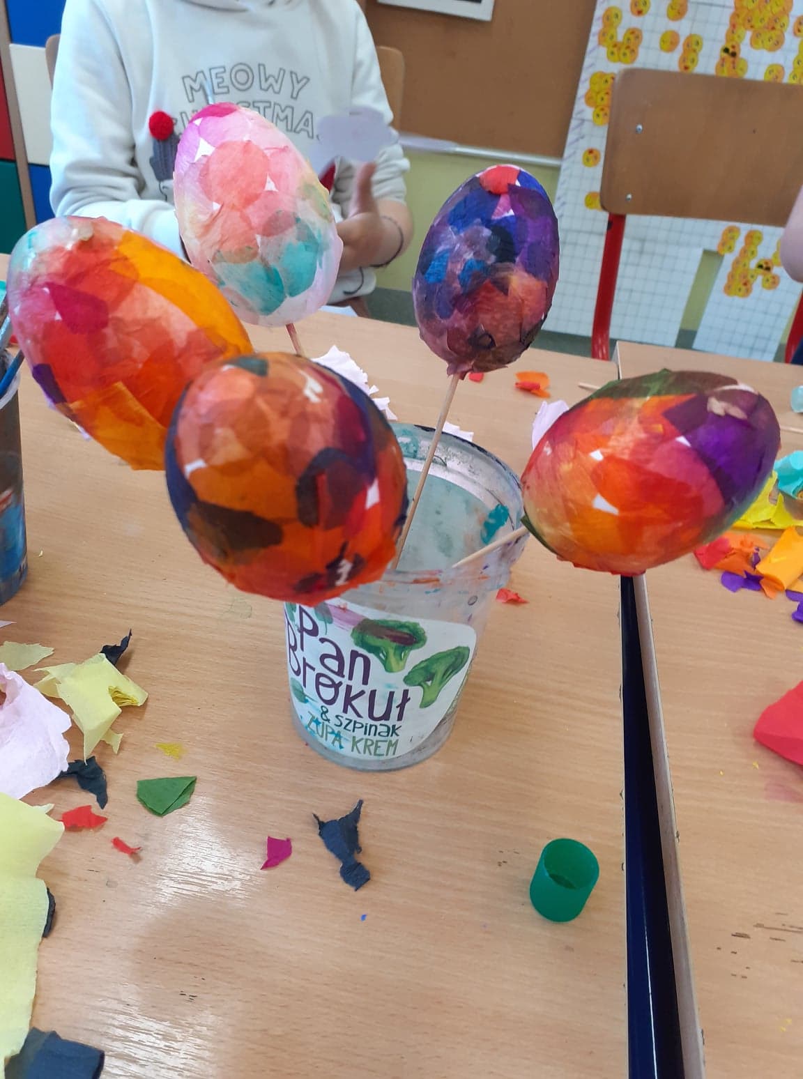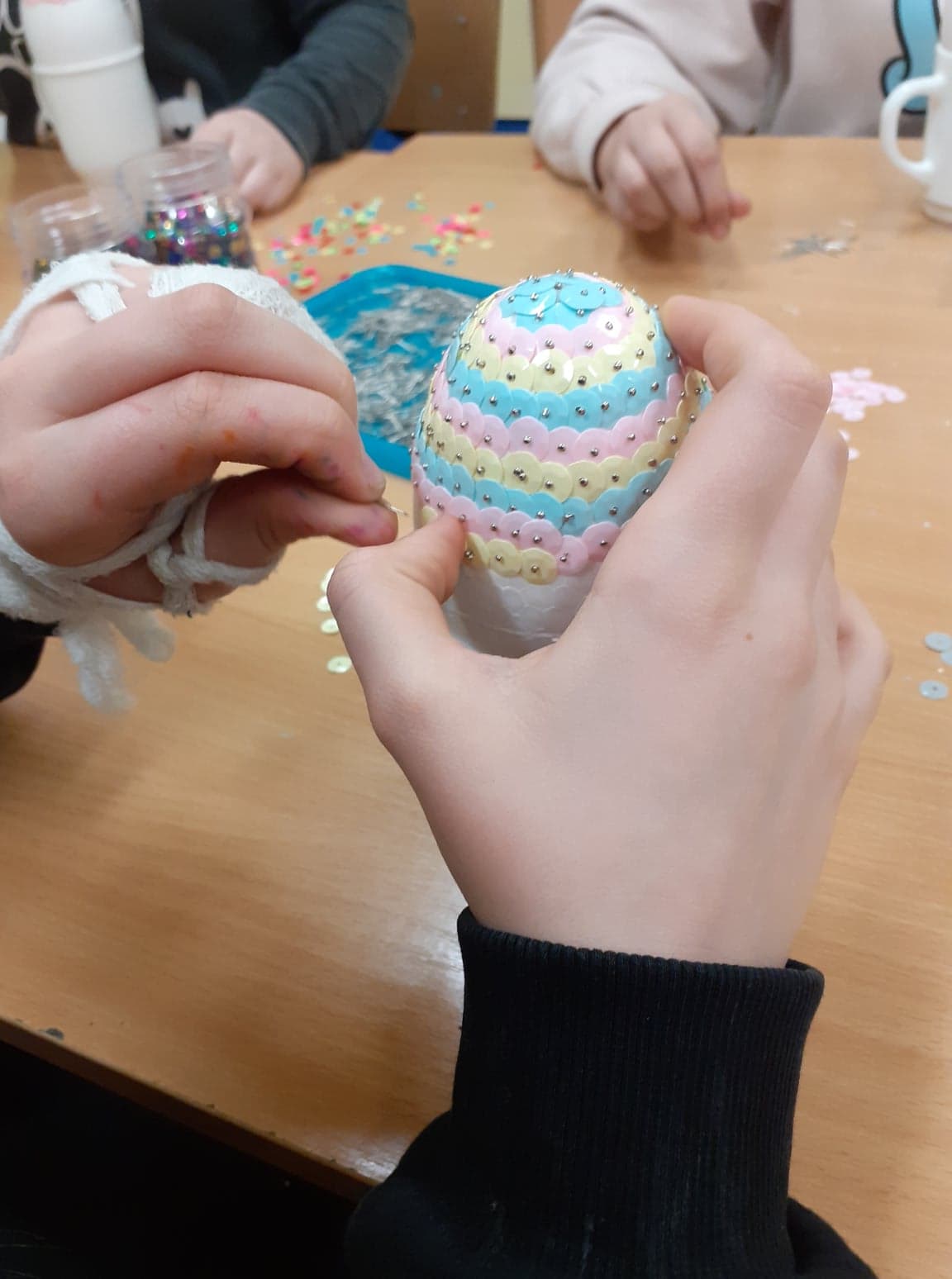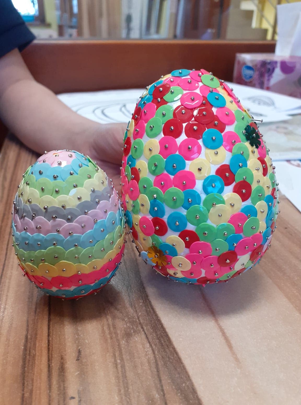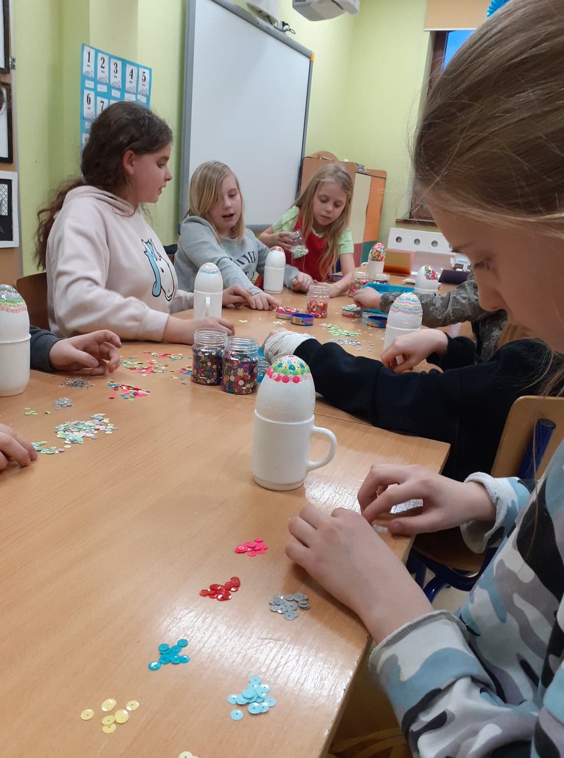 Wielkanoc coraz bliżej. U nas powstały niecodzienne pisanki. Do obu pomysłów wykorzystaliśmy styropianowe jajka, ale technika była zupełnie różna. Pierwsze z nich ozdobiliśmy cekinami. Praca była żmudna, ale efekt zrekompensował ból palców od wbijania szpileczek. Drugie ozdobione zostały kółeczkami kolorowej bibuły. Przyklejaliśmy je rozcieńczonym w wodzie klejem, dzięki czemu barwy przenikały się wzajemnie na powierzchni, tworząc wyjątkowe jajka.