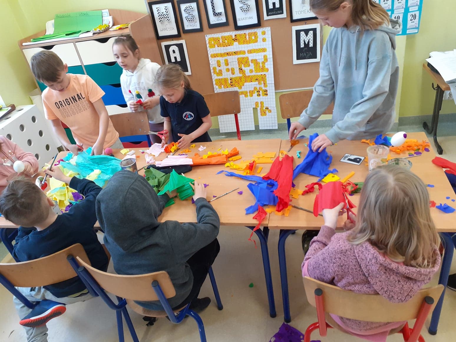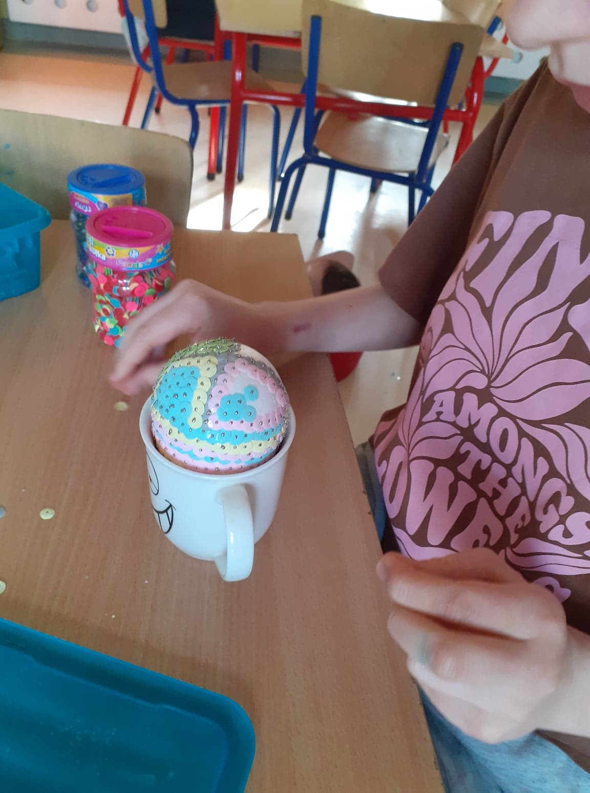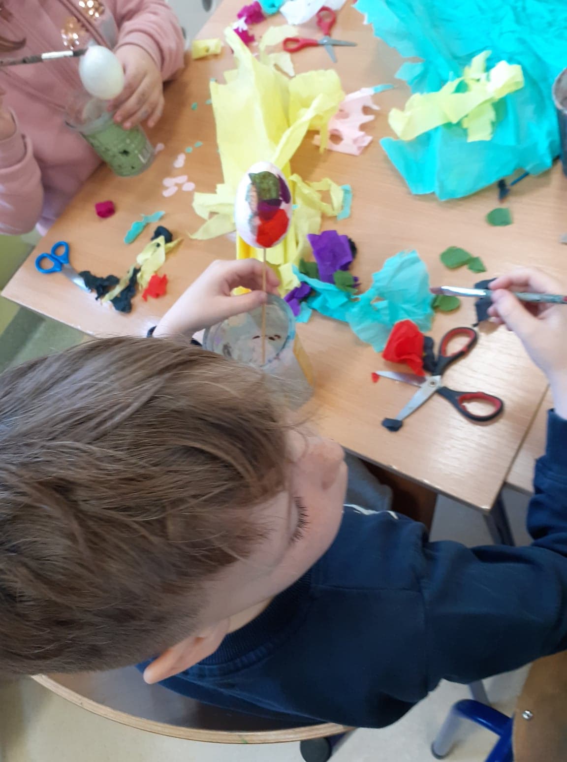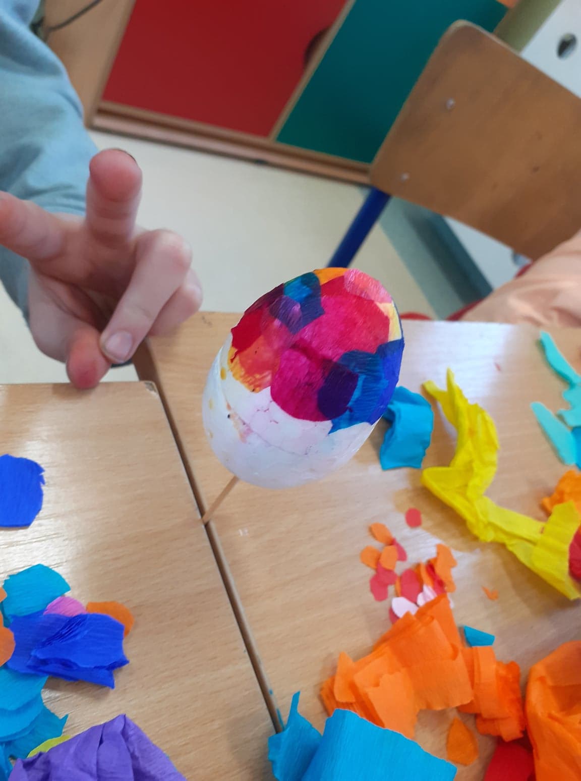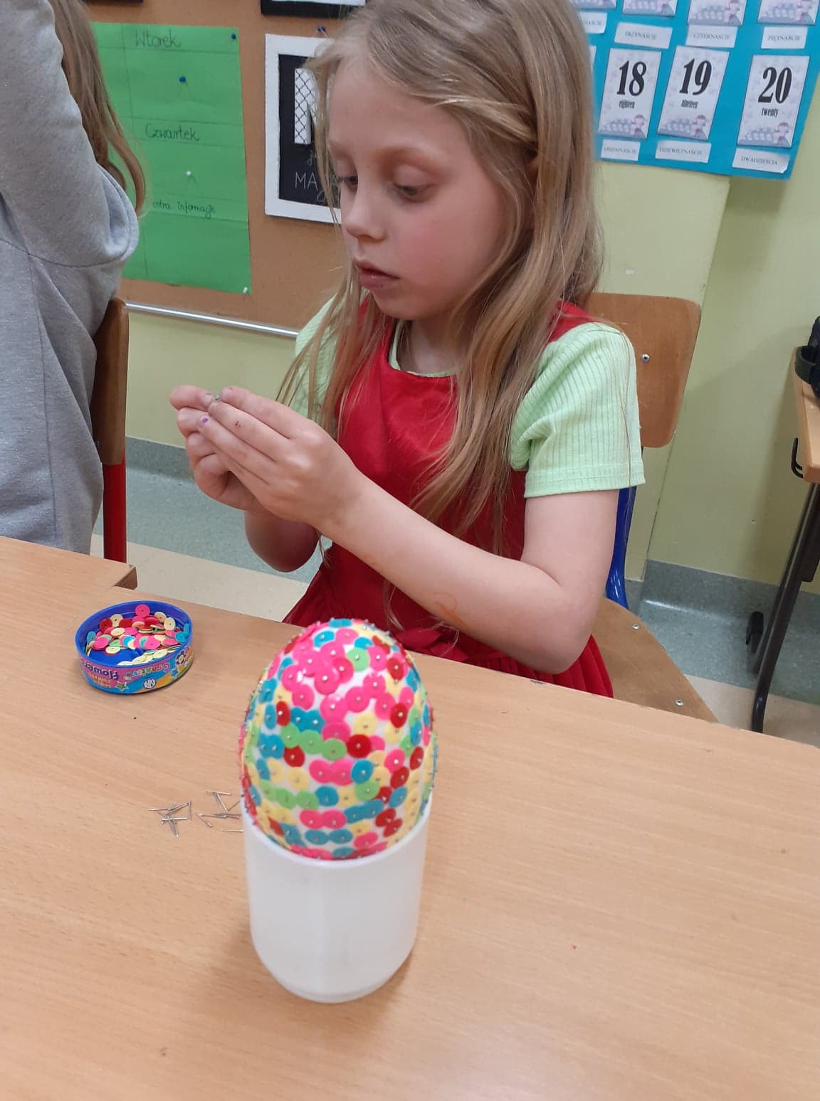 Wielkanoc coraz bliżej. U nas powstały niecodzienne pisanki. Do obu pomysłów wykorzystaliśmy styropianowe jajka, ale technika była zupełnie różna. Pierwsze z nich ozdobiliśmy cekinami. Praca była żmudna, ale efekt zrekompensował ból palców od wbijania szpileczek. Drugie ozdobione zostały kółeczkami kolorowej bibuły. Przyklejaliśmy je rozcieńczonym w wodzie klejem, dzięki czemu barwy przenikały się wzajemnie na powierzchni, tworząc wyjątkowe jajka.