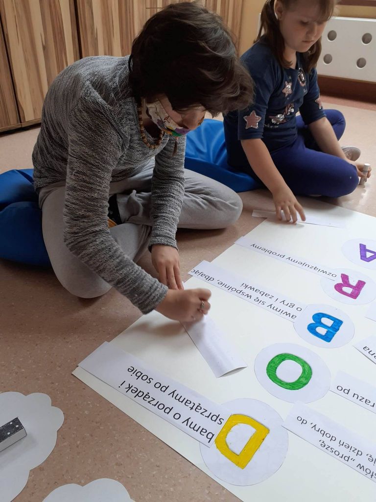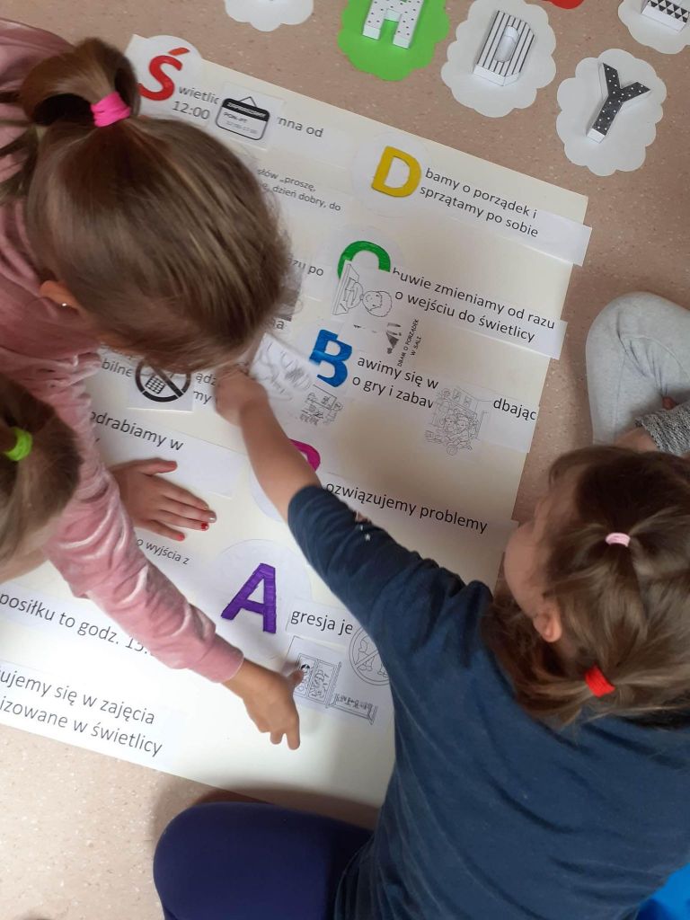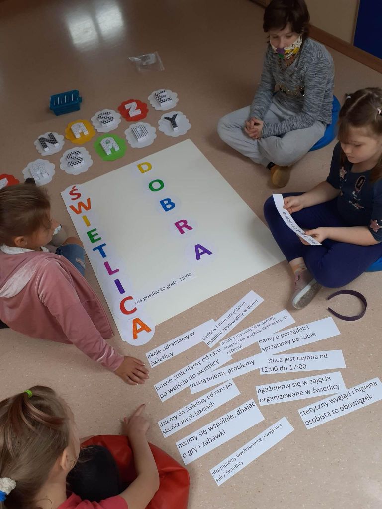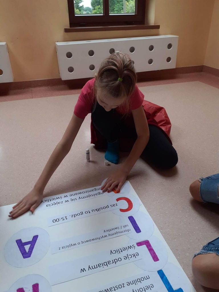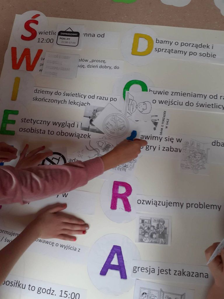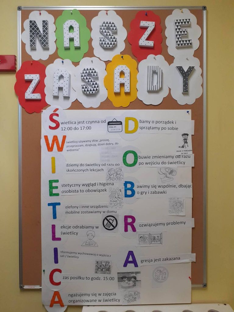 Po tym jak powspominaliśmy wakacje, przyszedł czas na przypomnienie sobie świetlicowych zasad. Dziewczynki przygotowały kolorową, ale zarazem czytelną planszę z regułami obowiązującymi w naszej placówce. Pojawiła się także wersja obrazkowa – dla tych dzieci, które czytać jeszcze nie potrafią. Teraz wiemy, że nasze zasady są po to, aby bawić się i pracować efektywnie, sprawnie, bezpiecznie, spokojnie. Teraz pozostaje nam się do nich stosować, aby czas spędzony w świetlicy przebiegał w atmosferze miłej i przyjaznej dla wszystkich z nas.