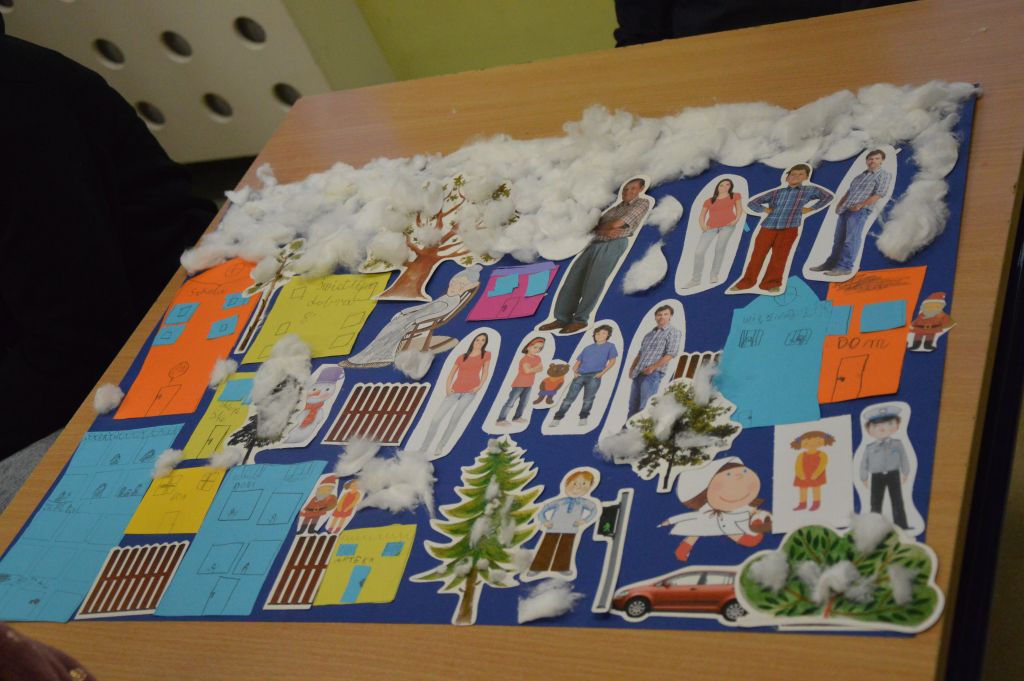 Drzewa, domy, ludzie – staraliśmy się jak najlepiej odwzorować naszą najbliższą okolicę. Na makiecie znalazła się szkoła, kościół, sklepy, nasze domy, nawet komisariat policji. Nie zapomnieliśmy i o naszej Świetlicy Dobrej, która obowiązkowo musiała się znaleźć na planie miasta.