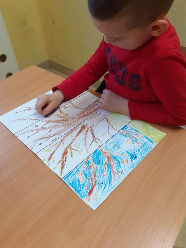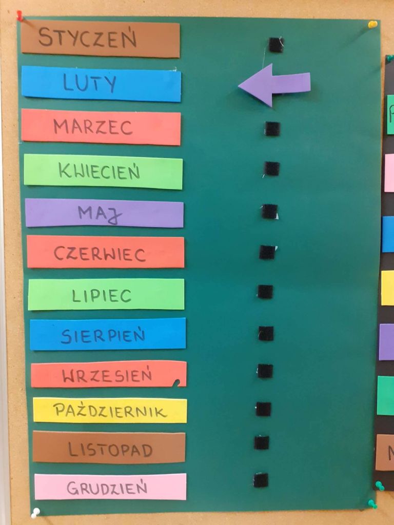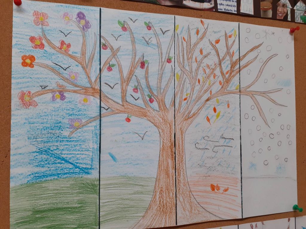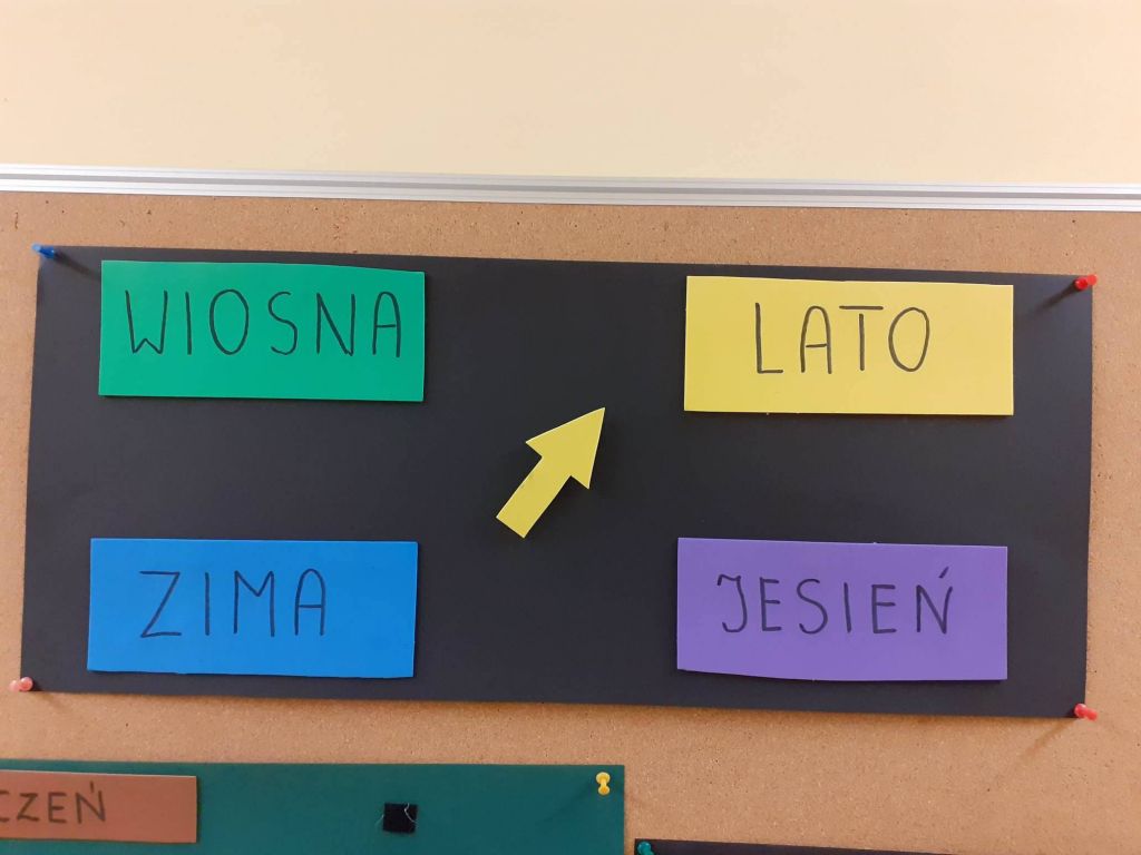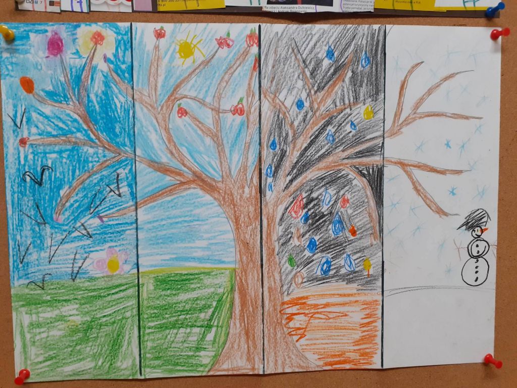 A u nas zmiana wystroju. Julia wyjechała, więc tablica hiszpańska zniknęła, zastąpiła ją nowa, która pomoże nam utrwalić sobie kolejność pór roku, miesięcy i dni tygodnia. Jak zwykle nauka połączona z przyjemnością, bo narysowaliśmy też jedno drzewo w 4 odsłonach – każda dopasowana do charakteru danej pory roku.