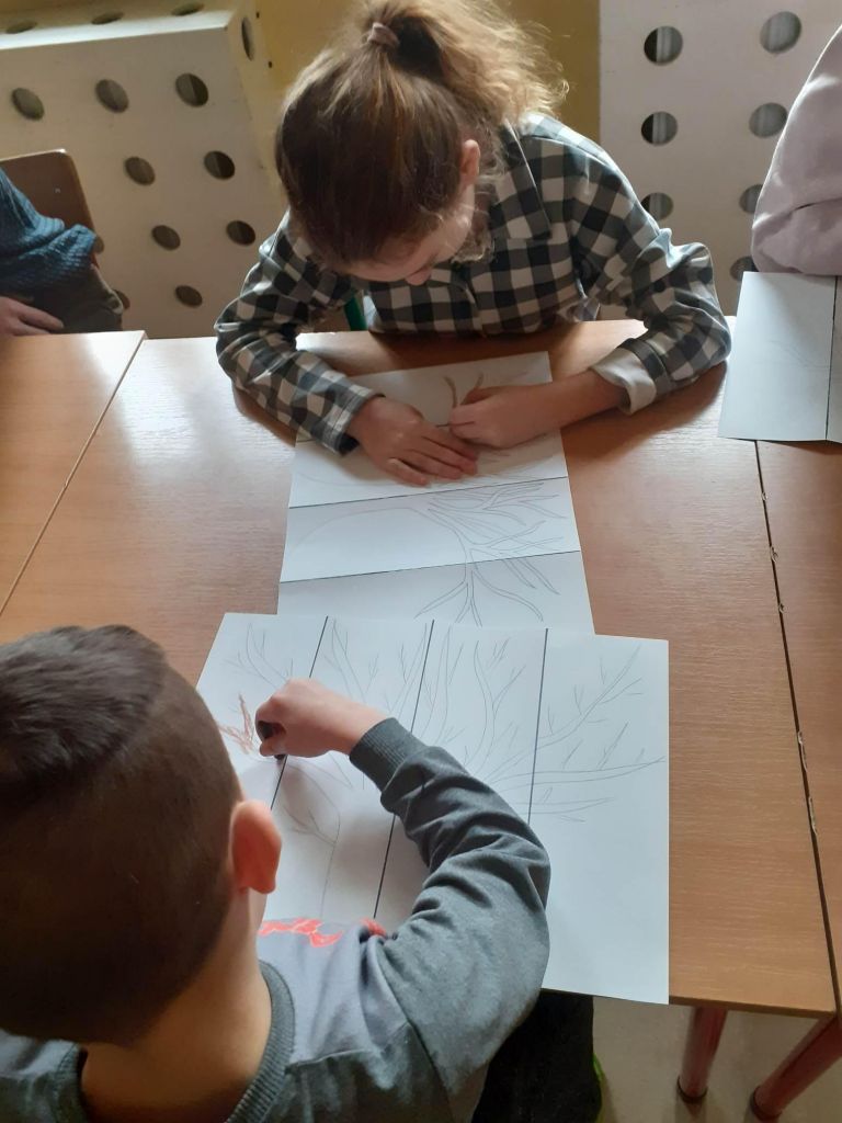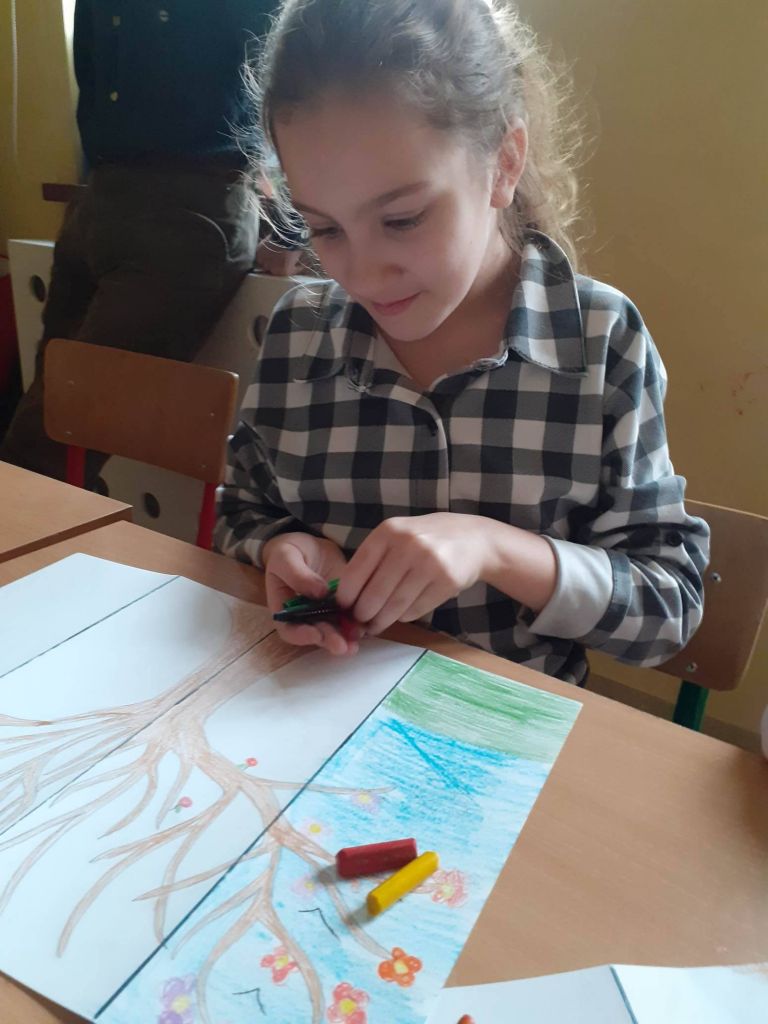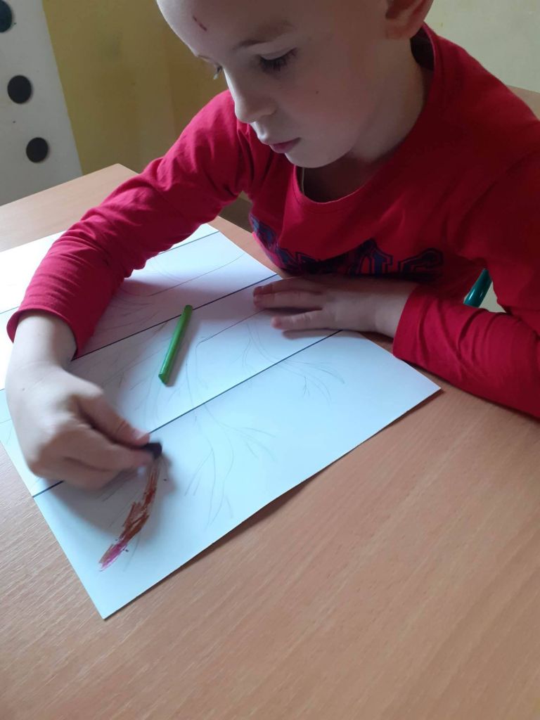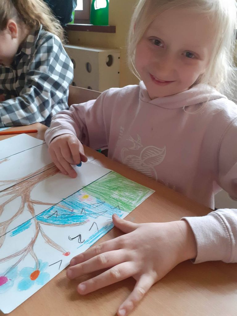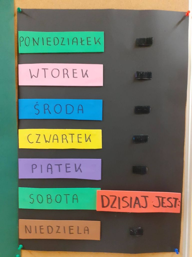 A u nas zmiana wystroju. Julia wyjechała, więc tablica hiszpańska zniknęła, zastąpiła ją nowa, która pomoże nam utrwalić sobie kolejność pór roku, miesięcy i dni tygodnia. Jak zwykle nauka połączona z przyjemnością, bo narysowaliśmy też jedno drzewo w 4 odsłonach – każda dopasowana do charakteru danej pory roku.