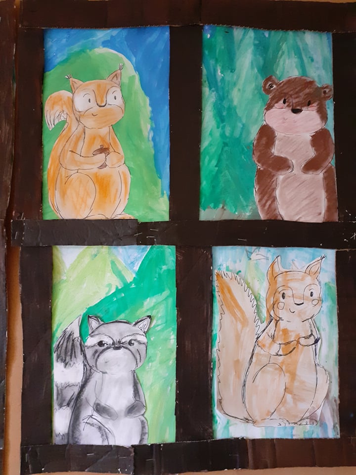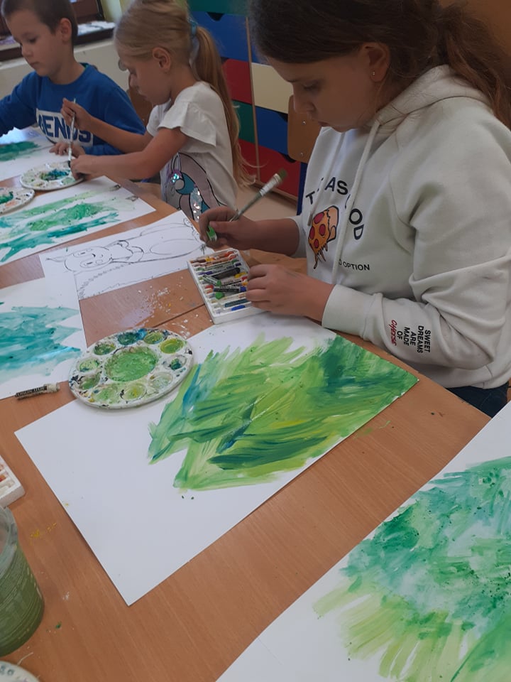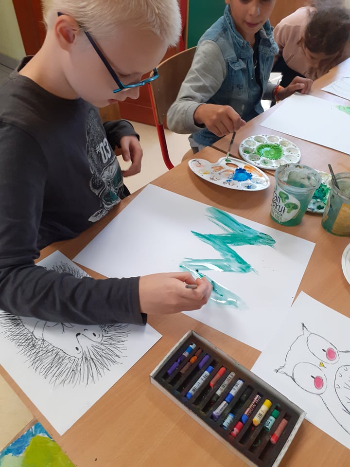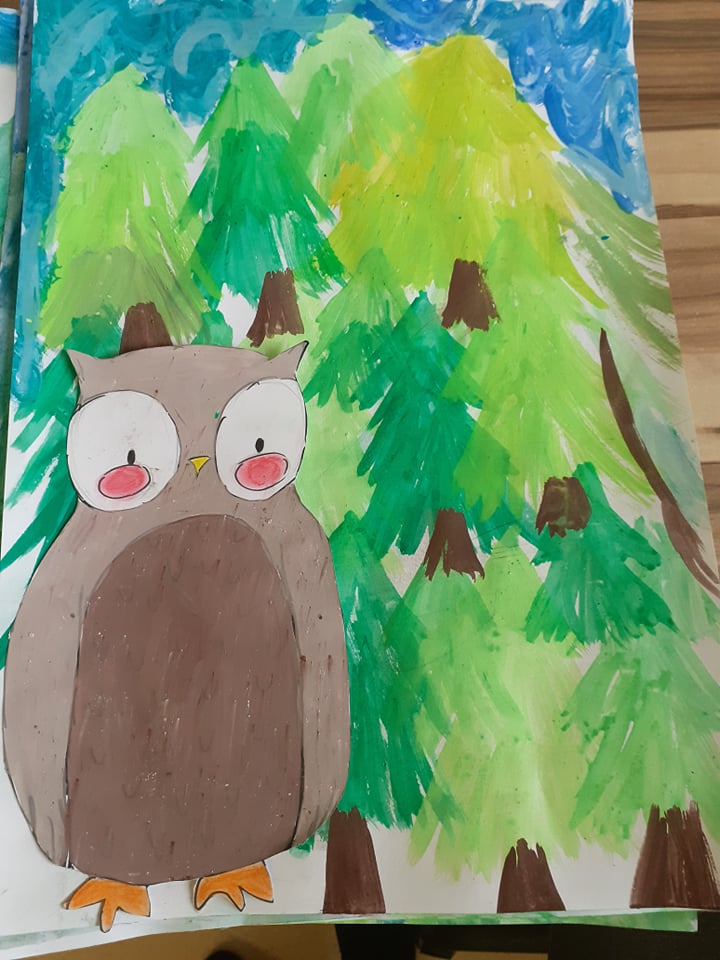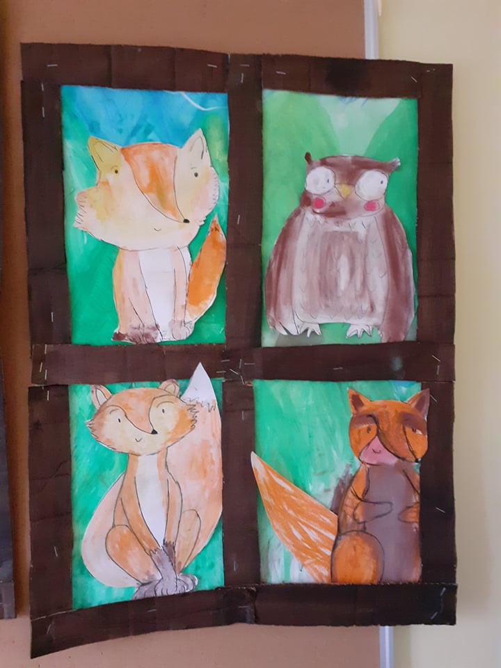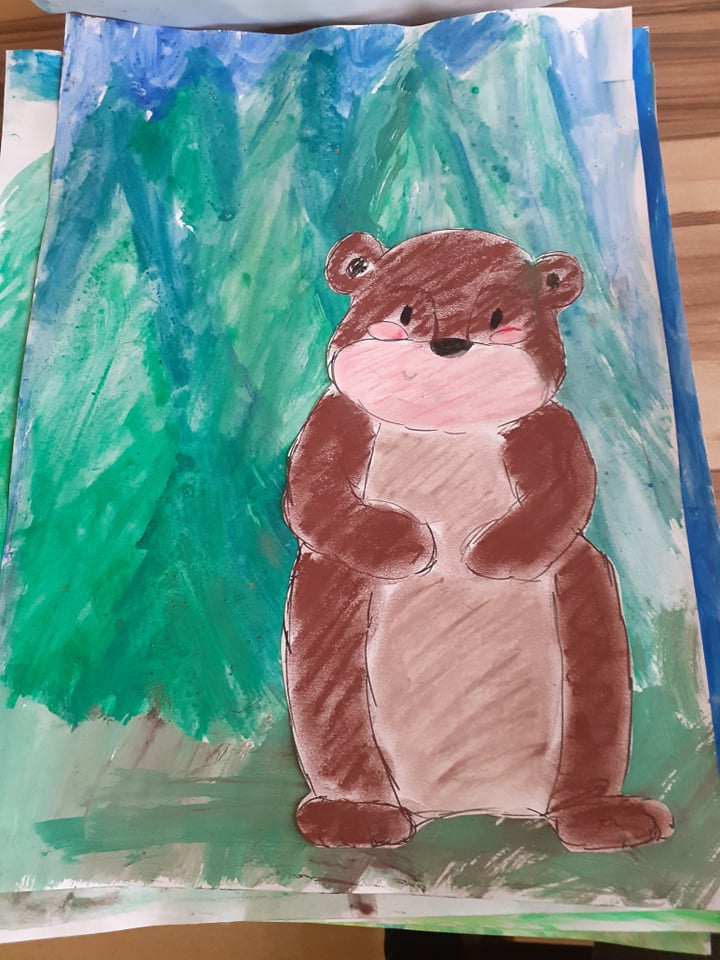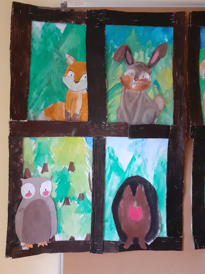 Ostatnio pracowaliśmy nad nową wrześniową gazetką. Wynikiem naszych wysiłków są okna, przez które można podglądać życie leśnych zwierząt. Przy tej okazji bardziej zaprzyjaźniliśmy się z pastelami, z których w całości wykonaliśmy nasze dzieła. Okazało się, że suche pastele mogą również zamienić się w farby, jeśli tylko się je pokruszy i połączy z odrobiną wody. W międzyczasie wchodzimy też już powoli w tematykę jesienną i wykonujemy prace z tym związane, ale na efekty trzeba jeszcze chwilkę poczekać.
