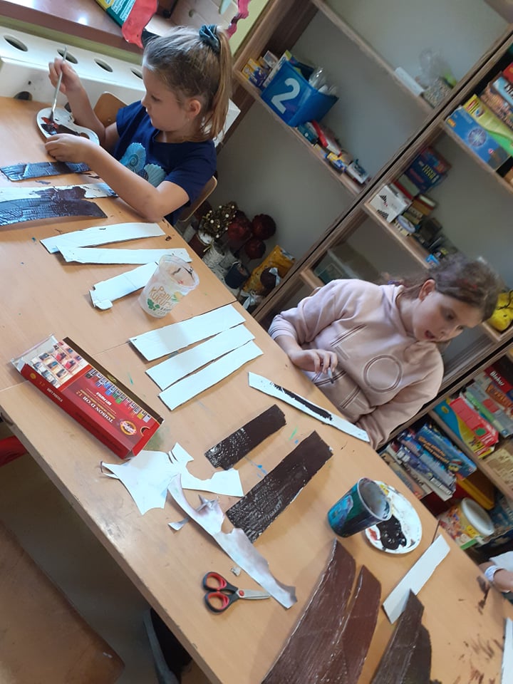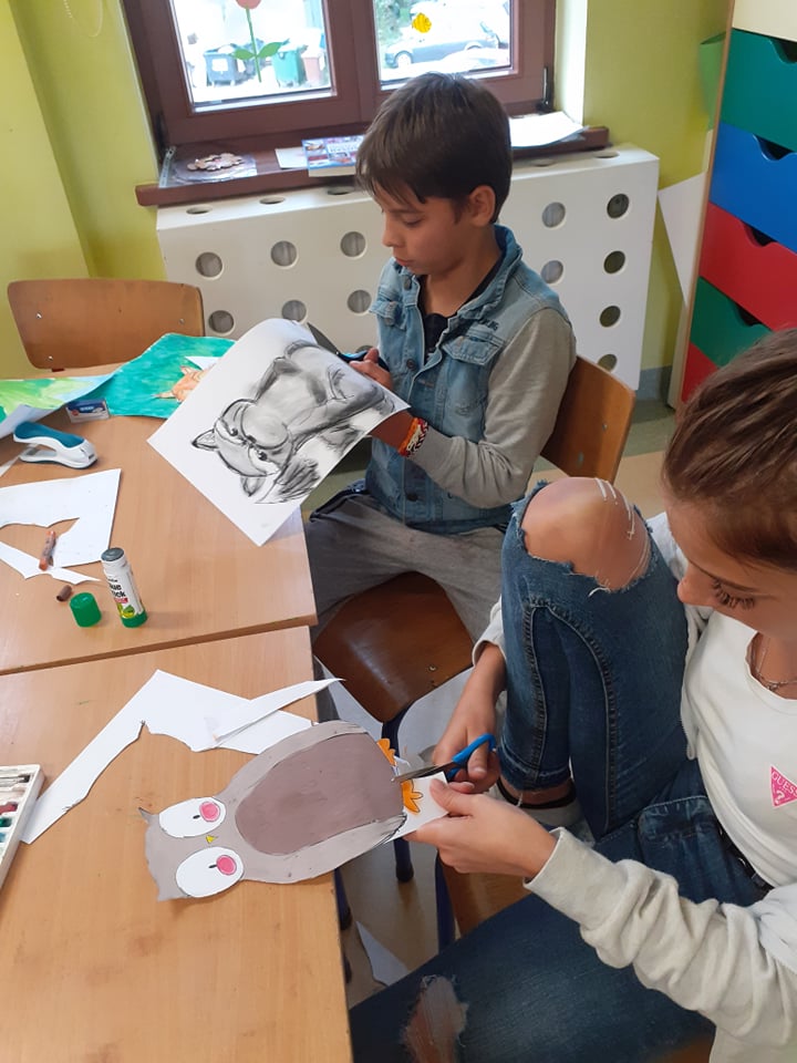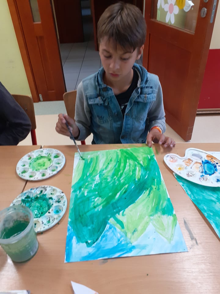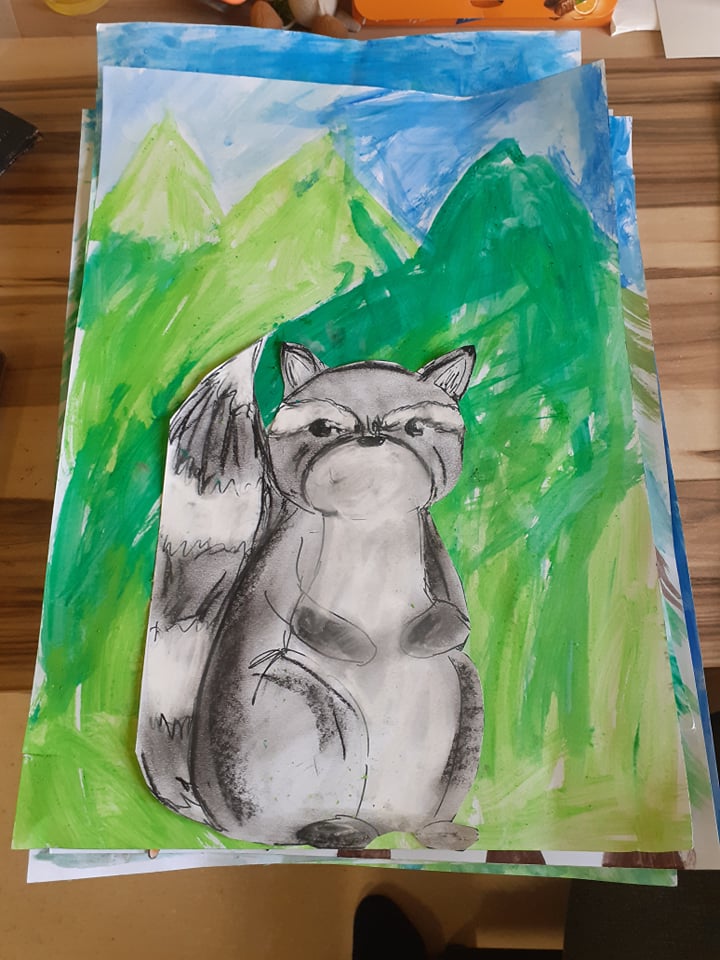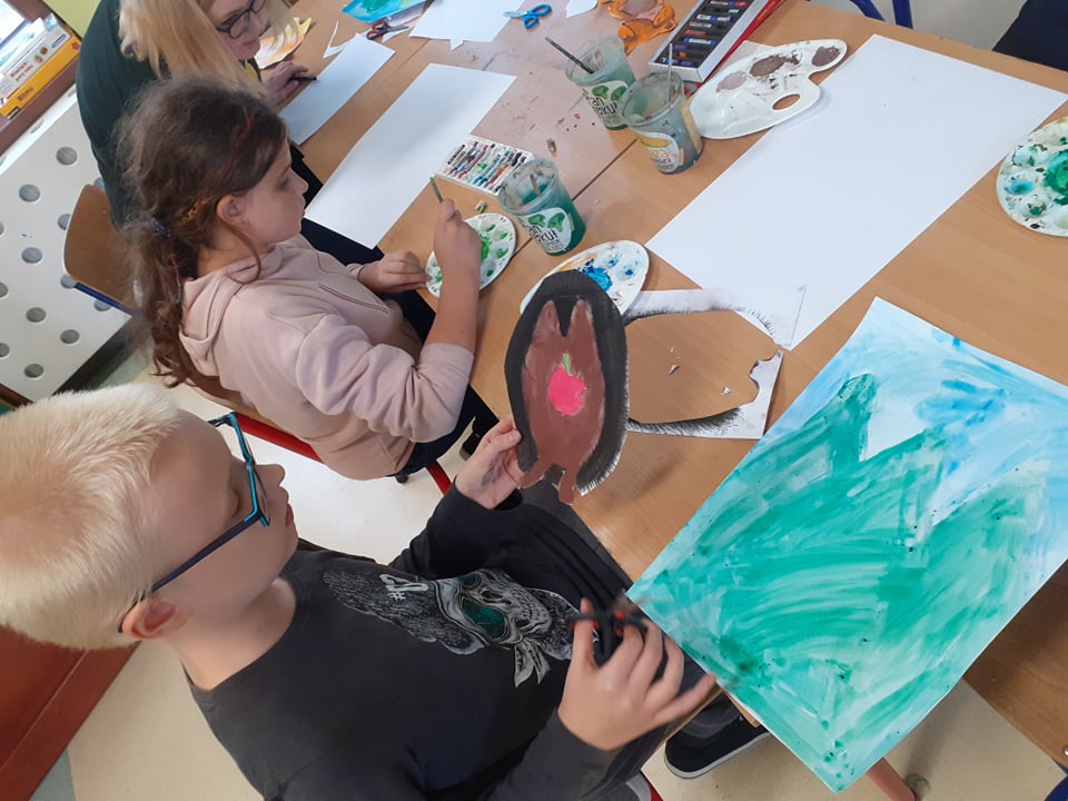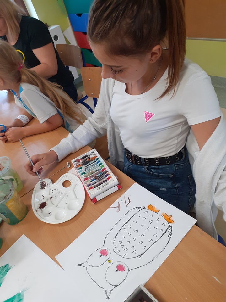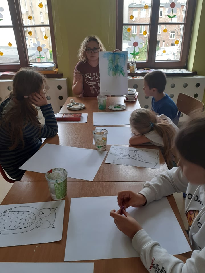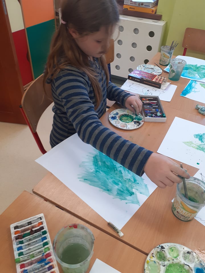 Ostatnio pracowaliśmy nad nową wrześniową gazetką. Wynikiem naszych wysiłków są okna, przez które można podglądać życie leśnych zwierząt. Przy tej okazji bardziej zaprzyjaźniliśmy się z pastelami, z których w całości wykonaliśmy nasze dzieła. Okazało się, że suche pastele mogą również zamienić się w farby, jeśli tylko się je pokruszy i połączy z odrobiną wody. W międzyczasie wchodzimy też już powoli w tematykę jesienną i wykonujemy prace z tym związane, ale na efekty trzeba jeszcze chwilkę poczekać.