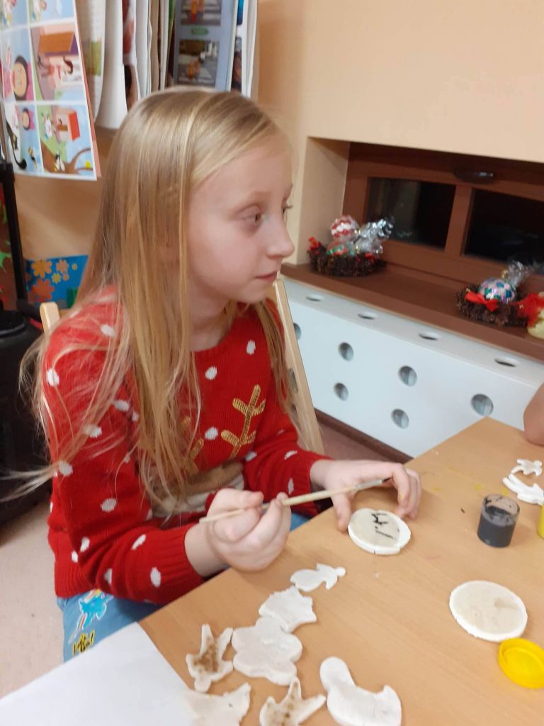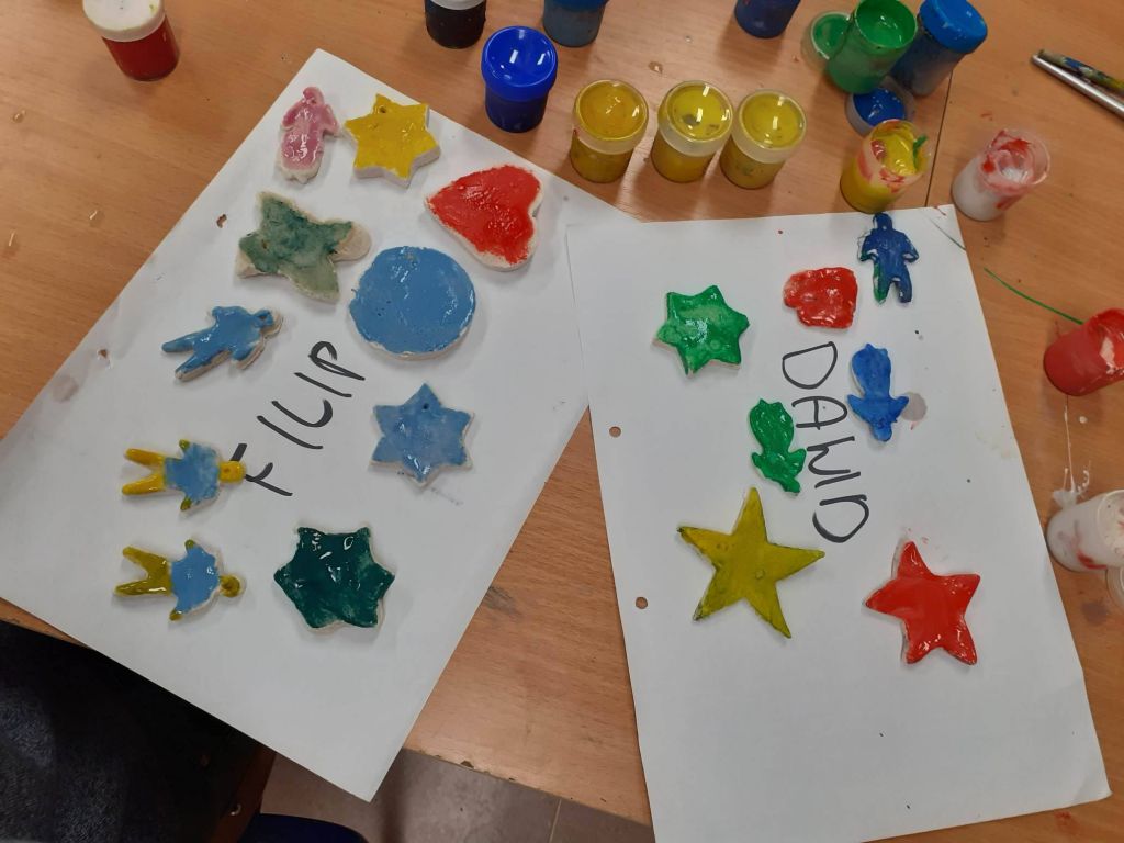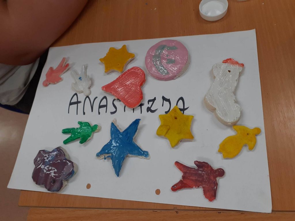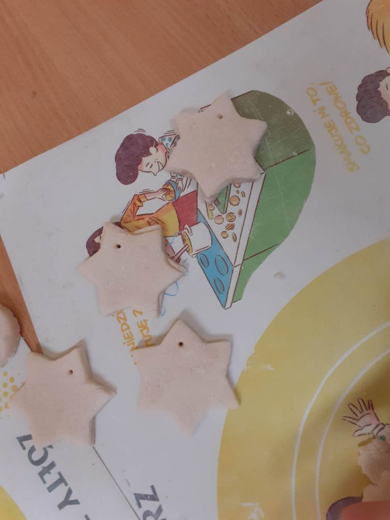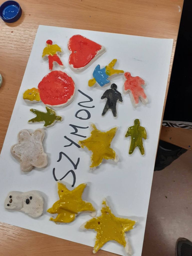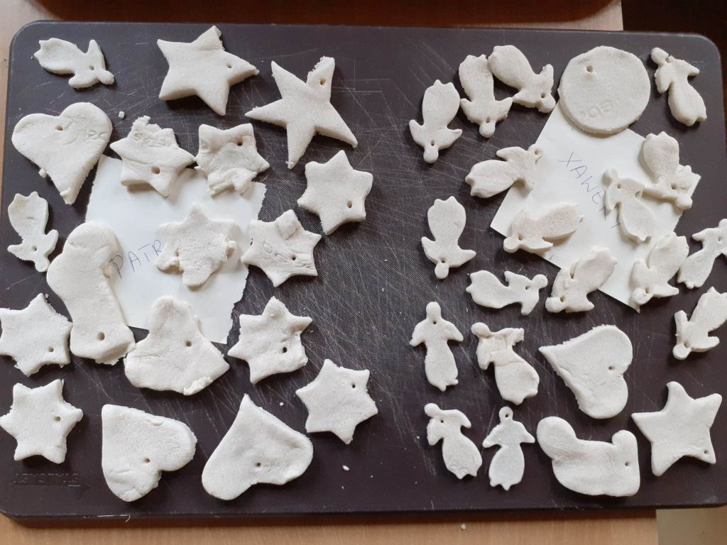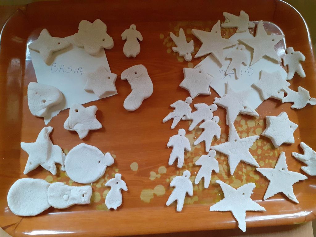 Efekt naszych dwóch dni pracy – ozdoby choinkowe z masy solnej. Wykrajanie kształtów i malowanie ich farbami to była sama przyjemność. A jaka będzie satysfakcja, kiedy już zawisną na naszych choinkach. Przecież bożonarodzeniowe drzewko ubrane we własnoręcznie wykonane dekoracje cieszy najbardziej!