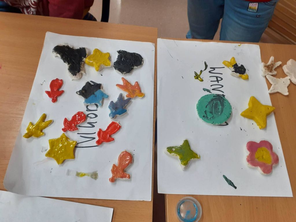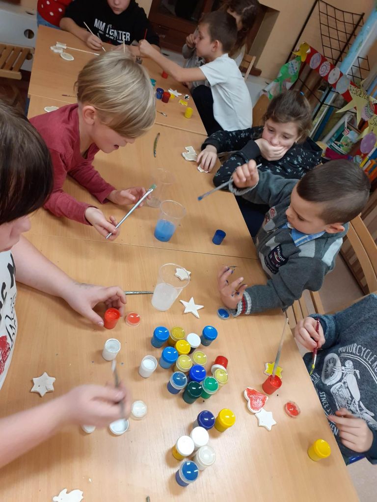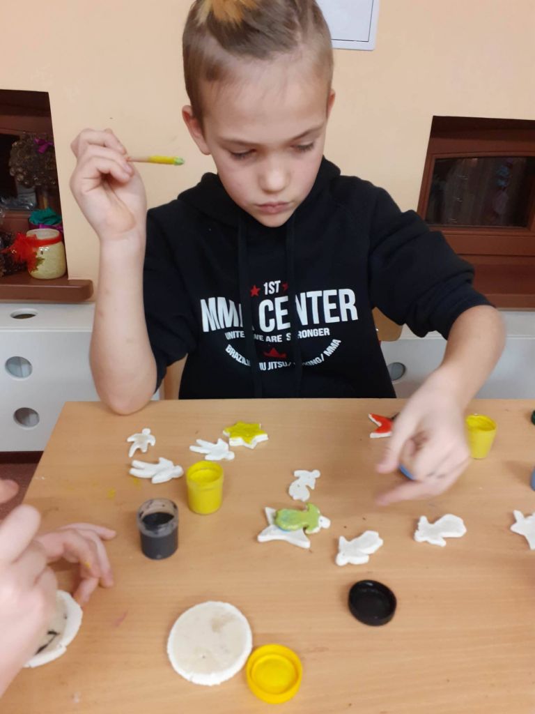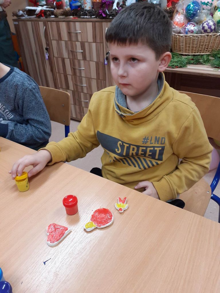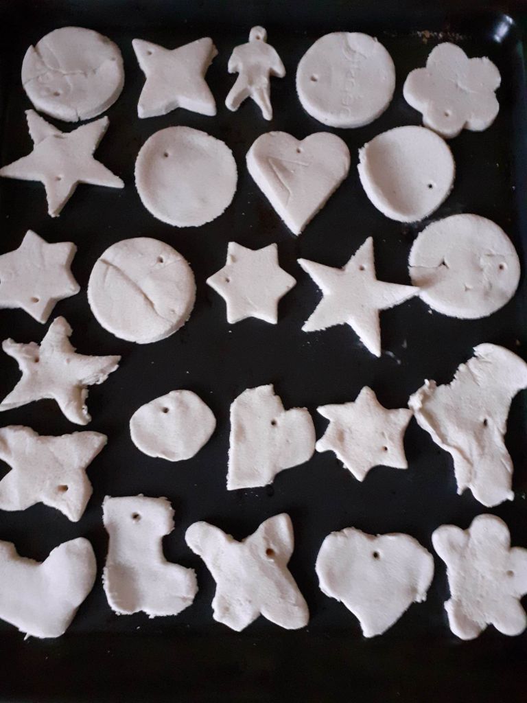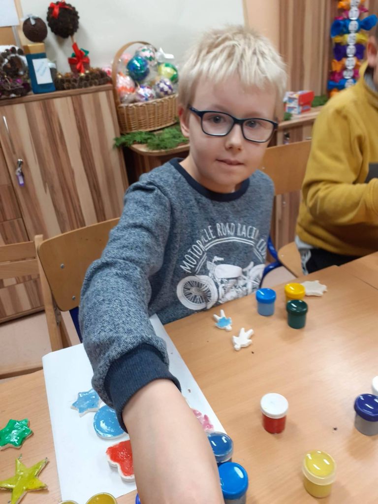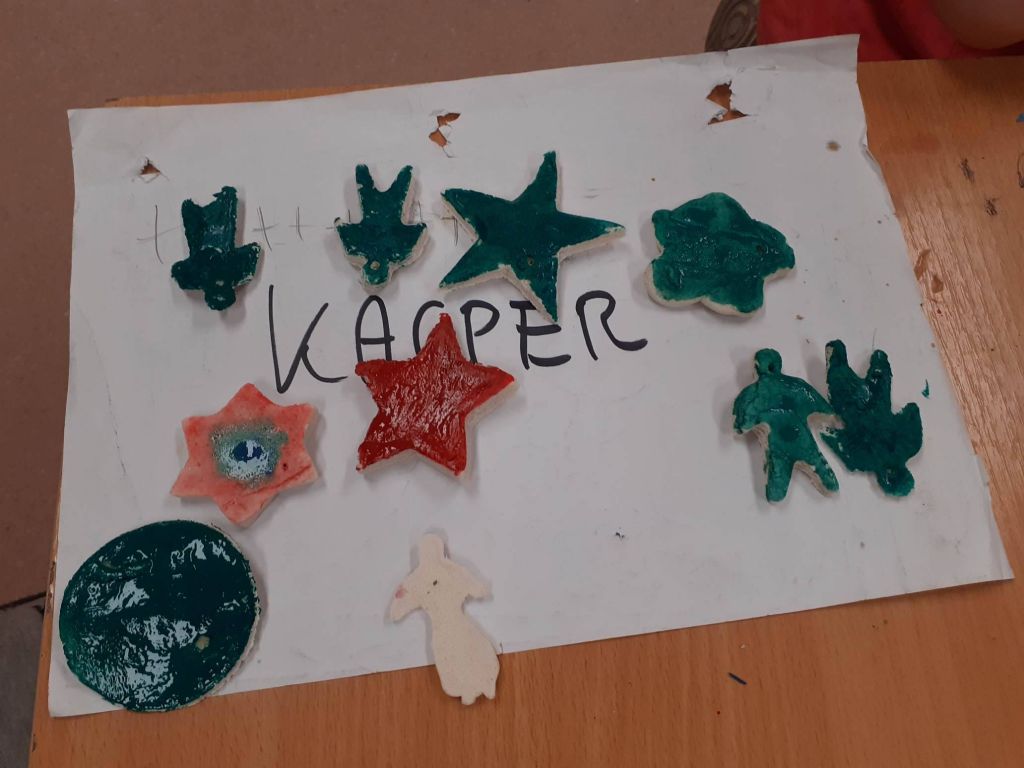 Efekt naszych dwóch dni pracy – ozdoby choinkowe z masy solnej. Wykrajanie kształtów i malowanie ich farbami to była sama przyjemność. A jaka będzie satysfakcja, kiedy już zawisną na naszych choinkach. Przecież bożonarodzeniowe drzewko ubrane we własnoręcznie wykonane dekoracje cieszy najbardziej!