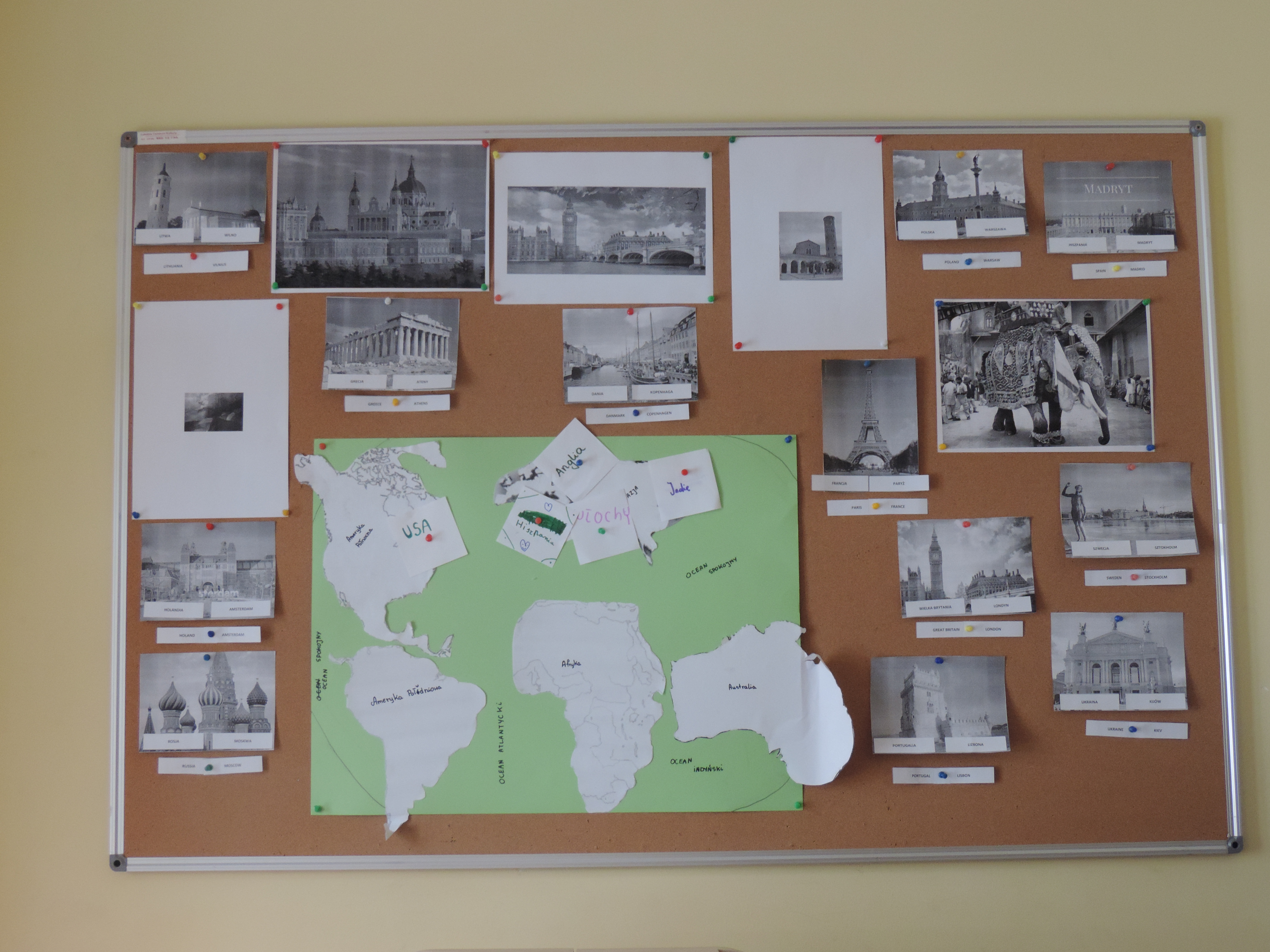 Kilka ostatnich dni spędziliśmy na podróżach – palcem po mapie. Tworzyliśmy uproszczoną mapę świata i zaznaczyliśmy na niej miejsca, które chcielibyśmy odwiedzić. Później nadszedł czas na przekonanie innych do wspólnej wycieczki do wybranego przez nas państwa – stworzyliśmy więc prezentacje multimedialne, w których opowiedzieliśmy o walorach Hiszpanii, USA, Włoch, Indii i Wielkiej Brytanii. Zajęcia z angielskiego również zostały zachowane w klimacie podróży – przypomnieliśmy sobie nazwy niektórych z europejskich państw i ich stolic.