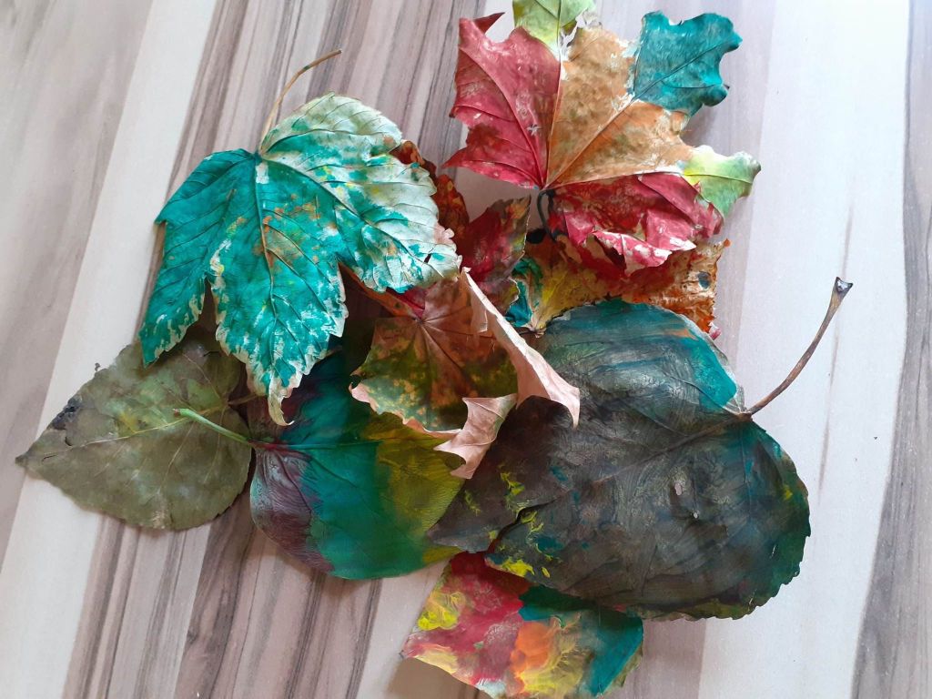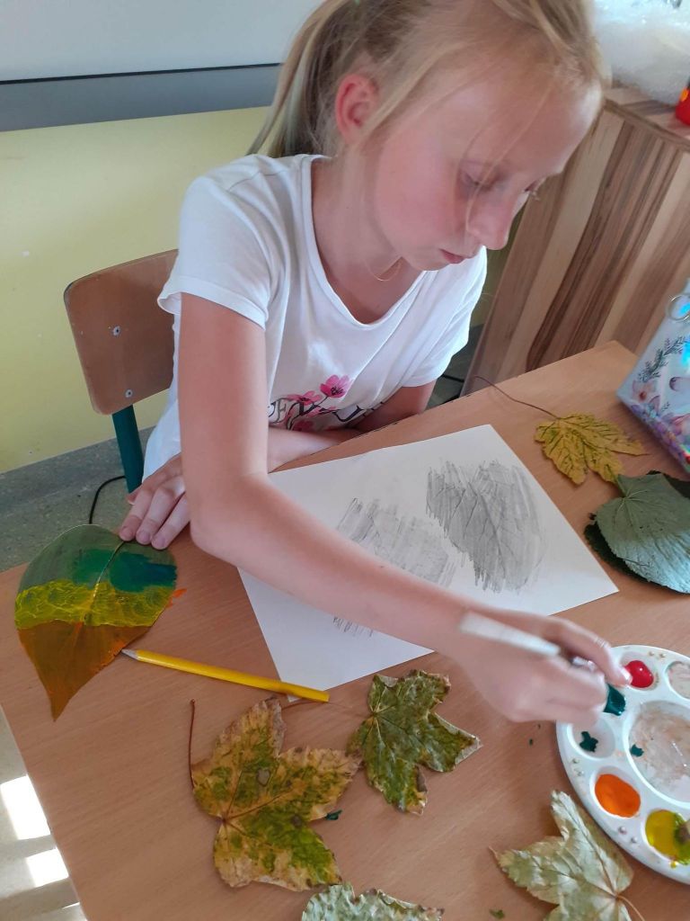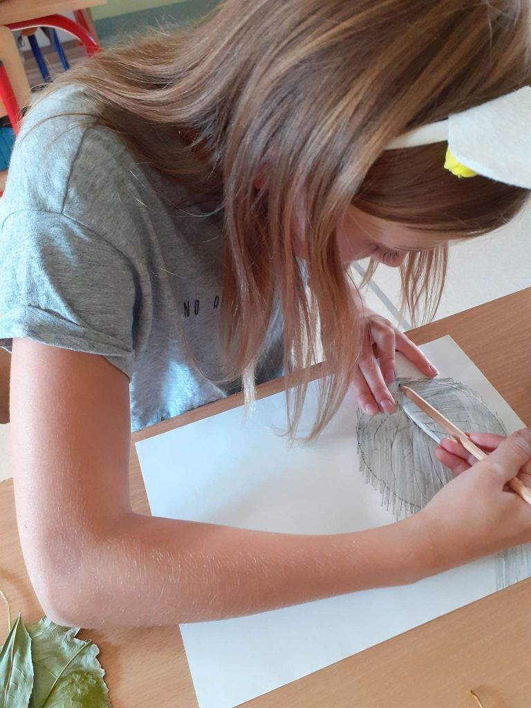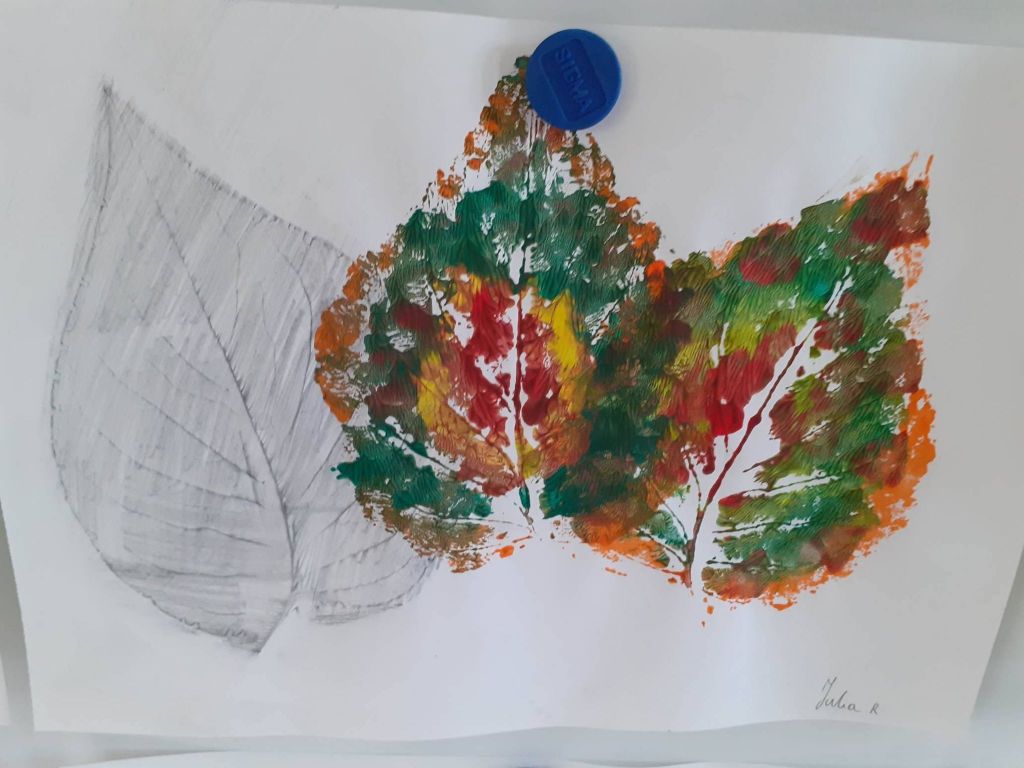 W dniu spadającego liścia nie mogło zabraknąć pracy z liściem w roli głównej. Poszliśmy na spacer, zebraliśmy liście, a następnie odrysowaliśmy je ołówkiem na kartce. Jednak aby praca nie była taka czarno-biała, pomalowaliśmy je różnymi kolorami i odbiliśmy obok.