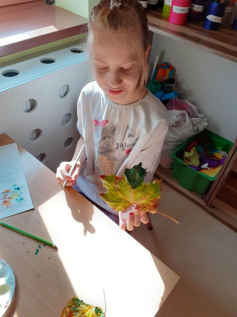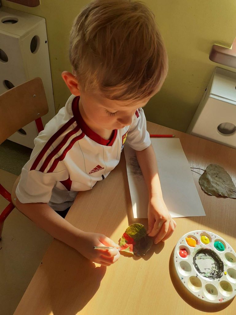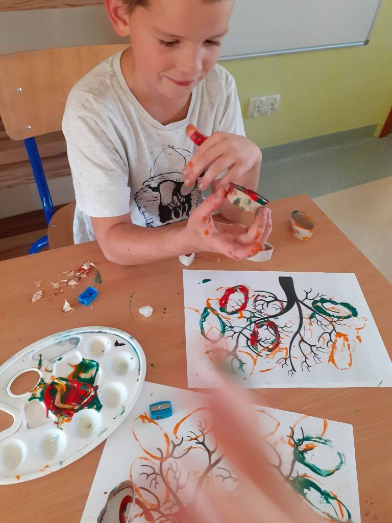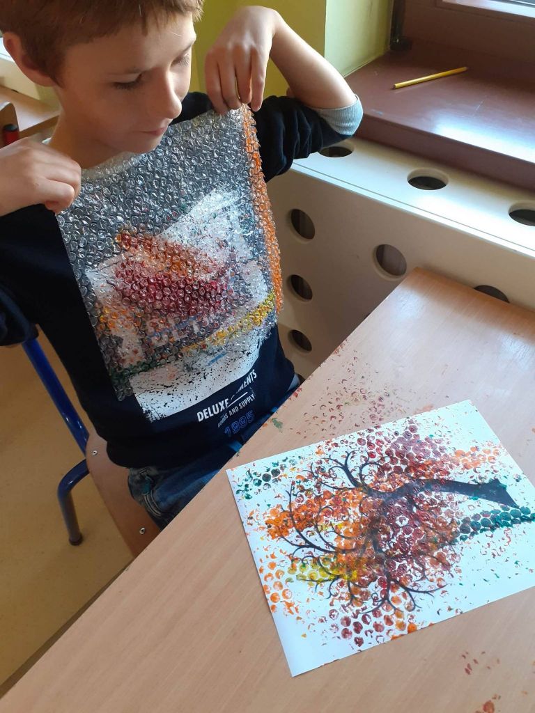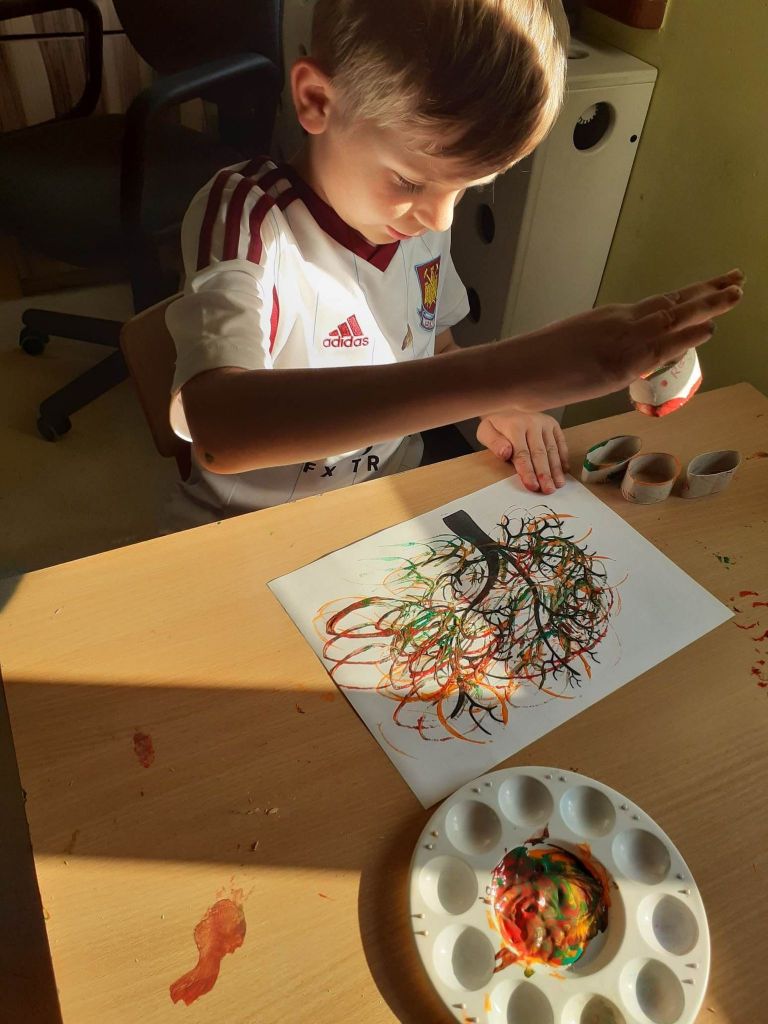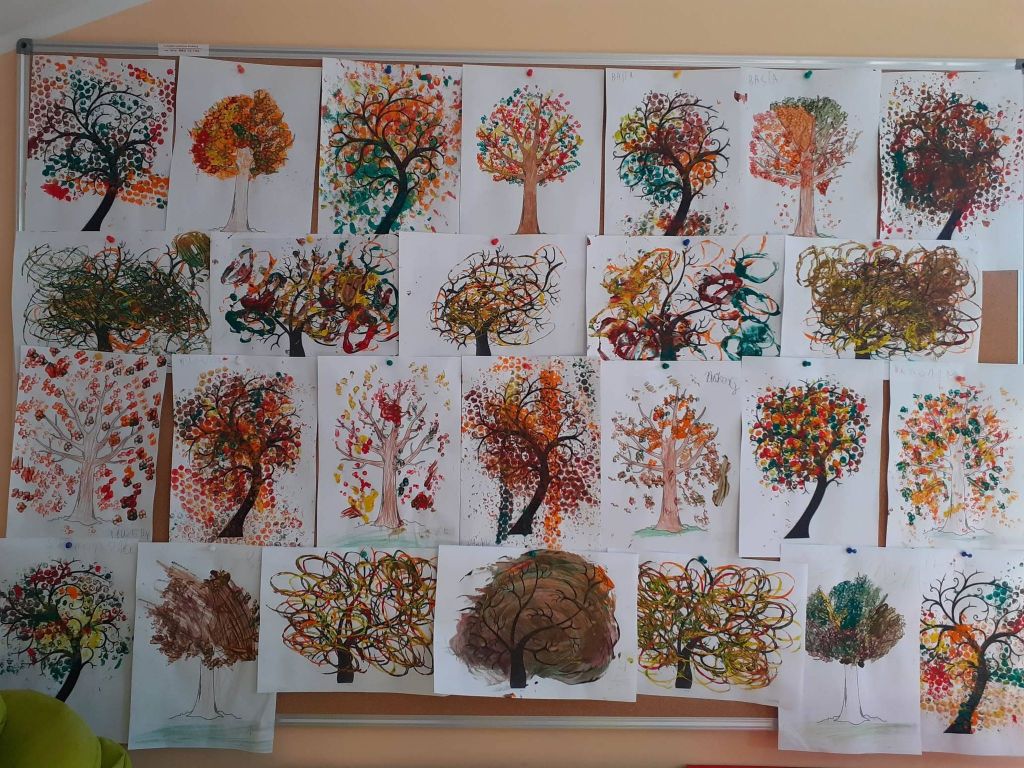 Pierwszy Dzień Jesieni, a zarazem Dzień Spadającego Liścia. Niektórzy nie przepadają za jesienią – bo zimno, mokro, wietrznie. Ale my tą porę roku bardzo lubimy! A kto wcześniej nie lubił, to już zdążył zmienić zdanie. Wszystko dzięki kolorowym pracom plastycznym, które wykonaliśmy. Powstały piękne jesienne drzewa – z pomarańczowymi, zielony, czerwonymi i żółtymi liśćmi. Każde zostało wykonane inną techniką, choć do wszystkich zostały użyte farby – jedne malowaliśmy przy pomocy rolek po papierze toaletowym, inne odbijając kółeczka z folii bąbelkowej, a jeszcze inne patyczkami higienicznymi. U nas już jest jesiennie, ale nadal słonecznie i pozytywnie.