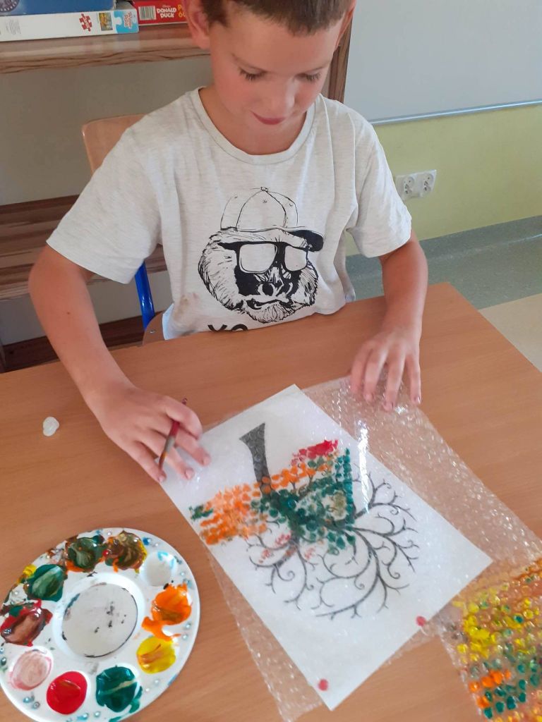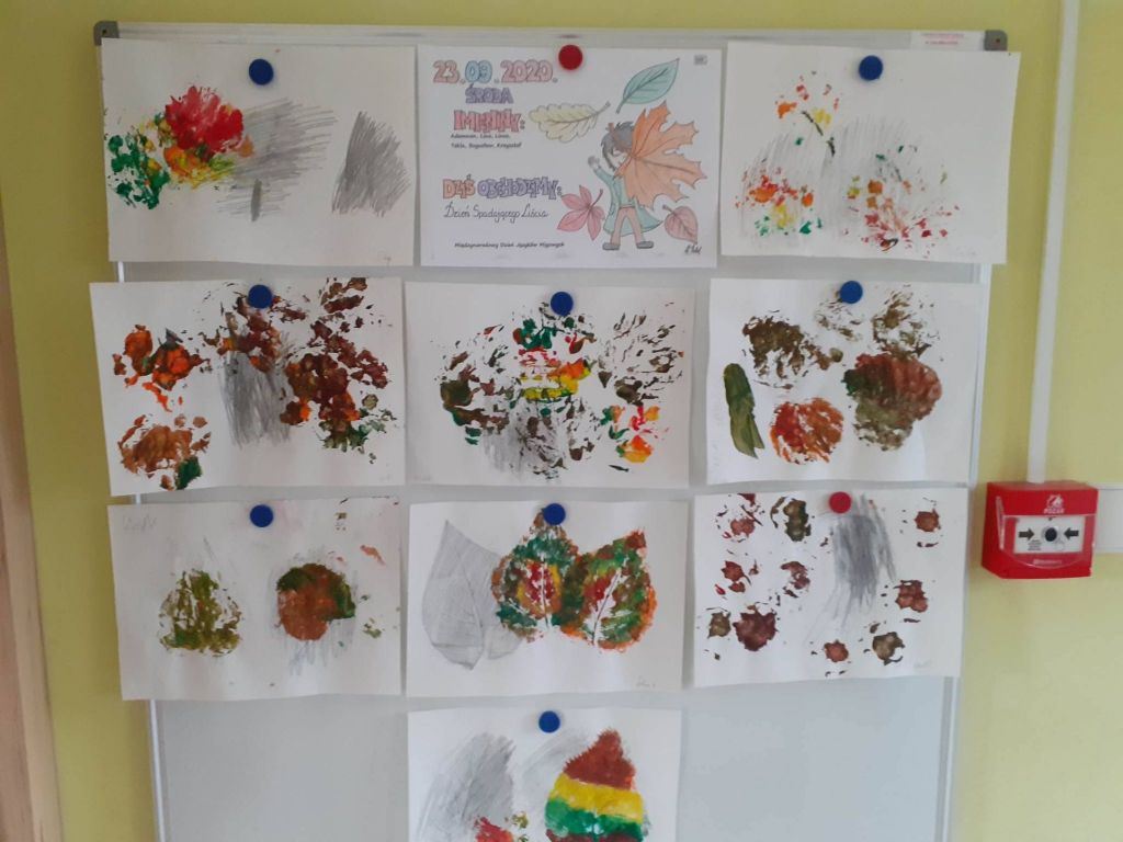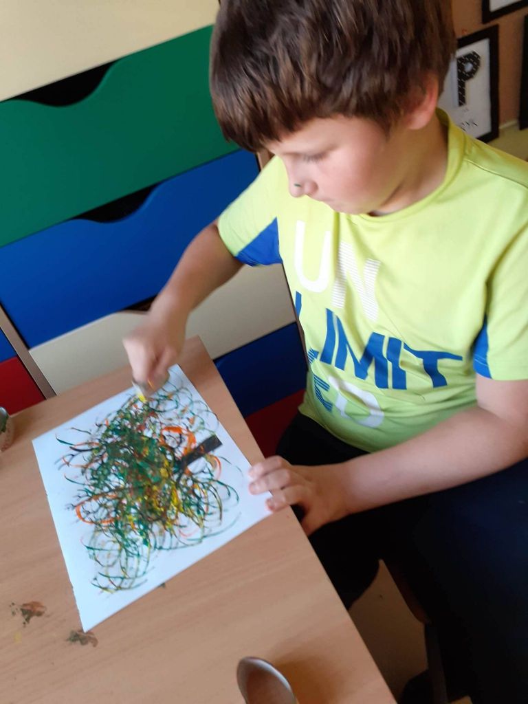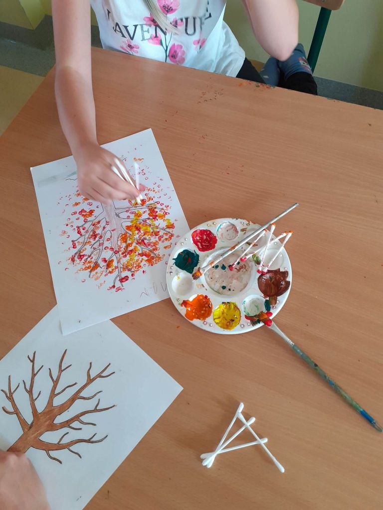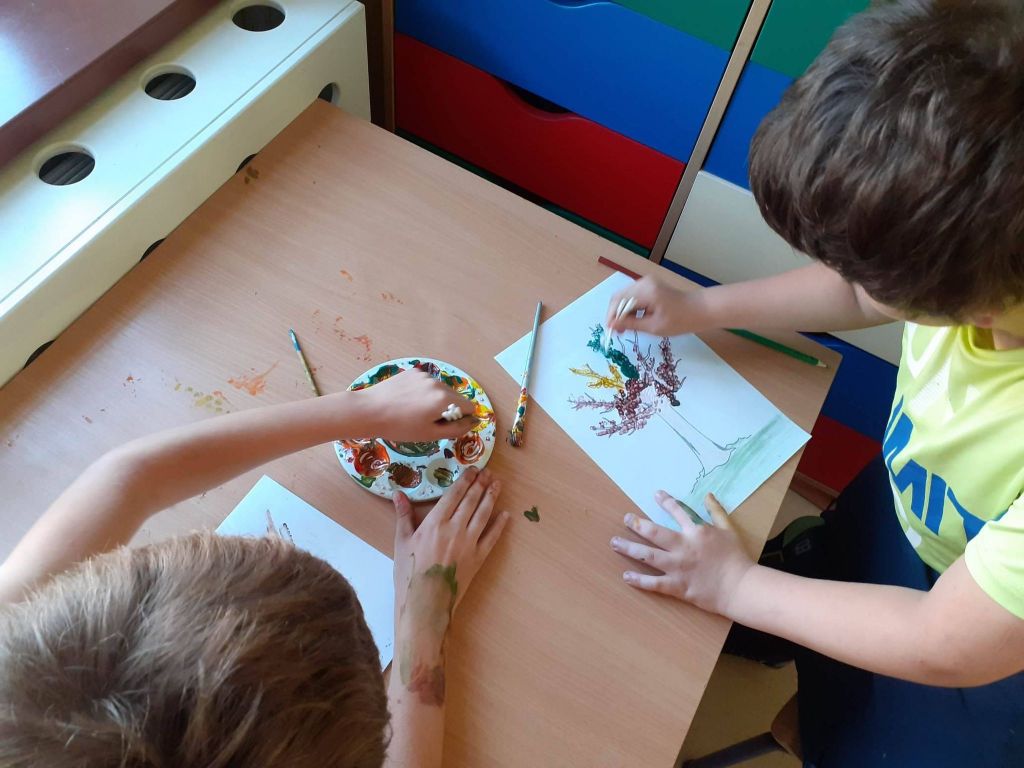 Pierwszy Dzień Jesieni, a zarazem Dzień Spadającego Liścia. Niektórzy nie przepadają za jesienią – bo zimno, mokro, wietrznie. Ale my tą porę roku bardzo lubimy! A kto wcześniej nie lubił, to już zdążył zmienić zdanie. Wszystko dzięki kolorowym pracom plastycznym, które wykonaliśmy. Powstały piękne jesienne drzewa – z pomarańczowymi, zielony, czerwonymi i żółtymi liśćmi. Każde zostało wykonane inną techniką, choć do wszystkich zostały użyte farby – jedne malowaliśmy przy pomocy rolek po papierze toaletowym, inne odbijając kółeczka z folii bąbelkowej, a jeszcze inne patyczkami higienicznymi. U nas już jest jesiennie, ale nadal słonecznie i pozytywnie.