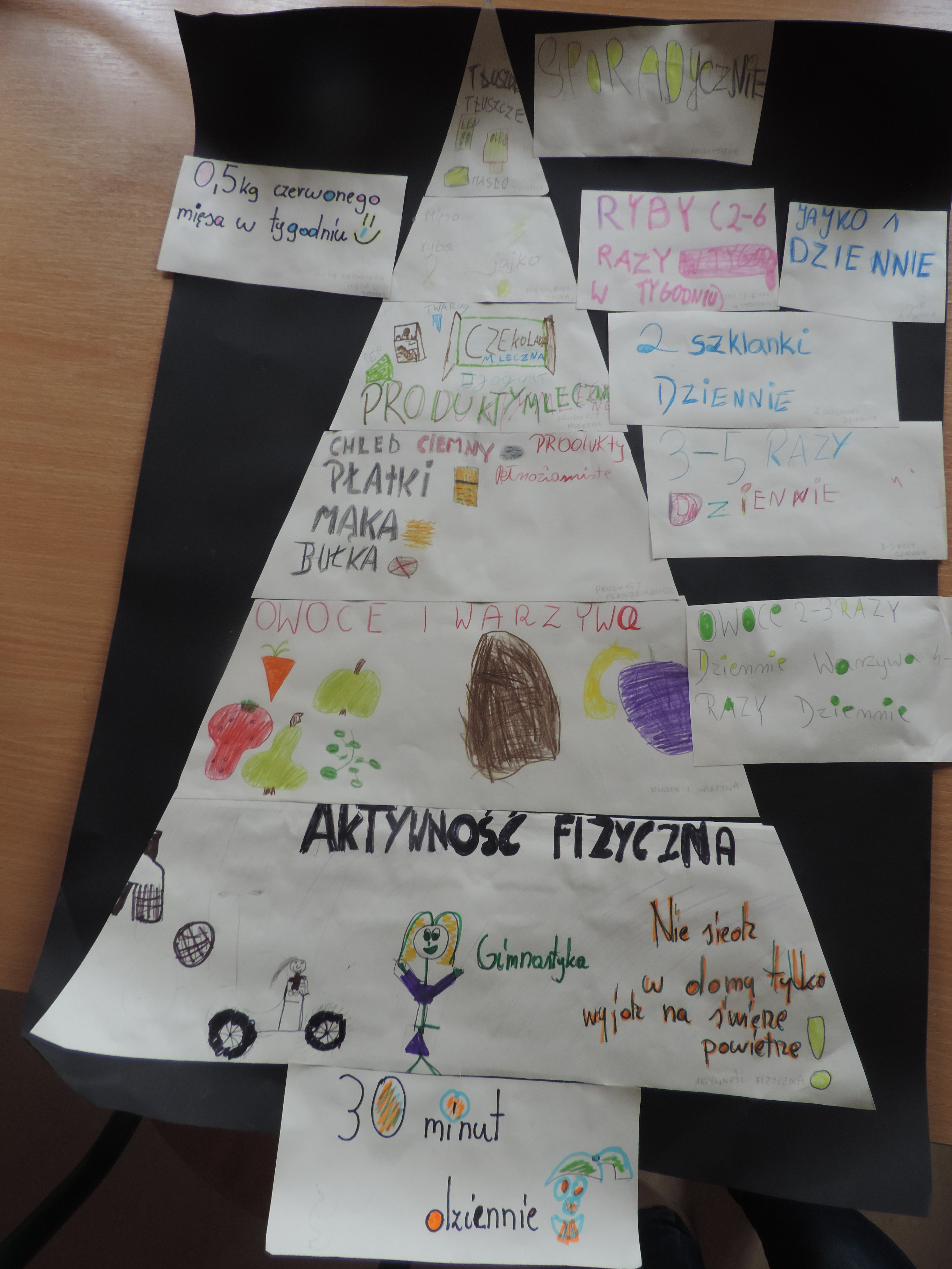 Nadal chcemy się zdrowo odżywiać, więc nieustannie przypominamy sobie zasady, które powinniśmy w tym celu stosować. Tym razem nasza „przypominajka” przyjęła formę piramidy żywienia. Stworzyliśmy 6 poziomów piramidy, aby następnie ułożyć je w odpowiedniej kolejności. Obok każdego z poziomów umieściliśmy drobne wskazówki wg których mamy zamiar się odżywiać.