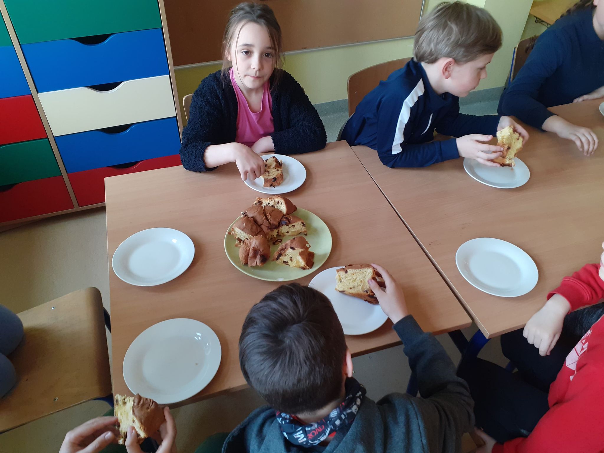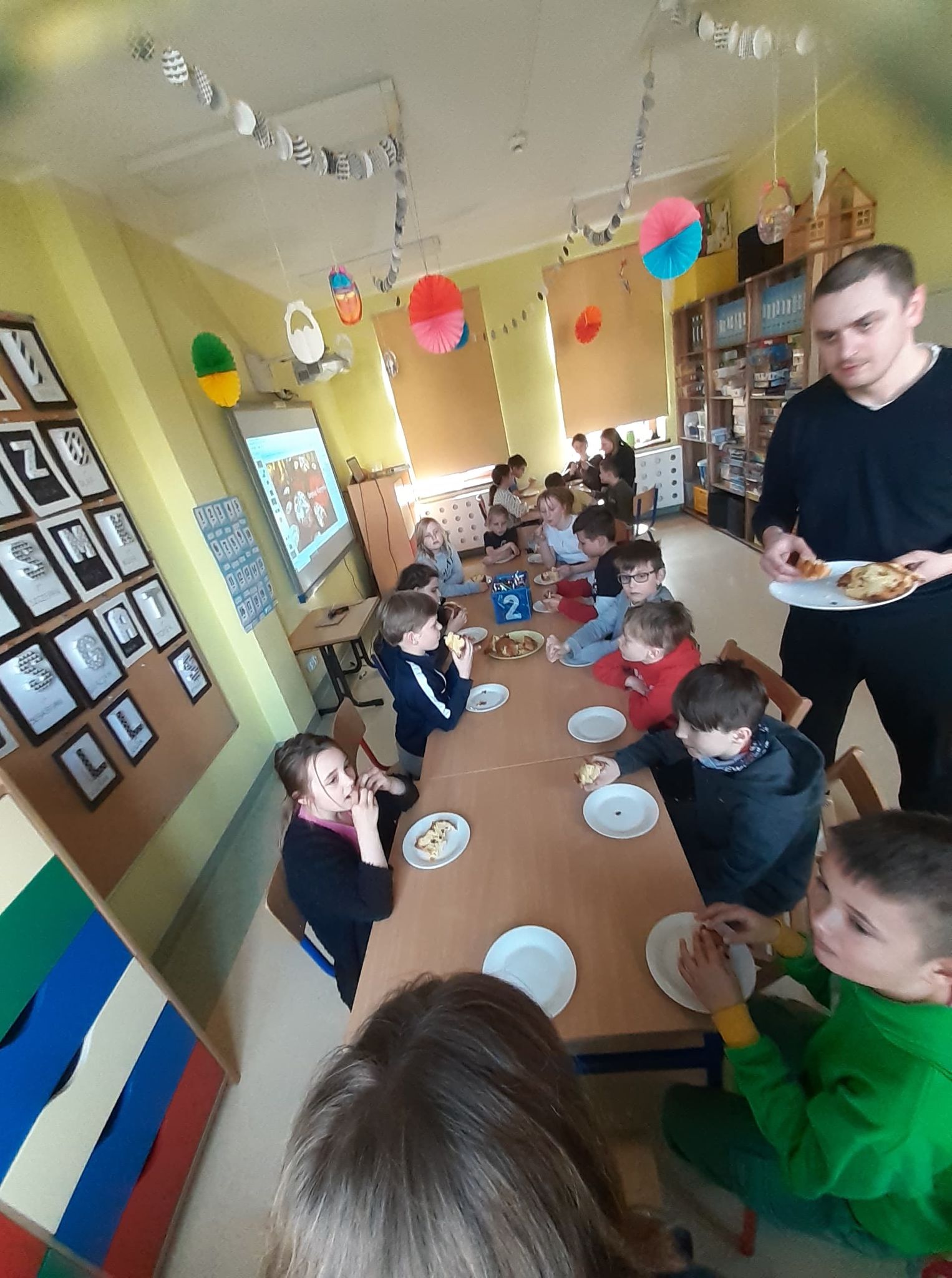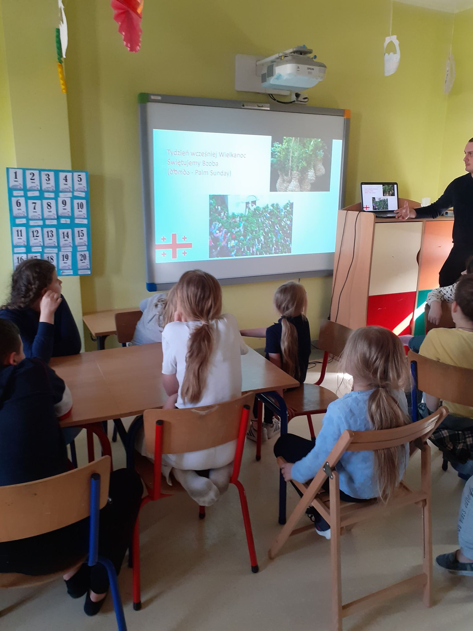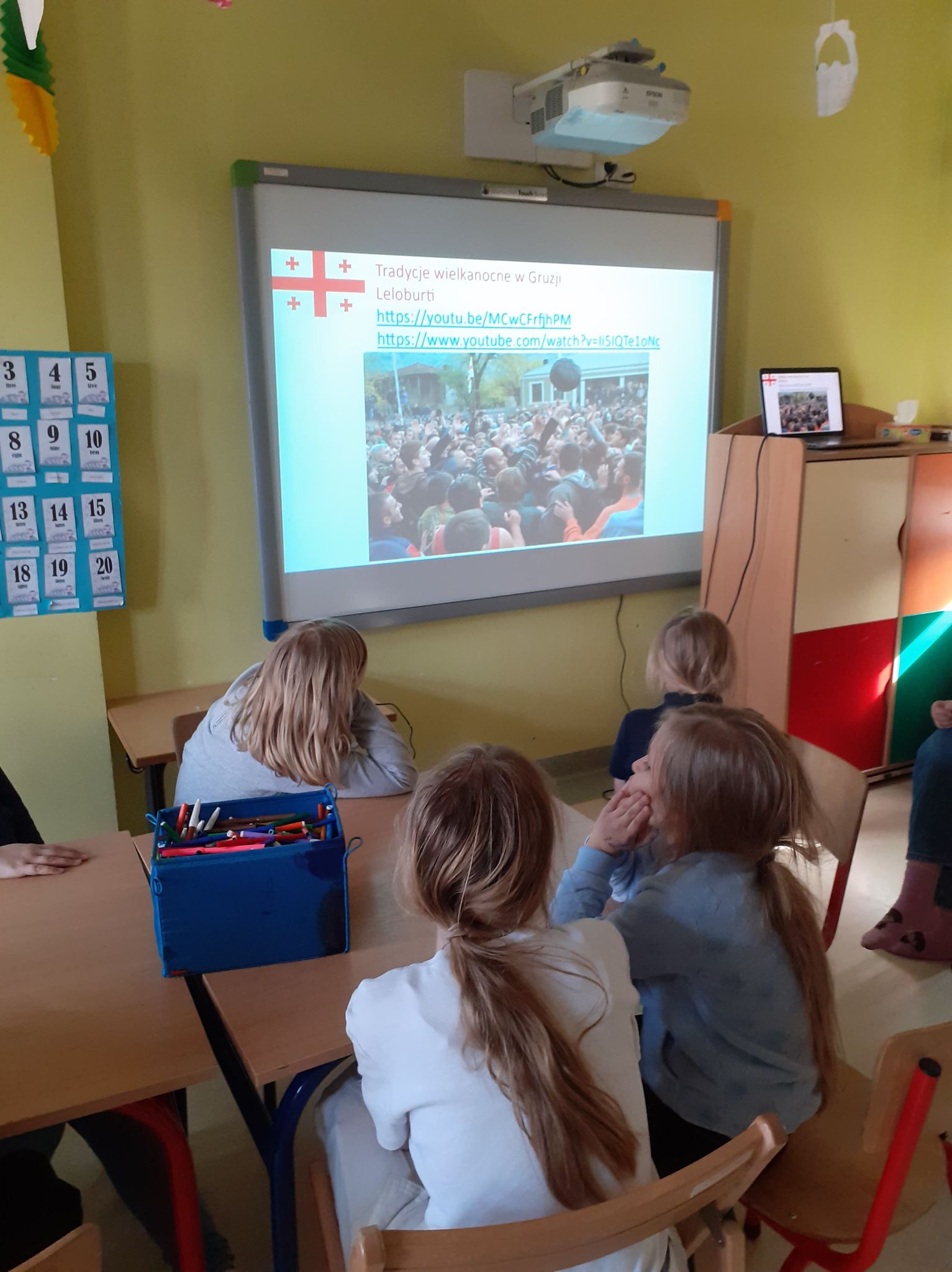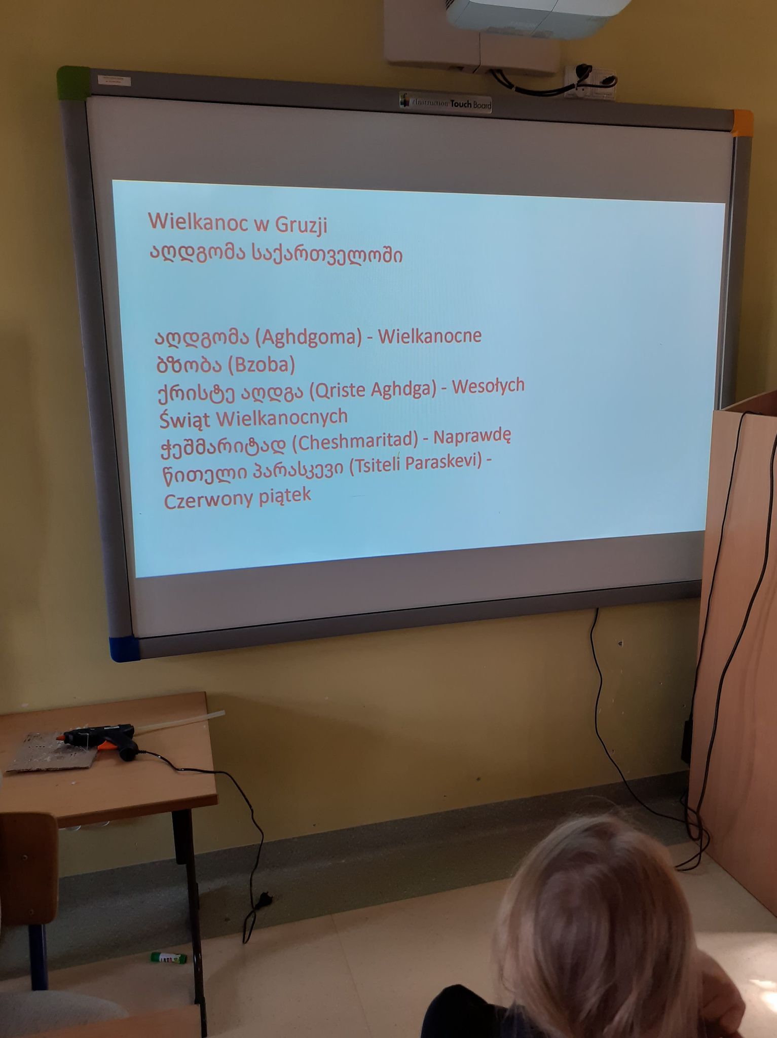 Na zajęciach z naszymi wolontariuszami porozmawialiśmy o Świętach Wielkanocnych w ich kraju – Gruzji. Dowiedzieliśmy się jakie wydarzenia poprzedzają Niedzielę Wielkanocną – Święto Ognia, że pisanki malują głownie na kolor czerwony i robią to w piątek, zanim zajdzie słońce. W poniedziałek wielkanocny bawią się tak jak i my, tyle że nie w polewanie wodą, a grają w piłkę – coś na wzór naszego rugby.