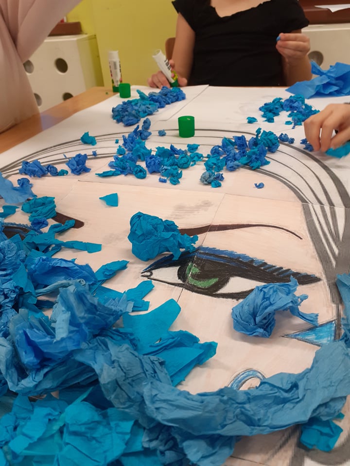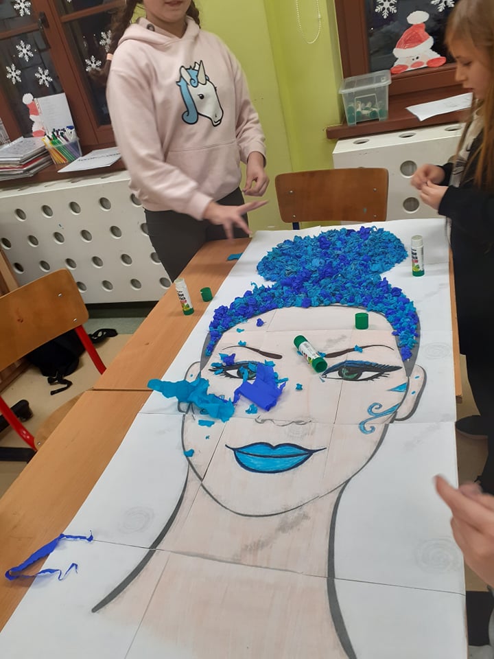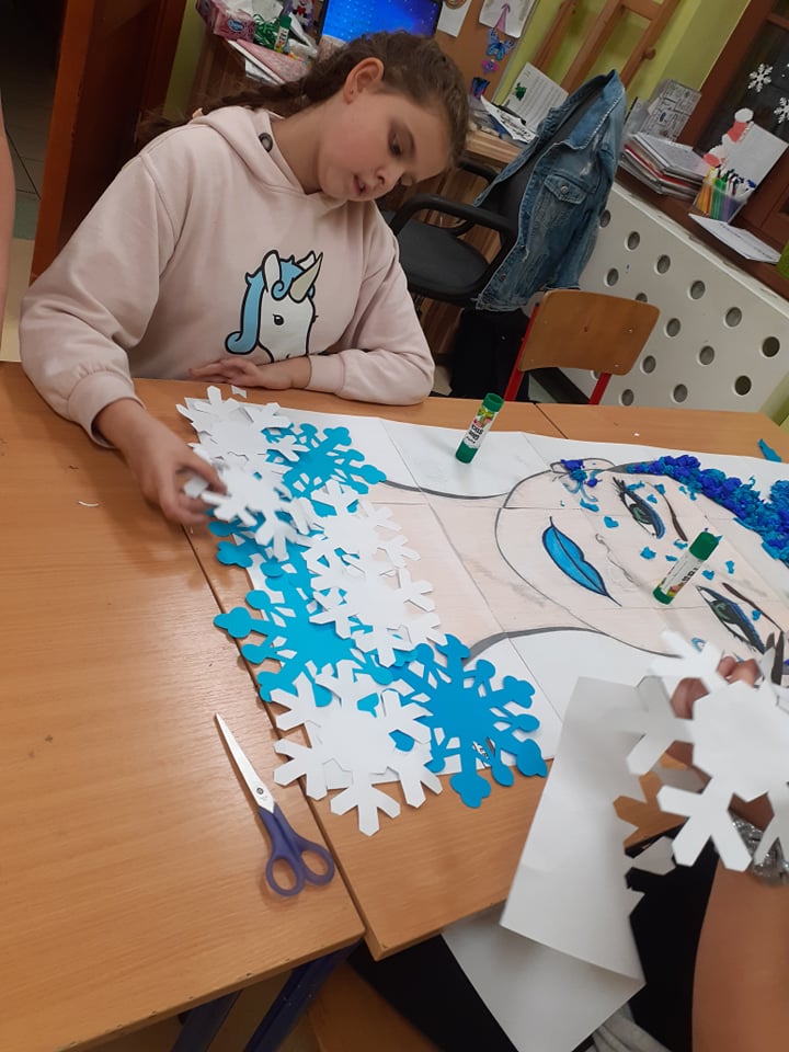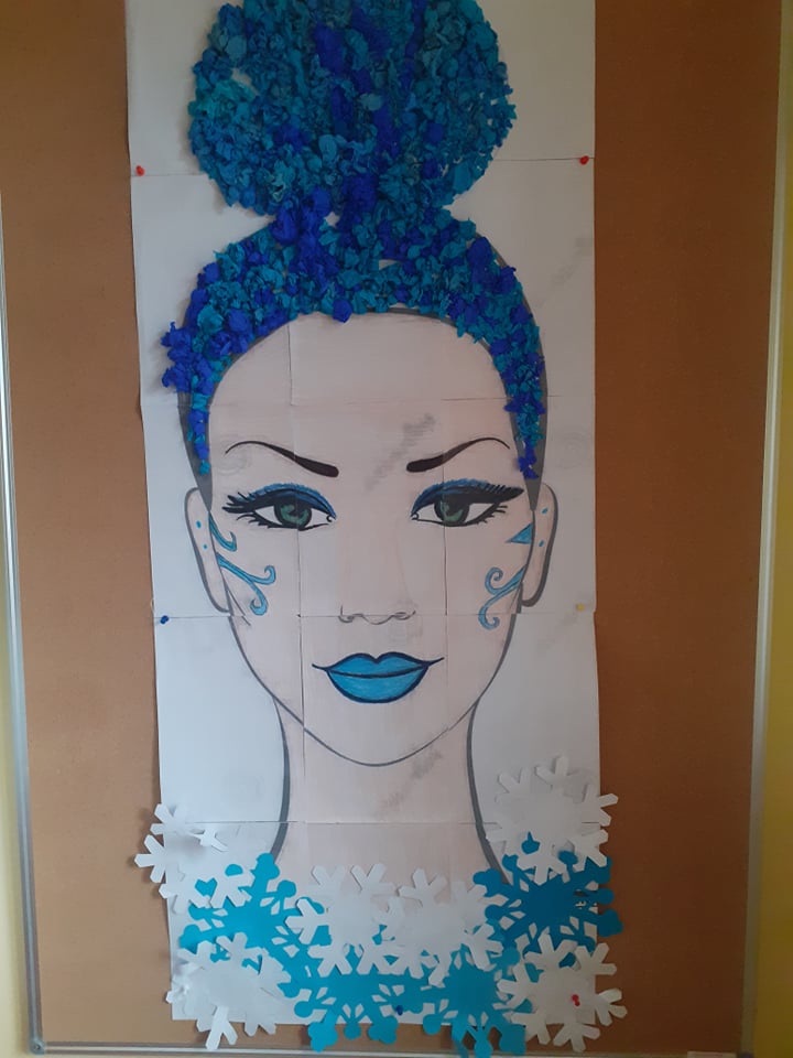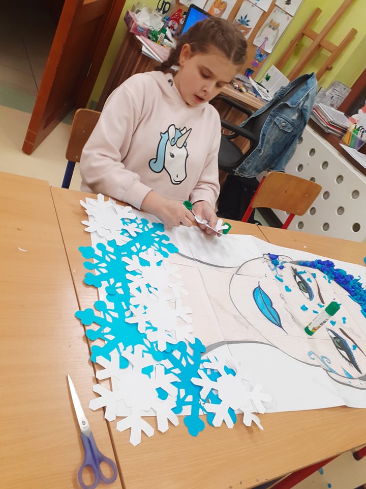 Naszych zimowych zajęć ciąg dalszy. Tym razem wykonaliśmy portret Pani Zimy. Kredki, szablony śnieżynek, kilka odcieni niebieskiej bibuły zwinięte w różnej wielkości kuleczki i gotowe! Pani Zima jak żywa, jest już z nami w świetlicy.