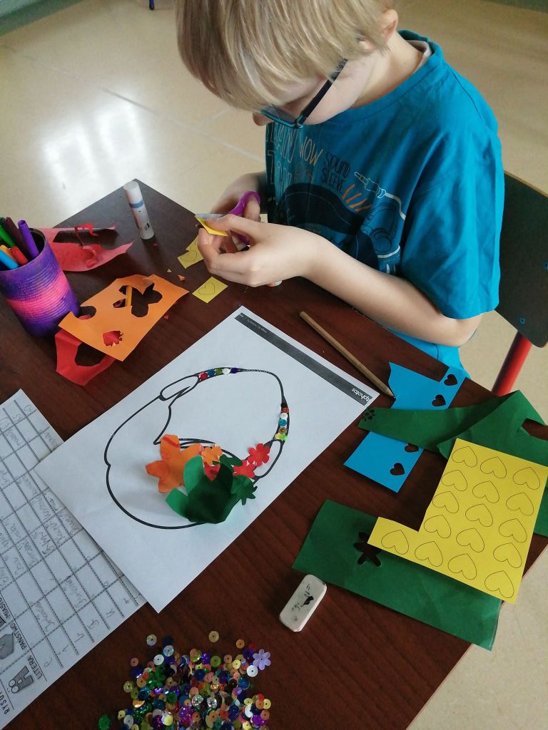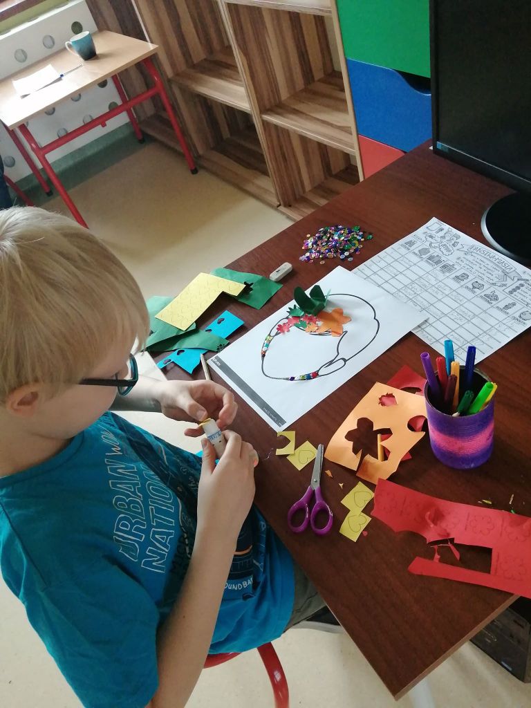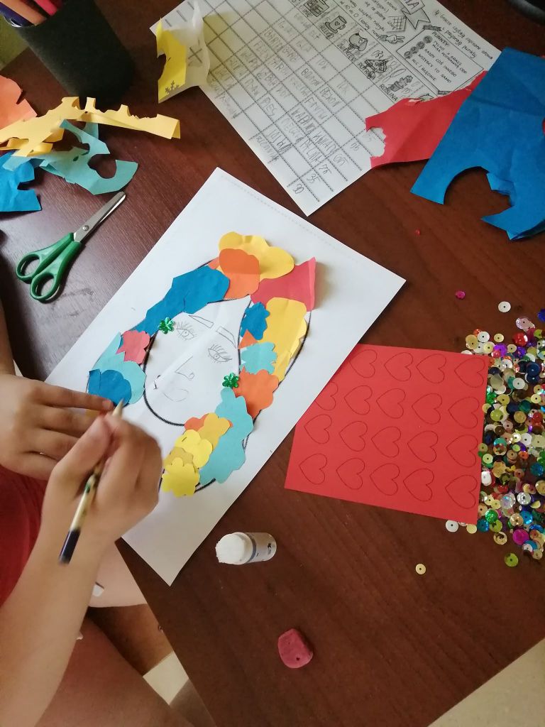 Tydzień wakacji za nami. Udawało nam się spędzić czas na dworze, jednak czasami byliśmy zmuszeni zostać w świetlicy. Jak dzisiaj, kiedy kapryśna pogoda od czasu do czasu straszyła nas deszczem. My wykorzystaliśmy ten czas na stworzenie portretów lata. Każdy z nas miał inne wyobrażenie o nim – dla jednych był kobietą, dla innych mężczyzną. Z długimi włosami, krótkimi, spiętymi, rozpuszczonymi, blond, kolorowymi, z mnóstwem kwiatów. Każda praca jednak wyszła pełna pozytywnej energii, radości i dobrego nastroju. Mamy nadzieję, że właśnie takie lato przed nami.