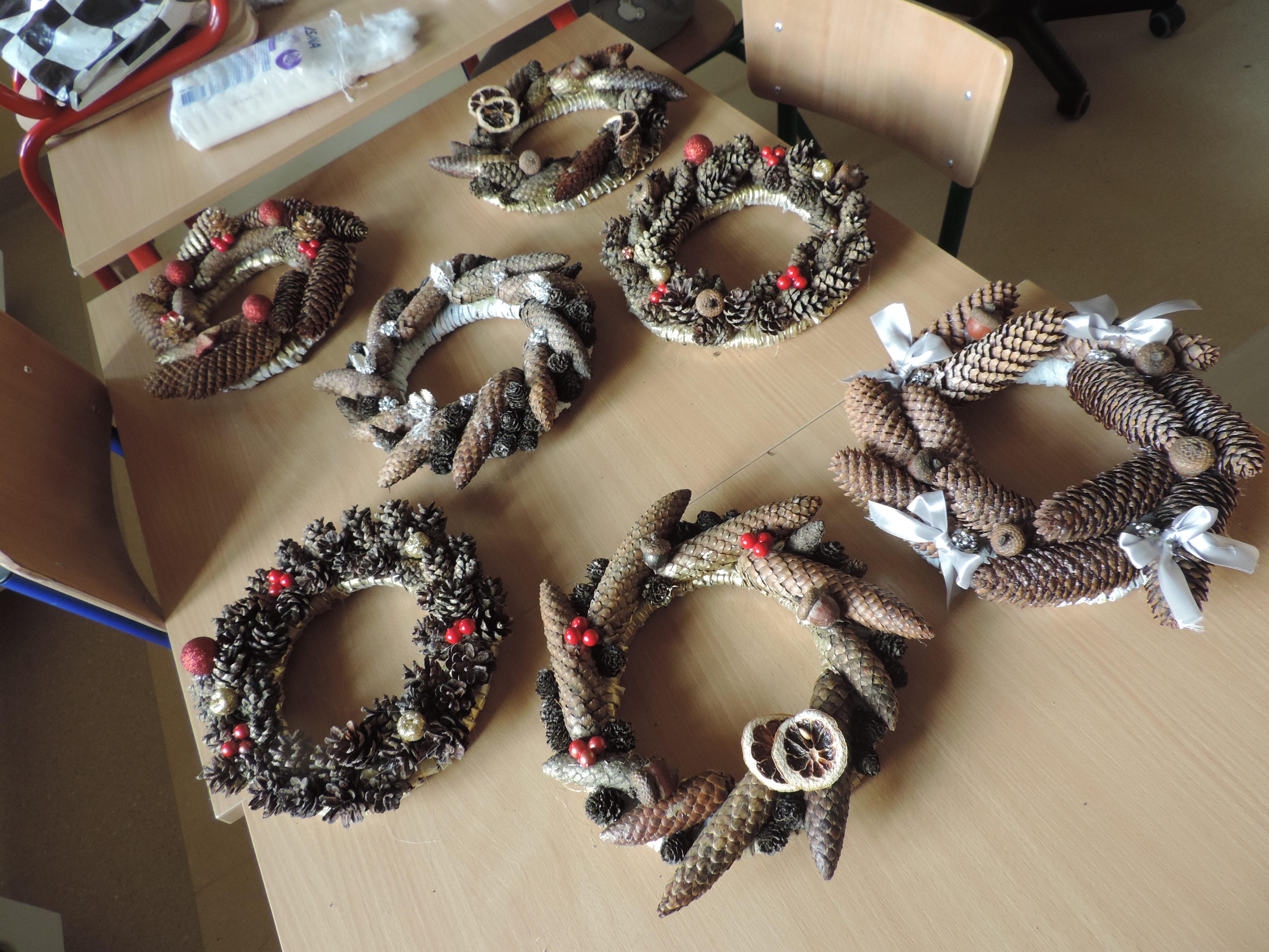 Jako że po wyplataniu koszyków zostało nam trochę papierowej wikliny, postanowiliśmy ją wykorzystać w innym celu. Poszliśmy do lasu, nazbieraliśmy szyszek i żołędzi, wykorzystaliśmy stare łańcuchy, bombki i inne ozdoby choinkowe i zrobiliśmy wieńce. Mamy nadzieję, że staną się one ozdobą wigilijnych stołów i mieszkań.