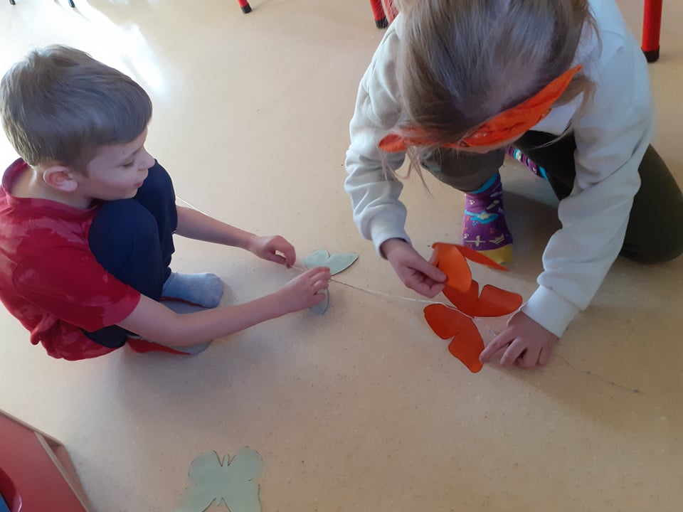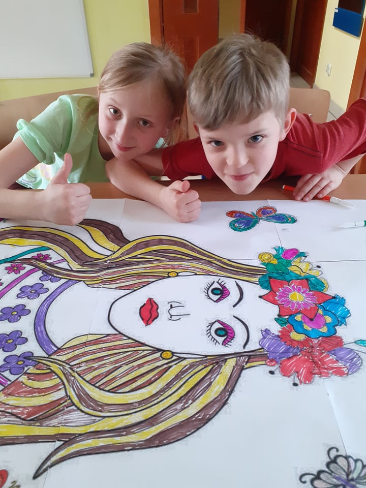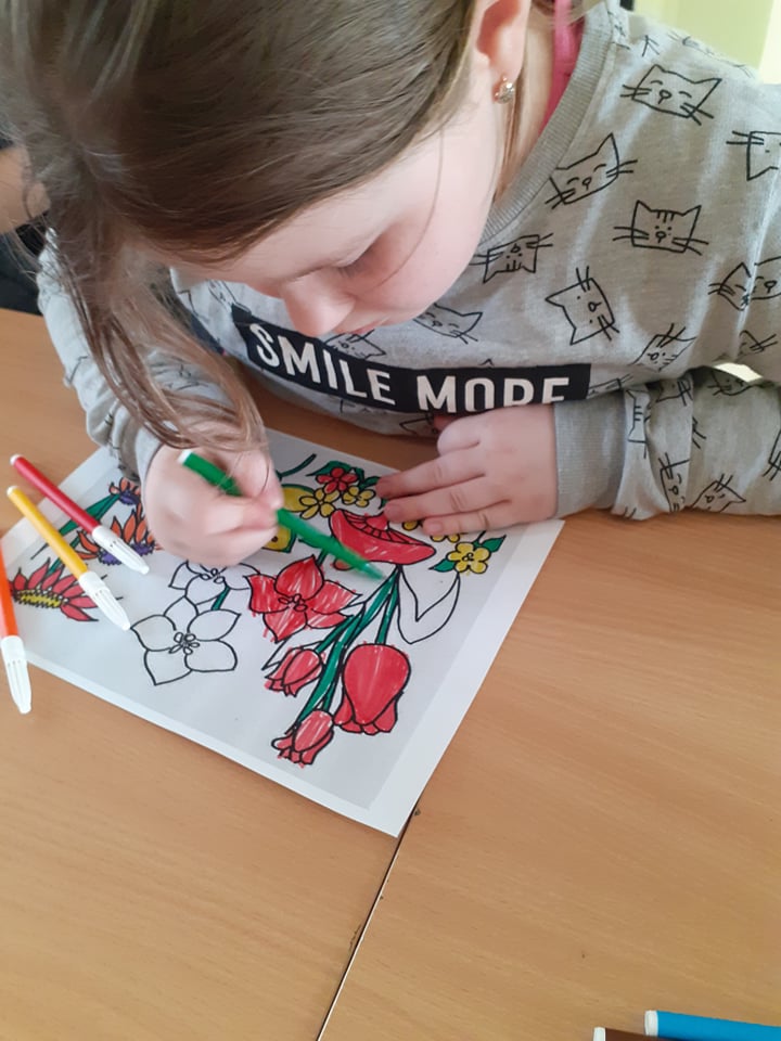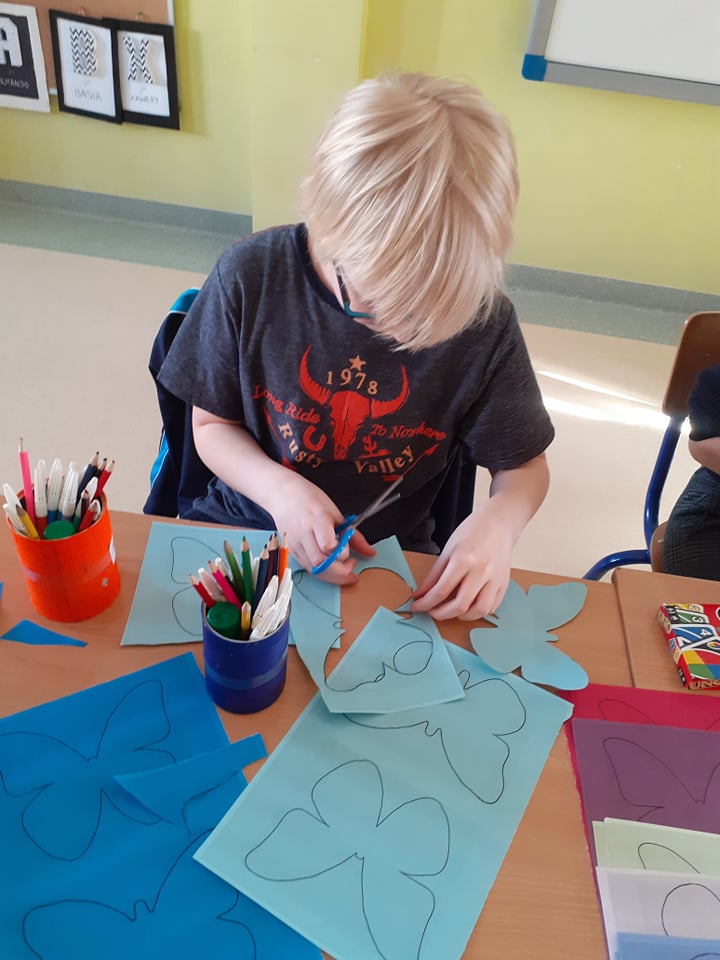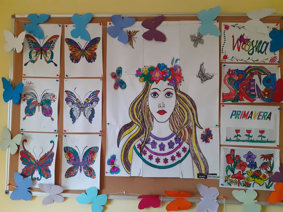 Przywitaliśmy wiosnę, która od niedzieli jest już z nami. Tak bardzo nie mogliśmy się jej doczekać! Nie wykonaliśmy Marzanny, jak to nakazuje tradycja, a portret Pani Wiosny w dużym formacie. Przy okazji poćwiczyliśmy umiejętność współpracy i rozdzielania między siebie zadań. Jak wiadomo wiosna to mnóstwo kolorów, kwiatów, motyli. Dlatego powstała też girlanda z motylami, a przy kolorowaniu antystresowanek ćwiczyliśmy naszą cierpliwość i dokładność. Poznaliśmy także wyraz wiosna w języku angielskim i hiszpańskim. Ozdobiliśmy je i powiesiliśmy na tablicy, aby codziennie móc je sobie powtarzać i utrwalać. A korzystając z ładnej pogody poszliśmy na rolki. Zajęcia plastyczne, grupowe, ruchowe i językowe połączyliśmy więc w jedno!