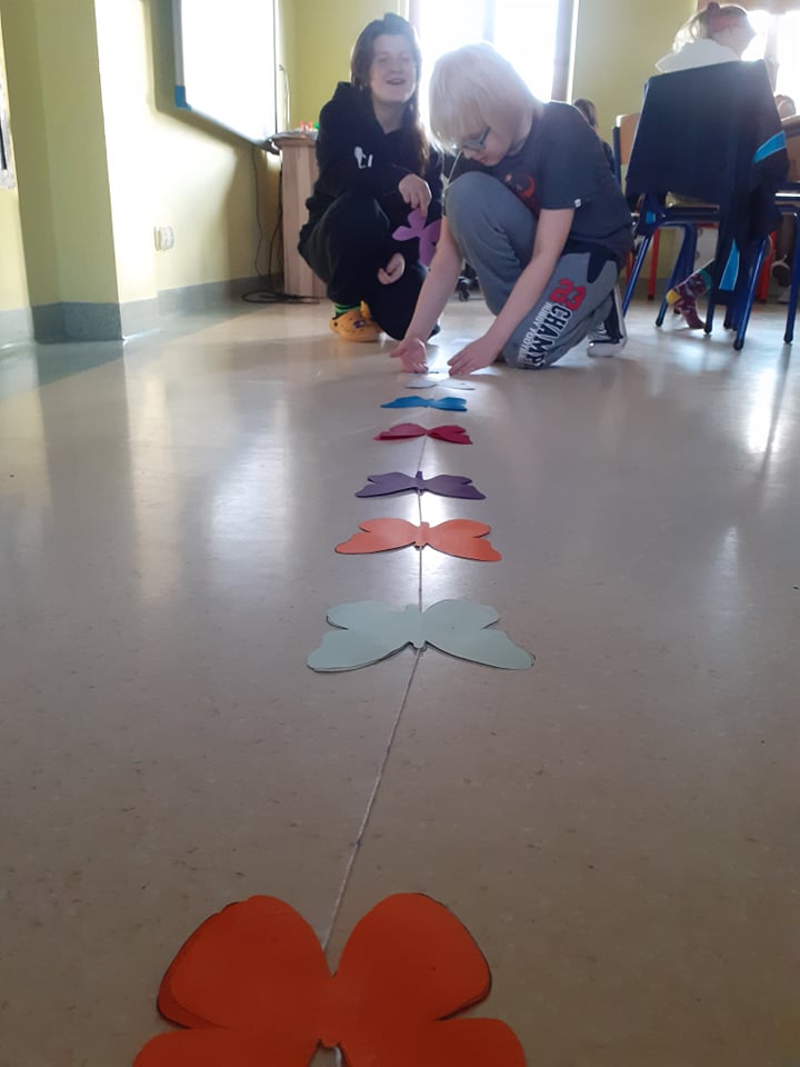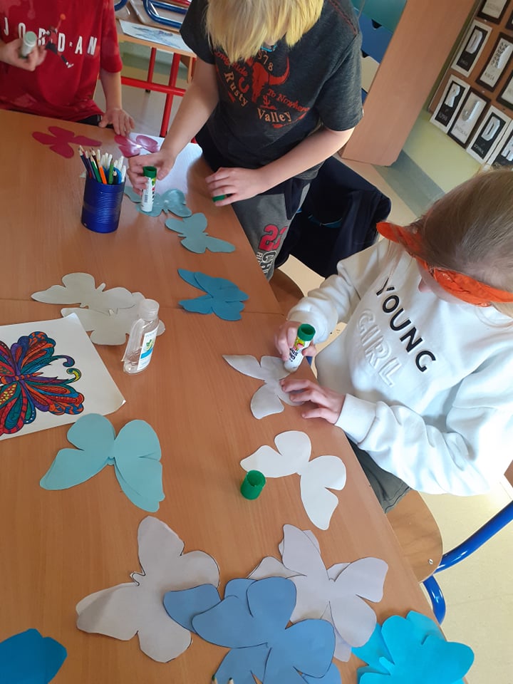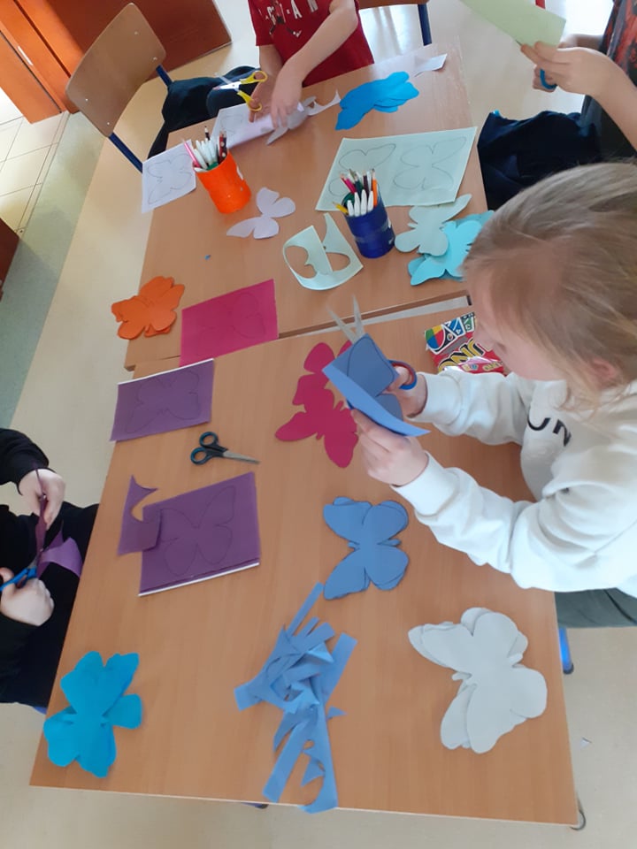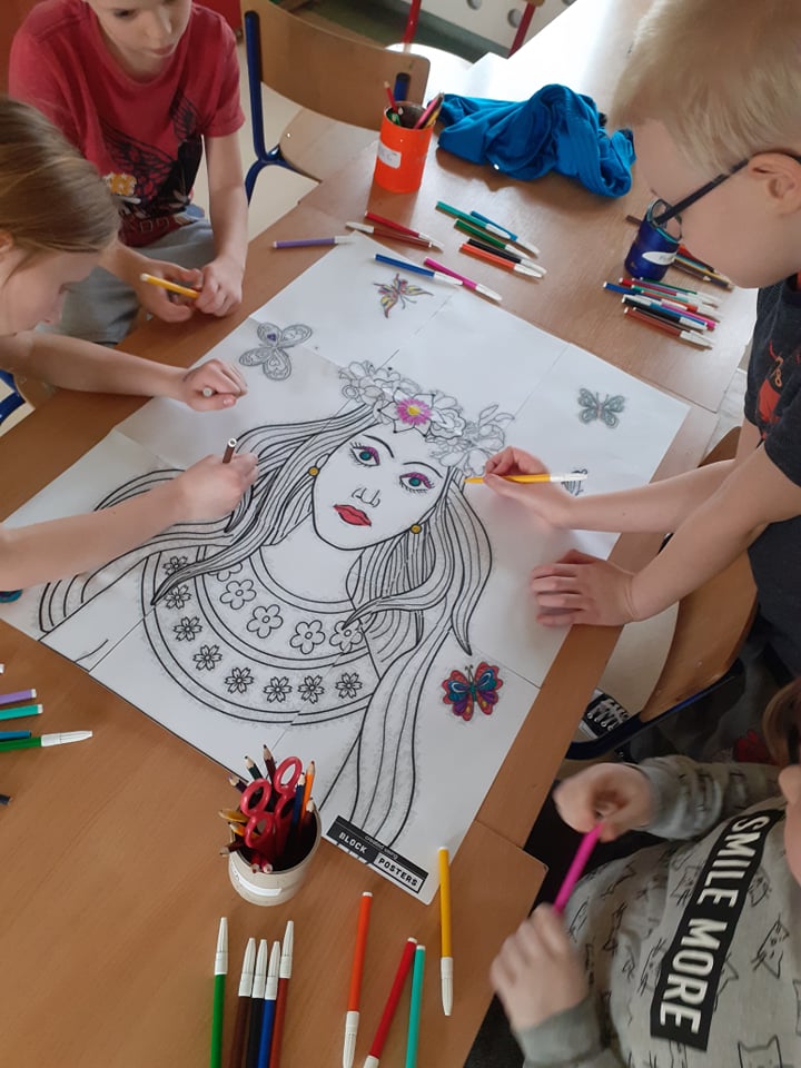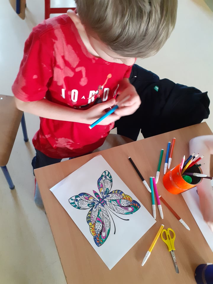 Przywitaliśmy wiosnę, która od niedzieli jest już z nami. Tak bardzo nie mogliśmy się jej doczekać! Nie wykonaliśmy Marzanny, jak to nakazuje tradycja, a portret Pani Wiosny w dużym formacie. Przy okazji poćwiczyliśmy umiejętność współpracy i rozdzielania między siebie zadań. Jak wiadomo wiosna to mnóstwo kolorów, kwiatów, motyli. Dlatego powstała też girlanda z motylami, a przy kolorowaniu antystresowanek ćwiczyliśmy naszą cierpliwość i dokładność. Poznaliśmy także wyraz wiosna w języku angielskim i hiszpańskim. Ozdobiliśmy je i powiesiliśmy na tablicy, aby codziennie móc je sobie powtarzać i utrwalać. A korzystając z ładnej pogody poszliśmy na rolki. Zajęcia plastyczne, grupowe, ruchowe i językowe połączyliśmy więc w jedno!