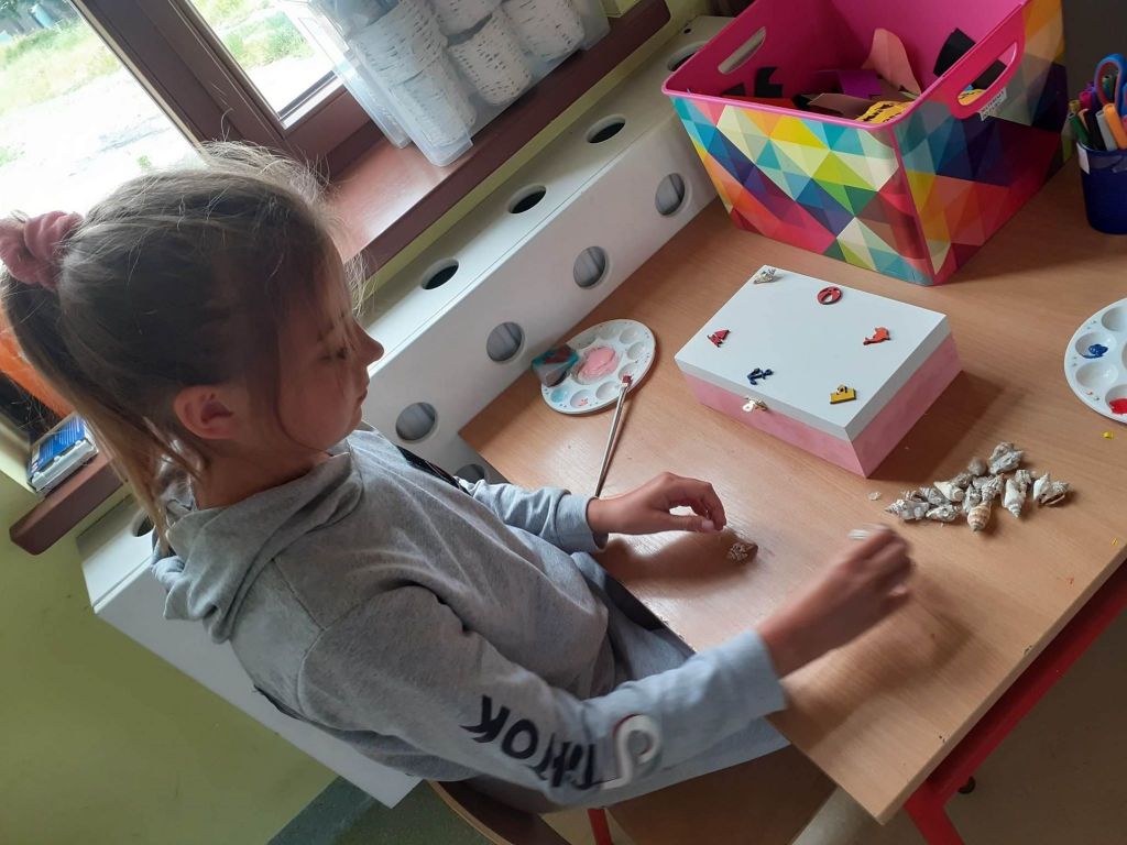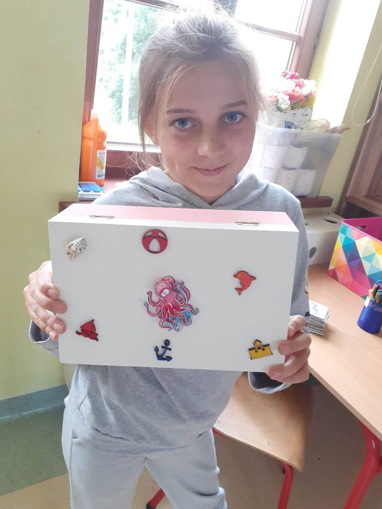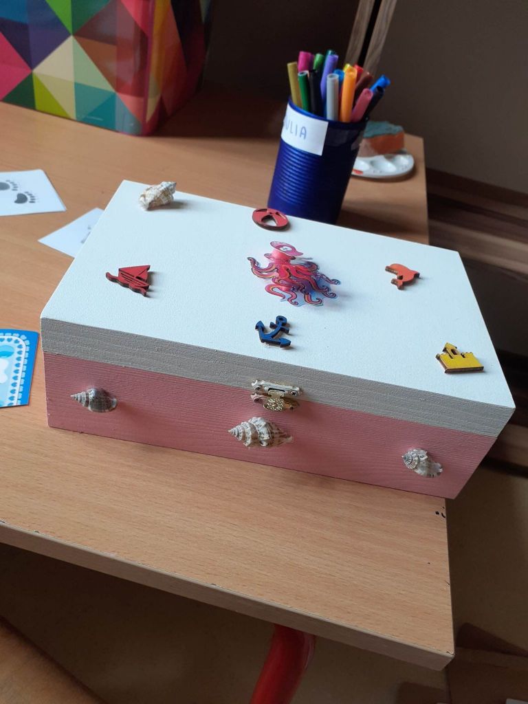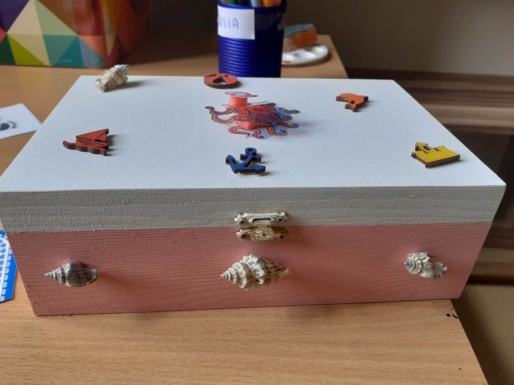 Wakacje trwają w najlepsze, u nas również. Tym razem chcieliśmy zadbać o nasze wakacyjne skarby: kamyczki, patyczki, muszelki, bursztyny, o wszystko to, co znajdujemy podczas naszych podróży małych i dużych. Dlatego powstały pięknie zdobione skrzyneczki. Wśród ozdób oczywiście królowała tematyka morska i wakacyjna.