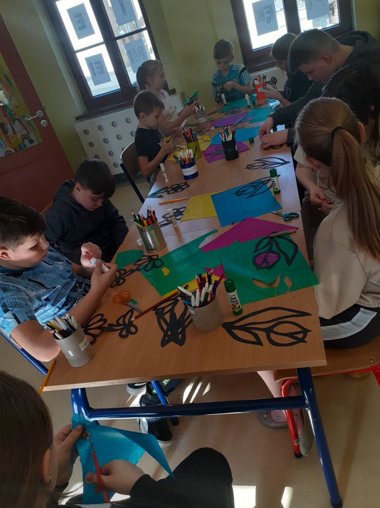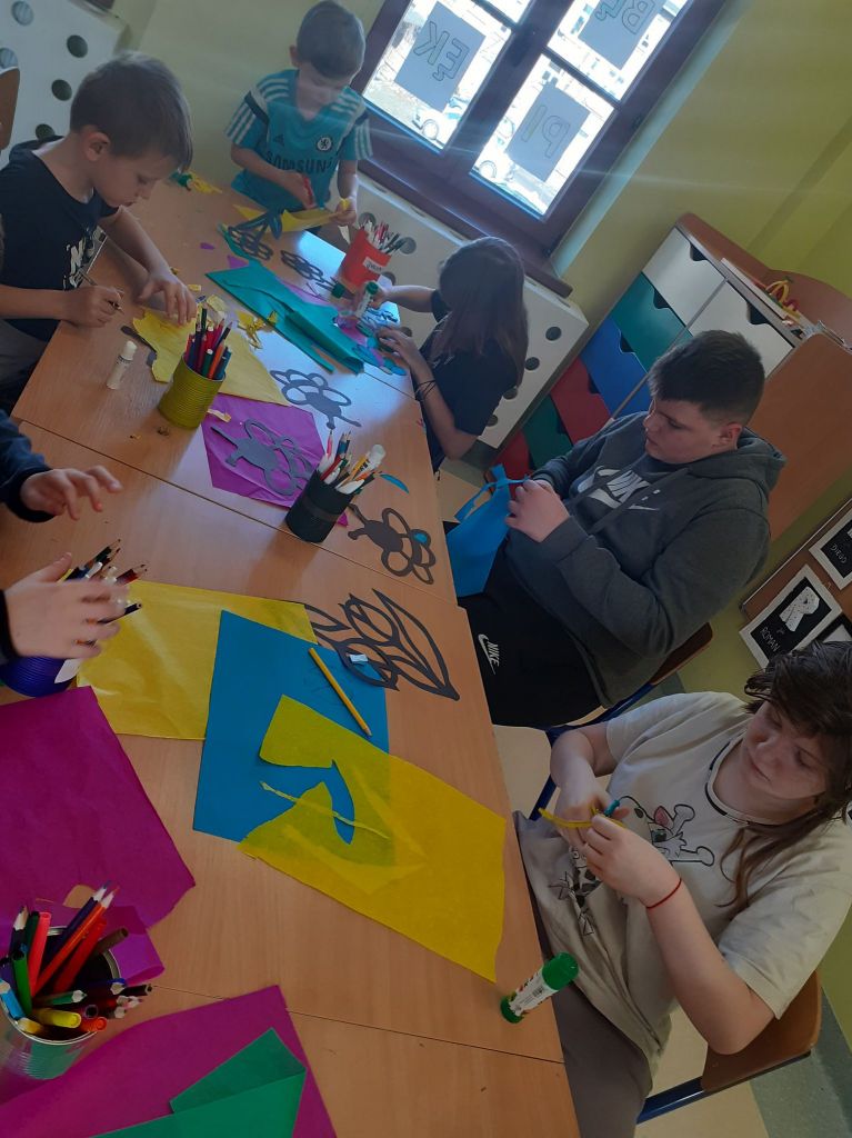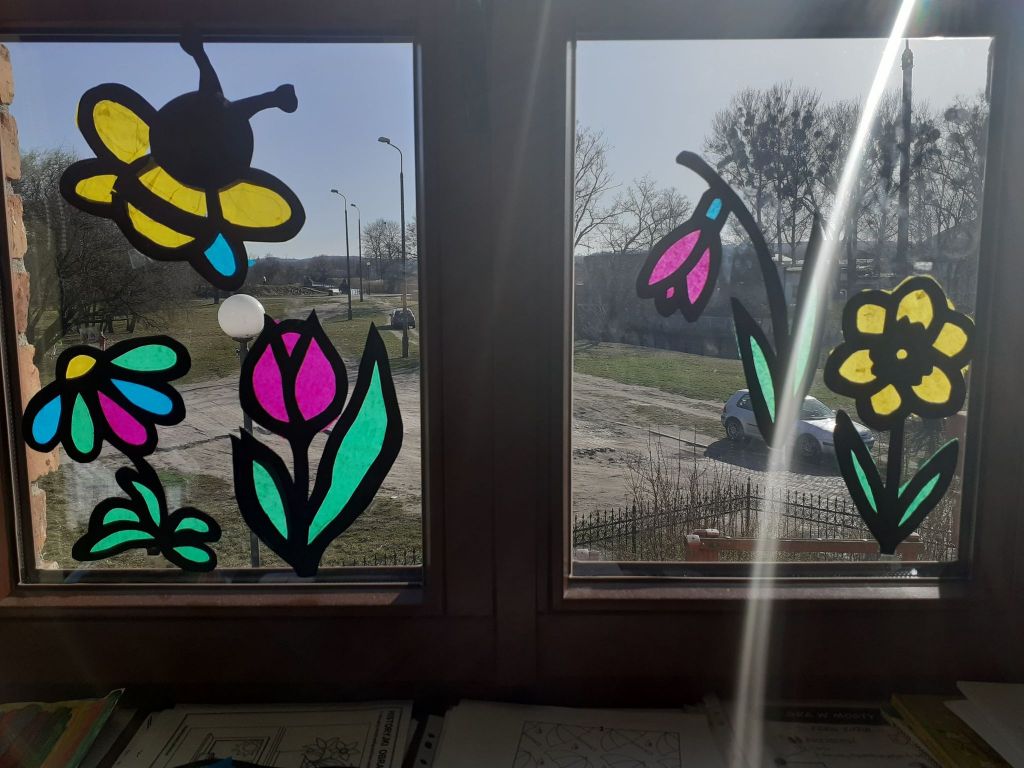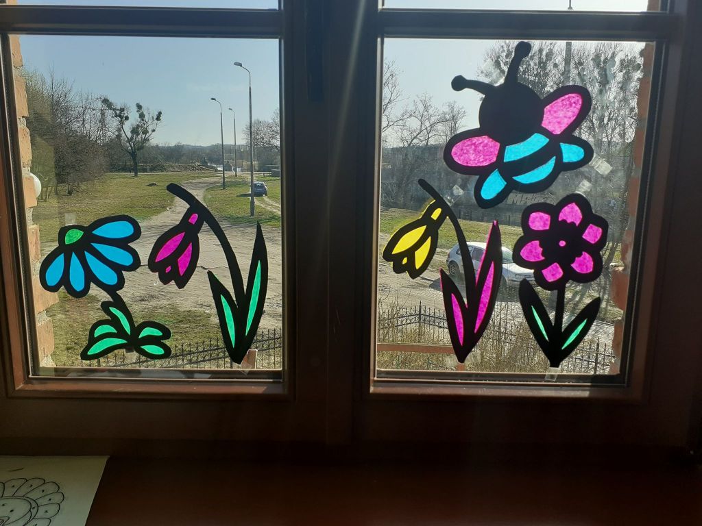 Nie chcieliśmy jednak być tak monotematyczni, więc w przerwie wykonaliśmy wiosenne witraże na okna. Wyglądają fenomenalnie, kiedy słońce wpada przez nie do sali. Od razu przyjemniej się zrobiło.