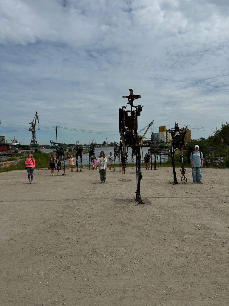 Zaczęliśmy spacer od muzeum solidarności a następnie udaliśmy się wzdłuż brzegu Martwej Wisły. Odkryliśmy tereny poprzemysłowe stające się integralną częścią miasta. Snuliśmy teorie na temat tajemniczych rzeźb ustawionych na dawnej pochylni Wydziału Kadłubowego oraz spontanicznie odwiedziliśmy wystawę sztuki współczesnej.