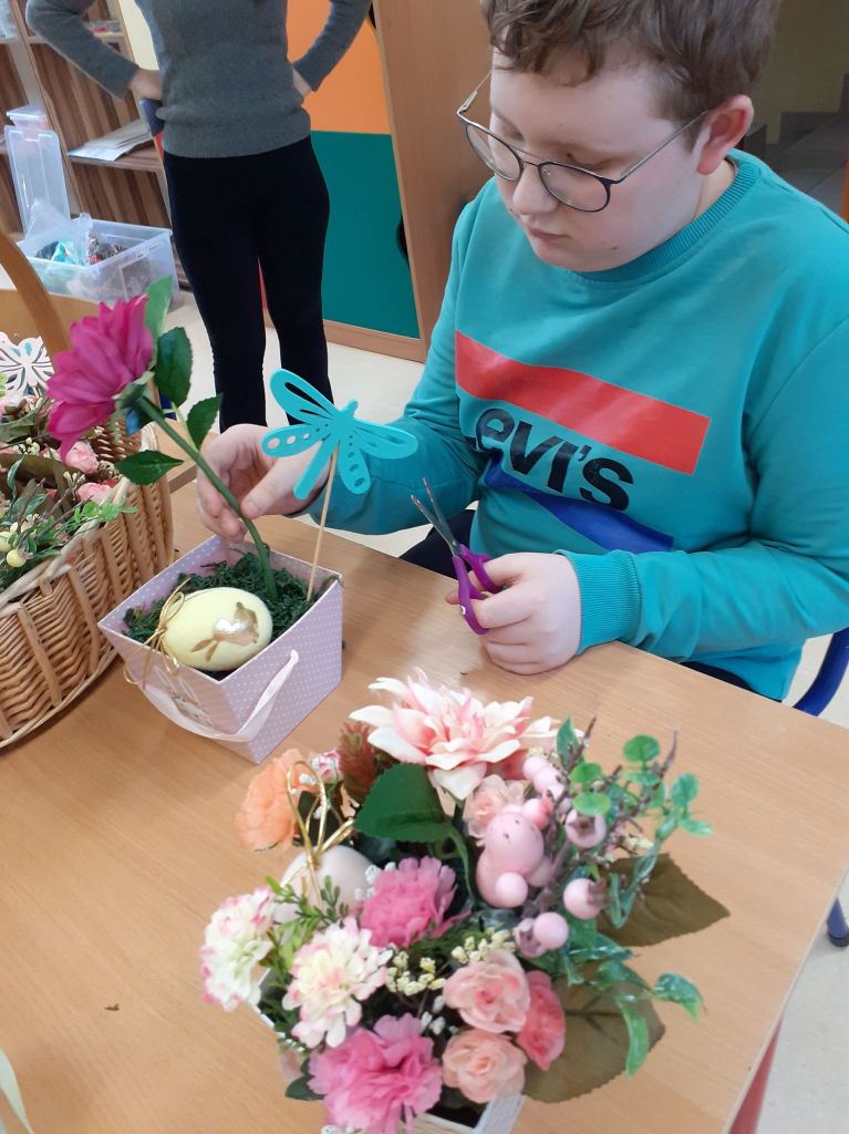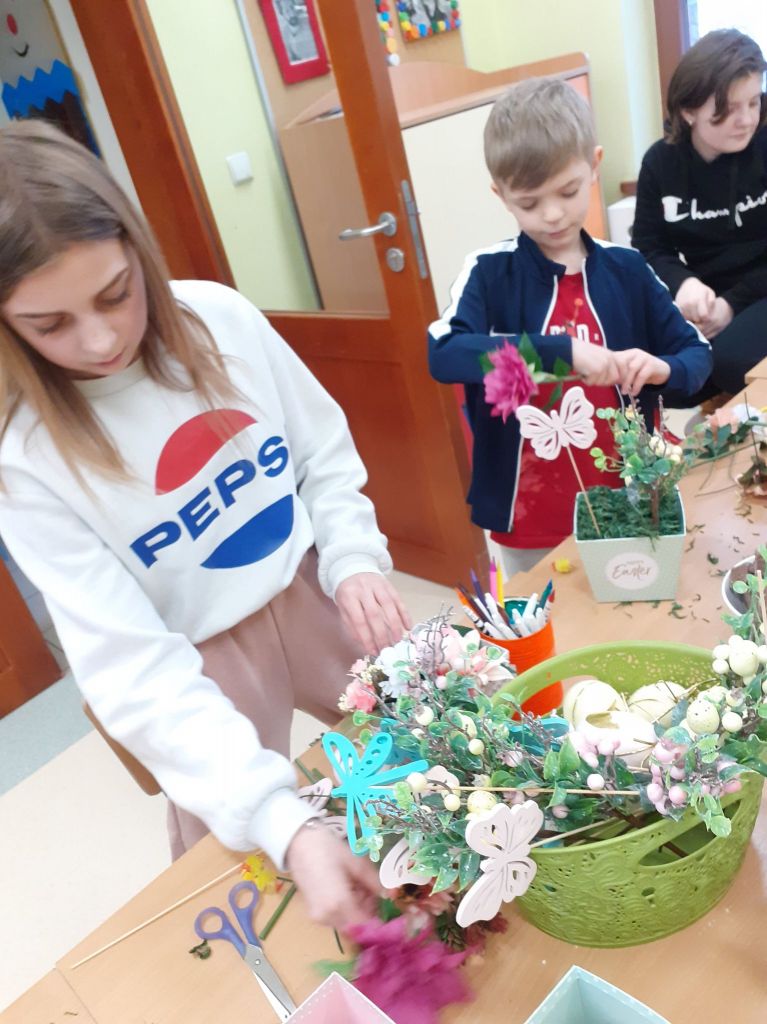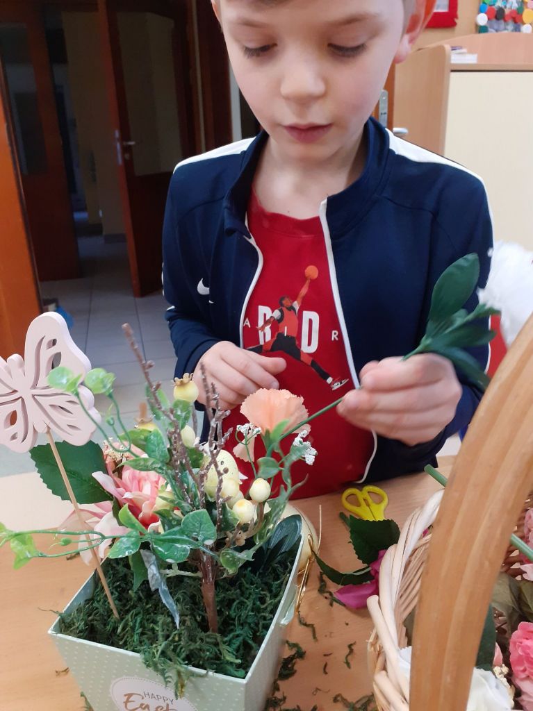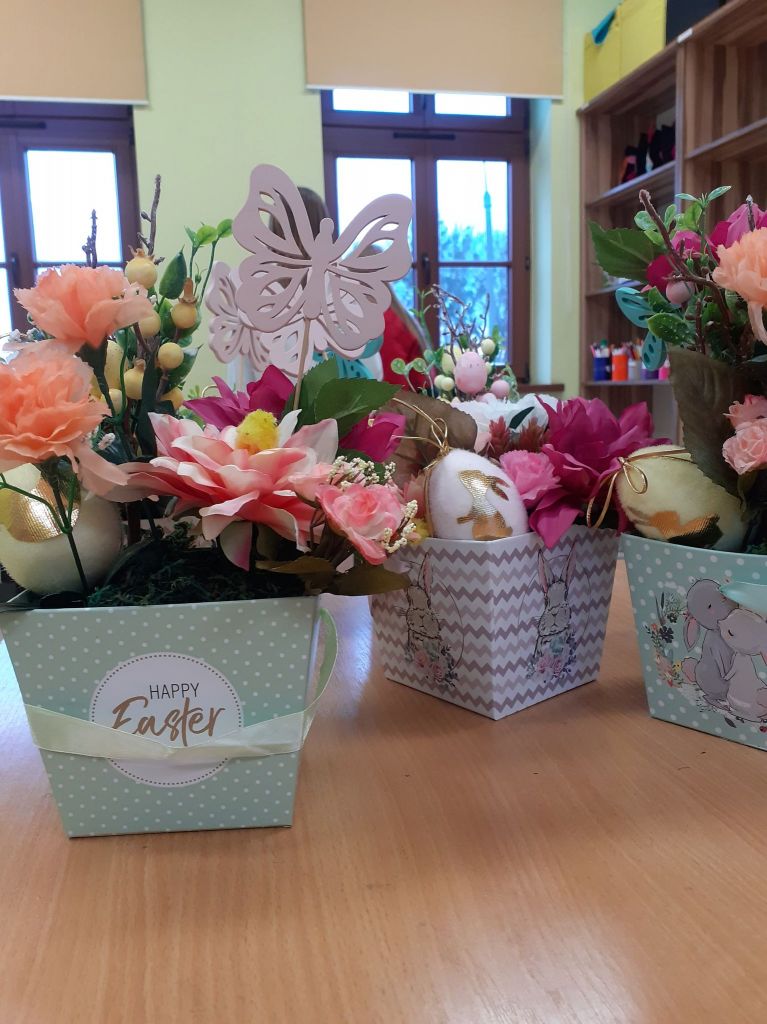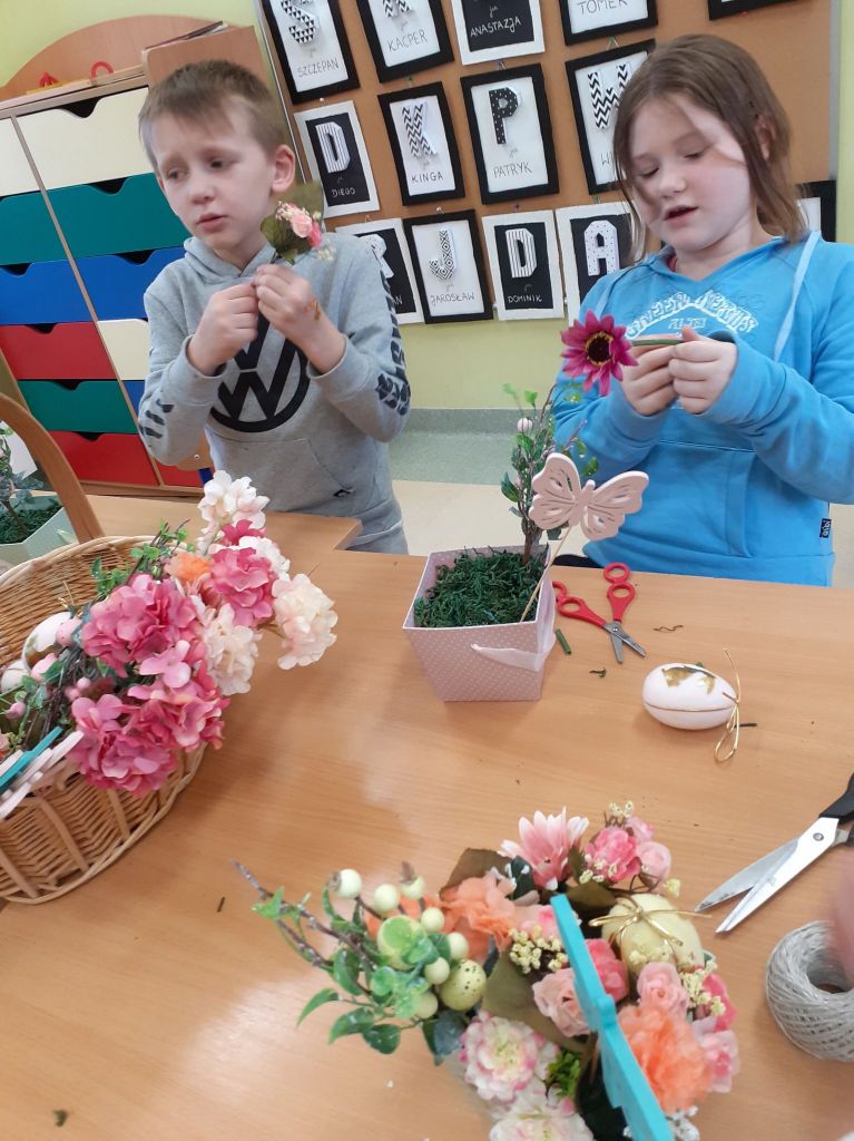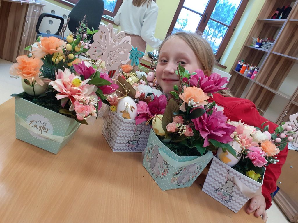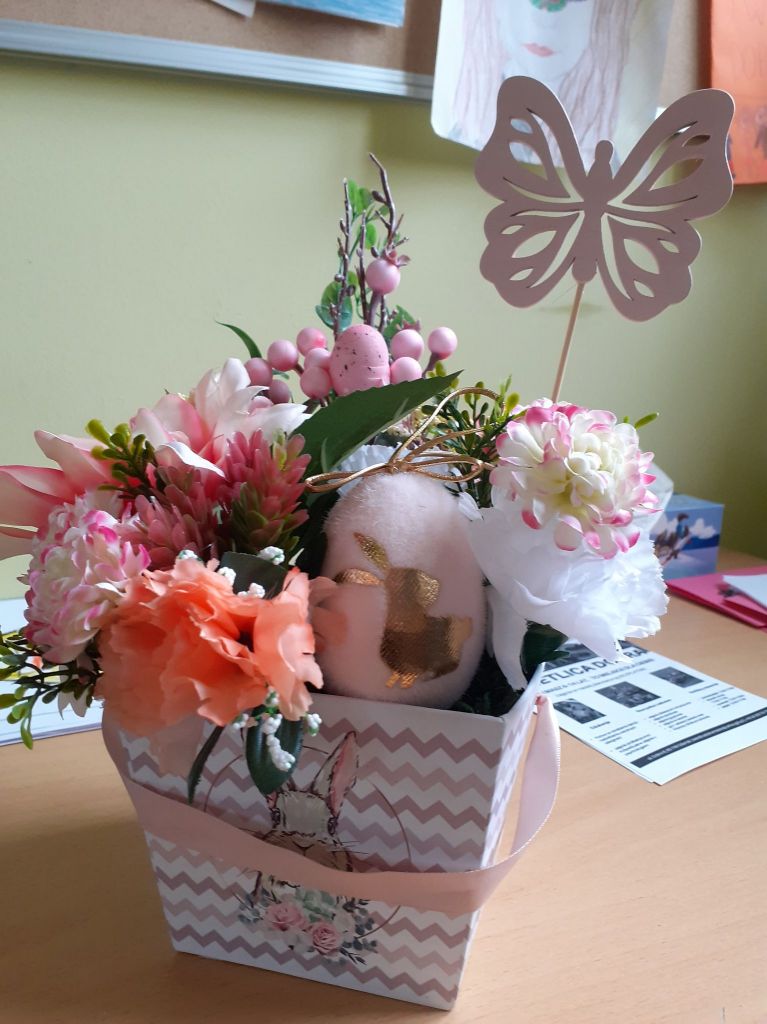 Ogarnęło nas wielkanocne szaleństwo. Tym razem na warsztat wzięliśmy stroiki, które po drobnych modyfikacjach mogą być także całoroczną ozdobą naszych domów. Wystarczyły kolorowe pudełka, gąbka florystyczna, sztuczne kwiaty, ozdoby na piku, jajka, trochę mchu. Każdy z nas stworzył własną kompozycję. Wyszło pięknie! Wiosna i Wielkanoc powoli wkrada się do naszych domów.