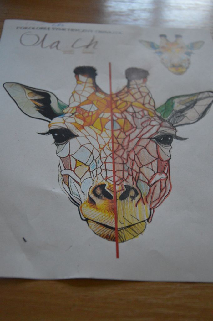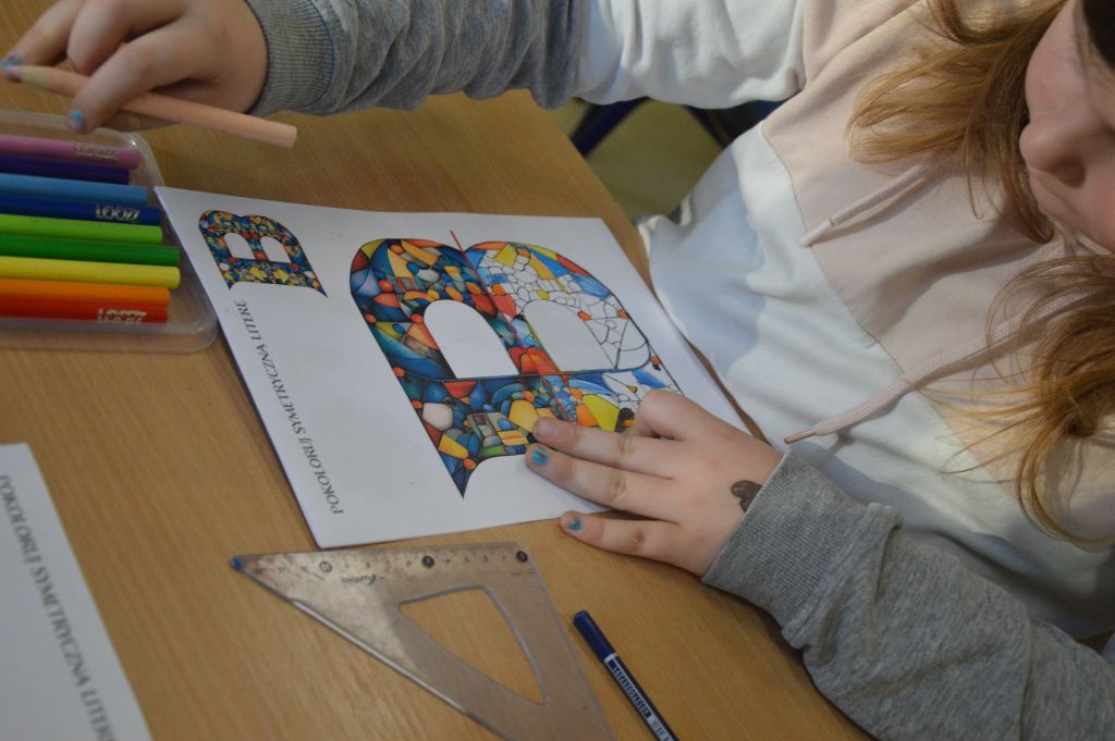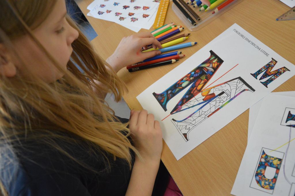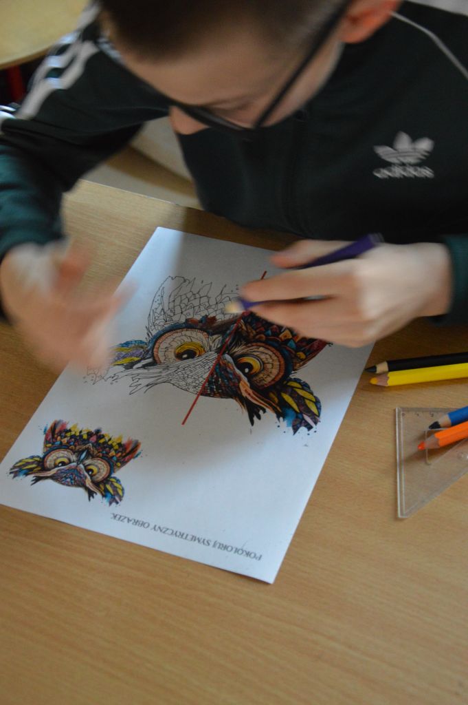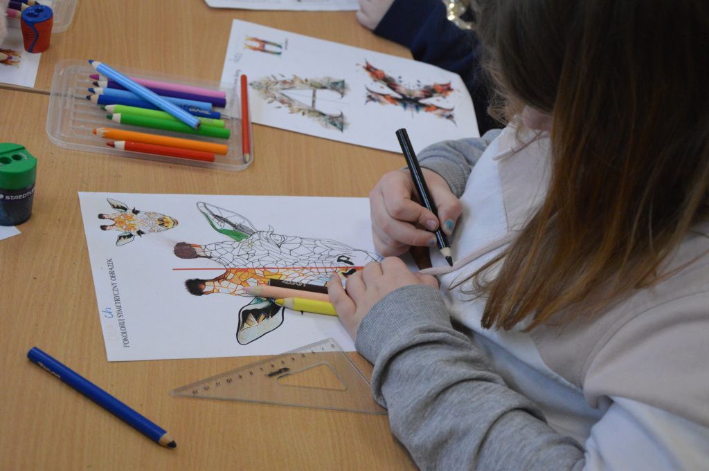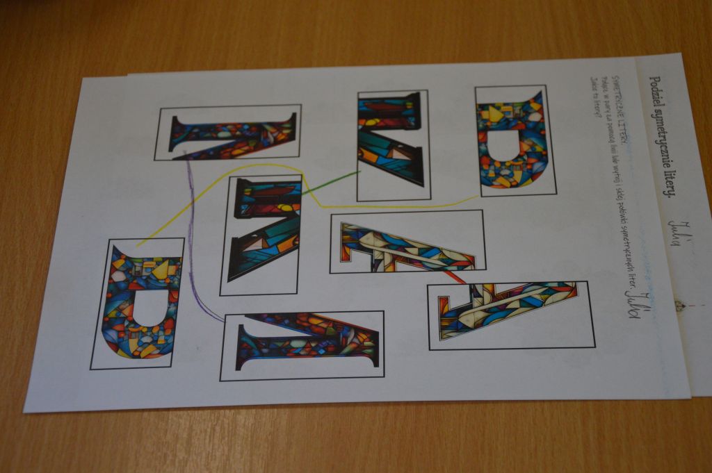 Czym jest symetria? Co to znaczy, że przedmiot ma oś symetrii? Jak stworzyć symetryczny obraz? Na te pytania odpowiadaliśmy podczas ostatnich zajęć. Wykonaliśmy mnóstwo ćwiczeń z kilku kart pracy, aby nabrać wprawy w rozpoznawaniu i wyznaczaniu osi symetrii. Czekało nas też kolorowe, ale i chyba najtrudniejsze zadanie – pomalowanie drugiej części litery alfabetu i zwierzęcia, zgodnie ze wzorem.