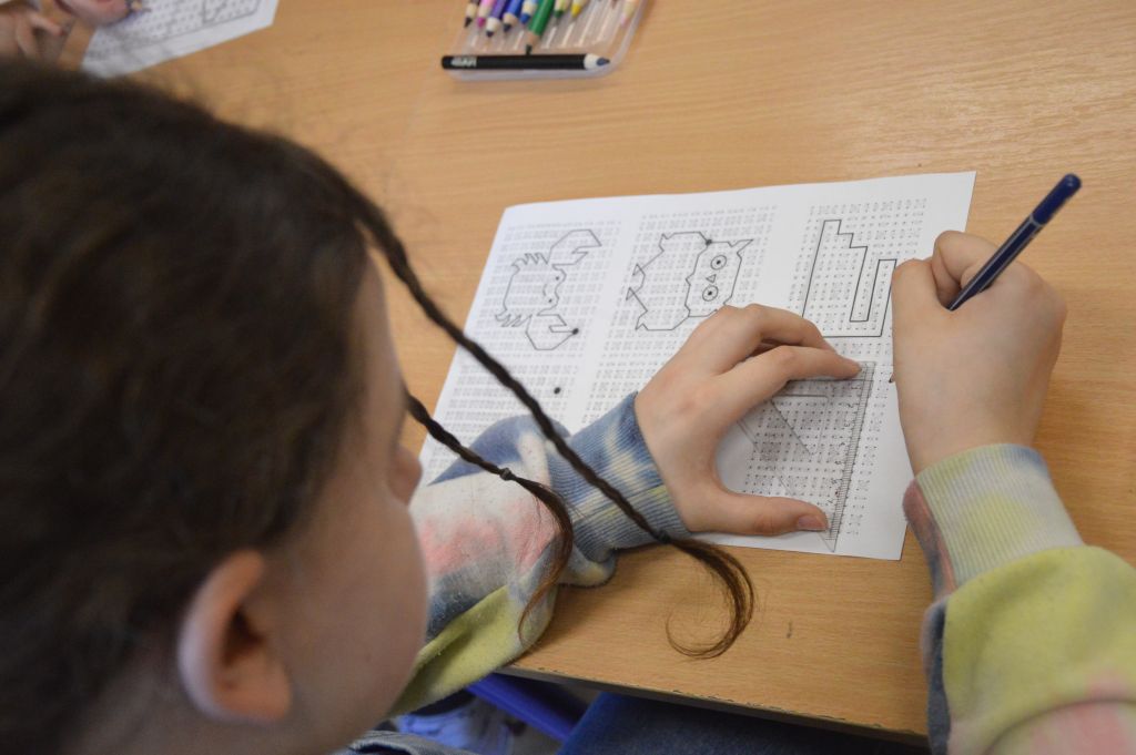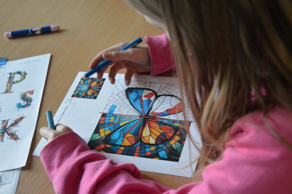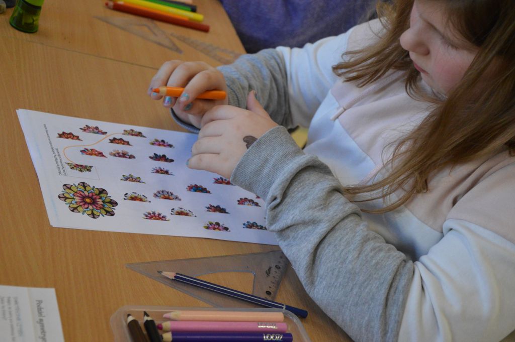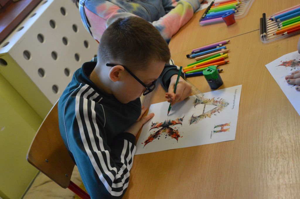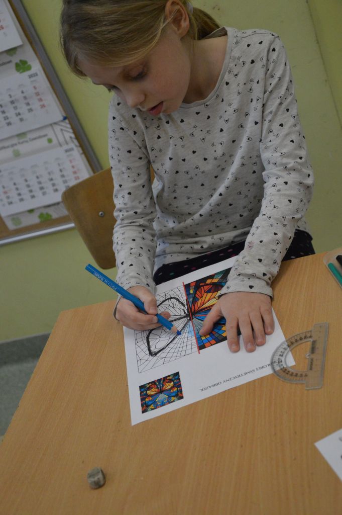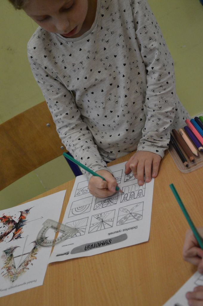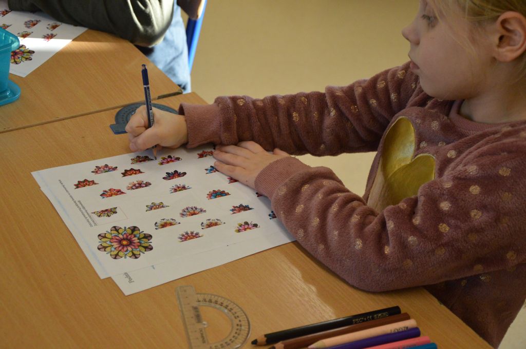Czym jest symetria? Co to znaczy, że przedmiot ma oś symetrii? Jak stworzyć symetryczny obraz? Na te pytania odpowiadaliśmy podczas ostatnich zajęć. Wykonaliśmy mnóstwo ćwiczeń z kilku kart pracy, aby nabrać wprawy w rozpoznawaniu i wyznaczaniu osi symetrii. Czekało nas też kolorowe, ale i chyba najtrudniejsze zadanie – pomalowanie drugiej części litery alfabetu i zwierzęcia, zgodnie ze wzorem.